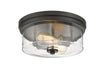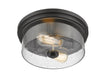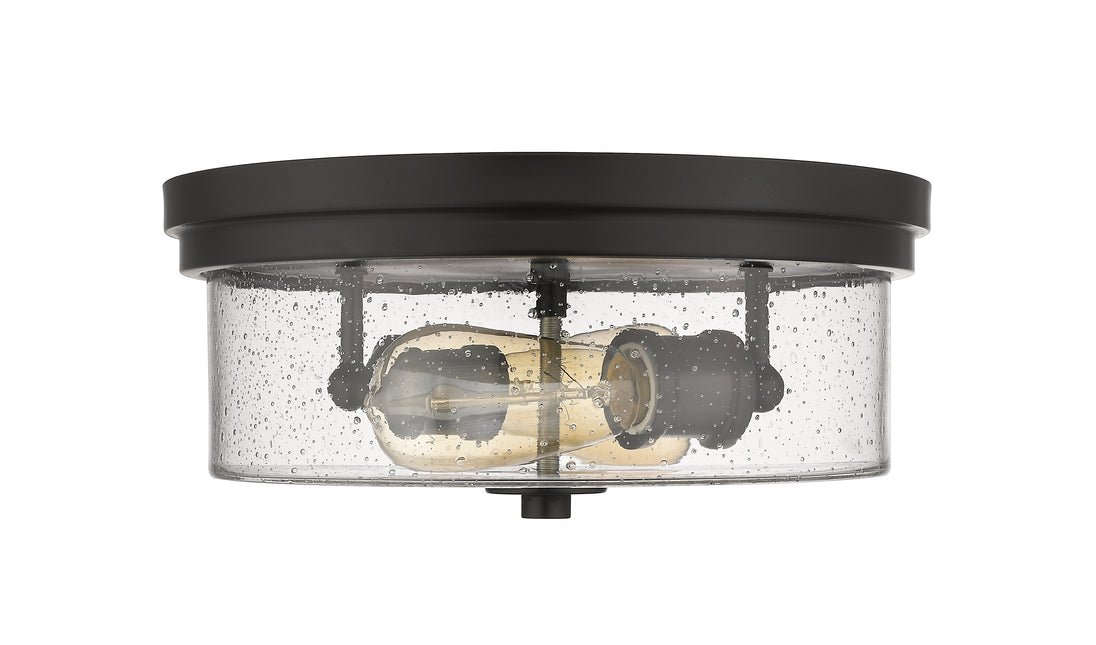 An artful blend of matte black finish steel and clear seedy glass creates a compelling look for both contemporary and transitional spaces. With classic Art Deco appeal, this two-light flush mount ceiling light delivers the perfect motif compromise and weaves into a tasteful overall design scheme.