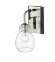 Designed with dual-tone hues, this one-light wall sconce marries matte black and brushed nickel hues. A clear glass shade is full of elegant details, creating a bright glow.