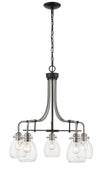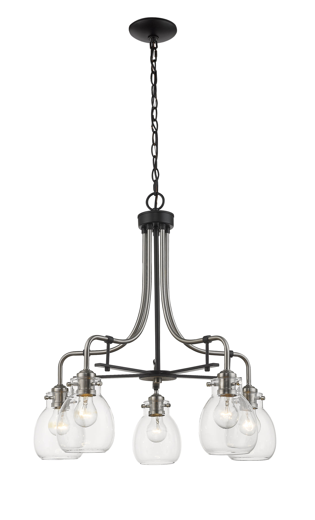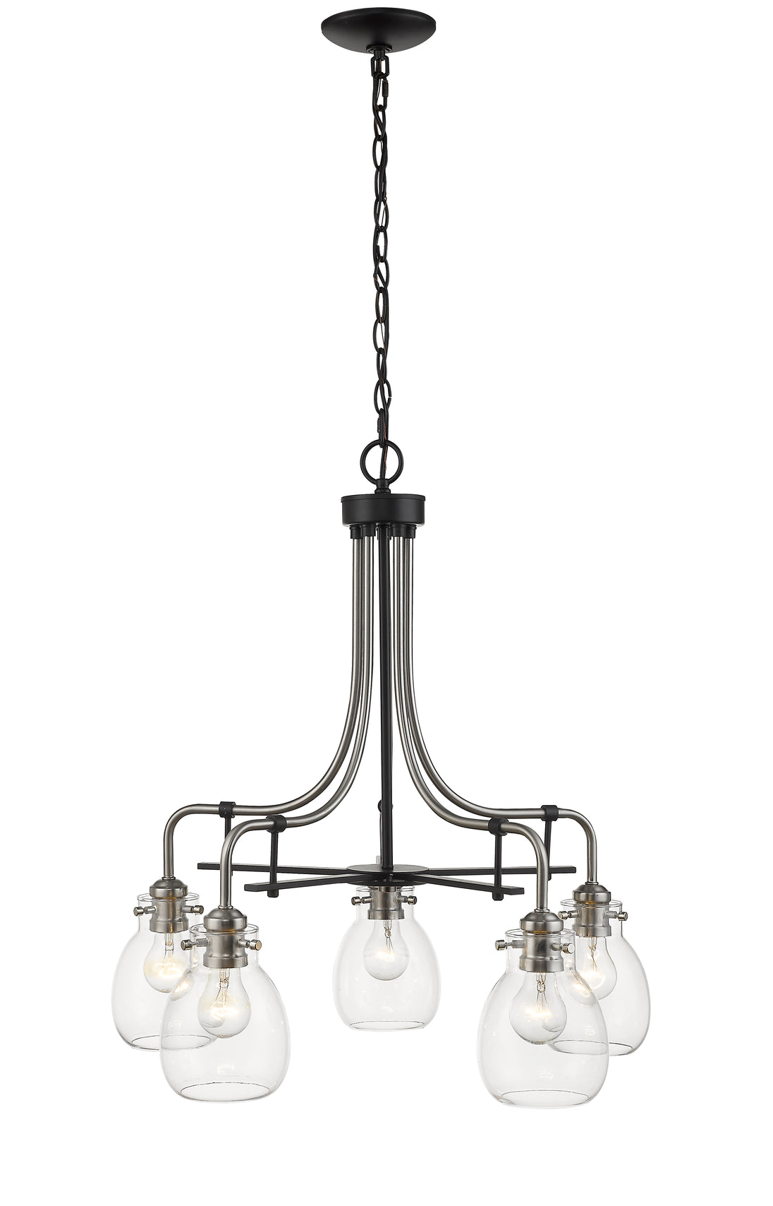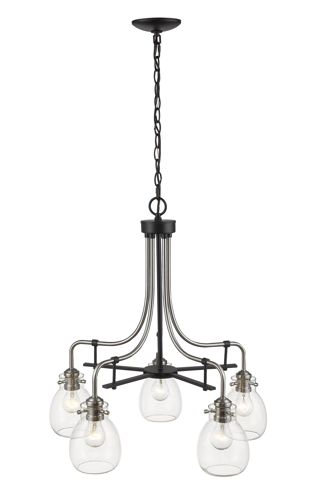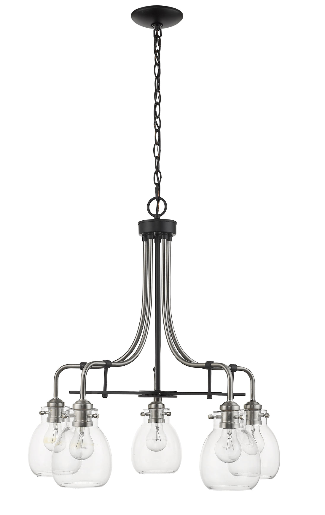 Elevate the sleek romance of a living room with the charming curves from this five-light metal chandelier. Clear glass shades beam brightly over the radiant brushed nickel finish, elevated with matte black.