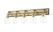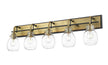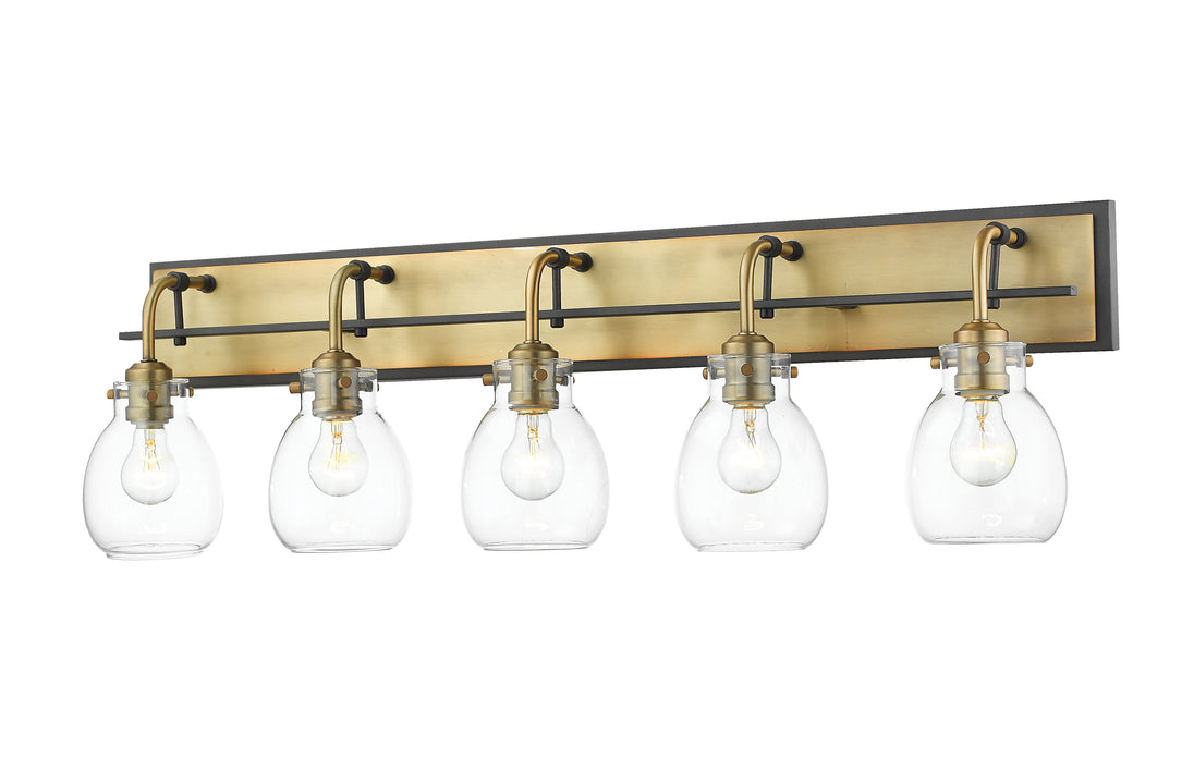 Dramatic elegance proves captivating in a transitional master or guest bath suite. This five-light bath light blends olde brass and matte black in a rectangular frame hosting five delicate clear glass shades.