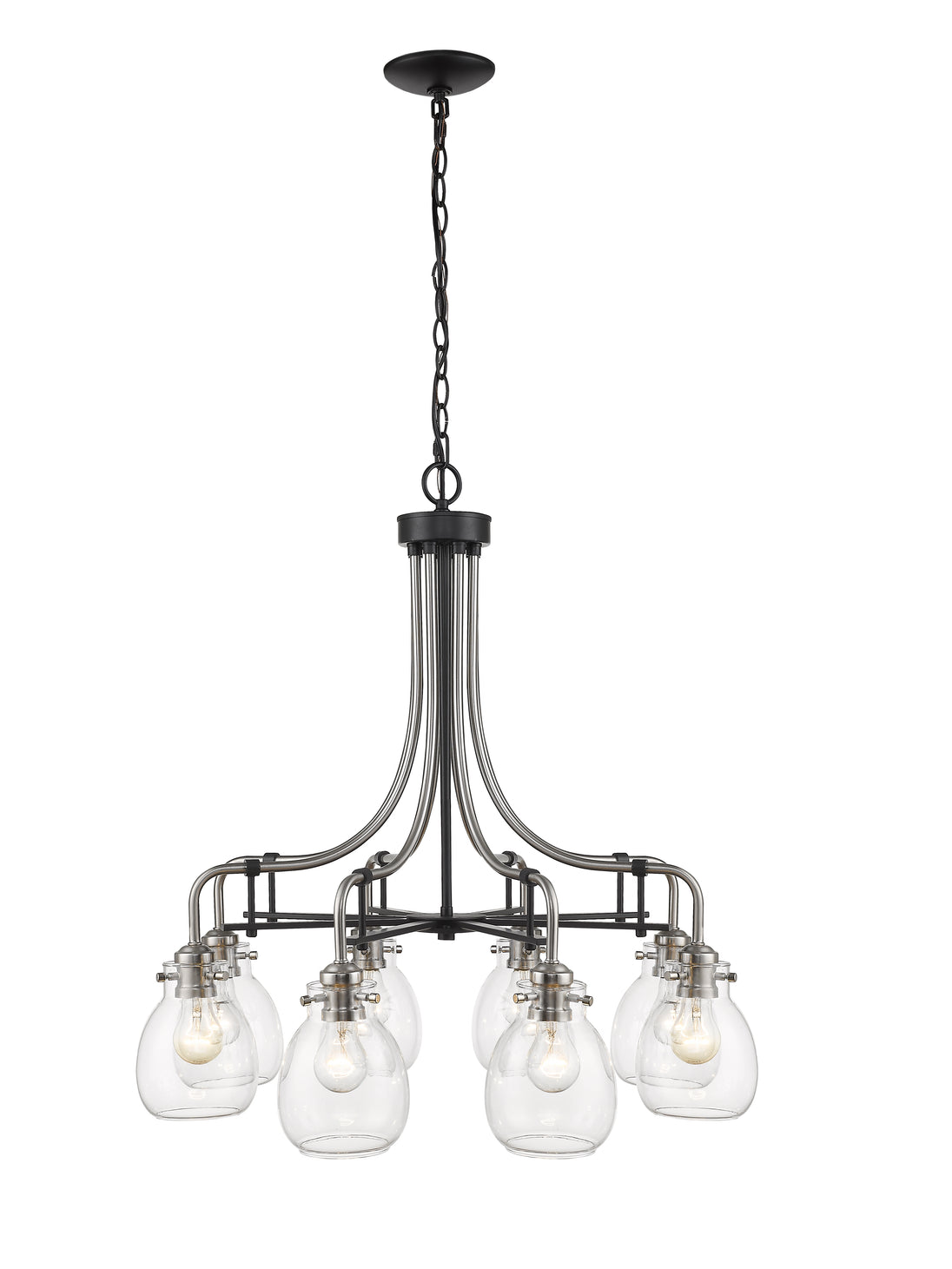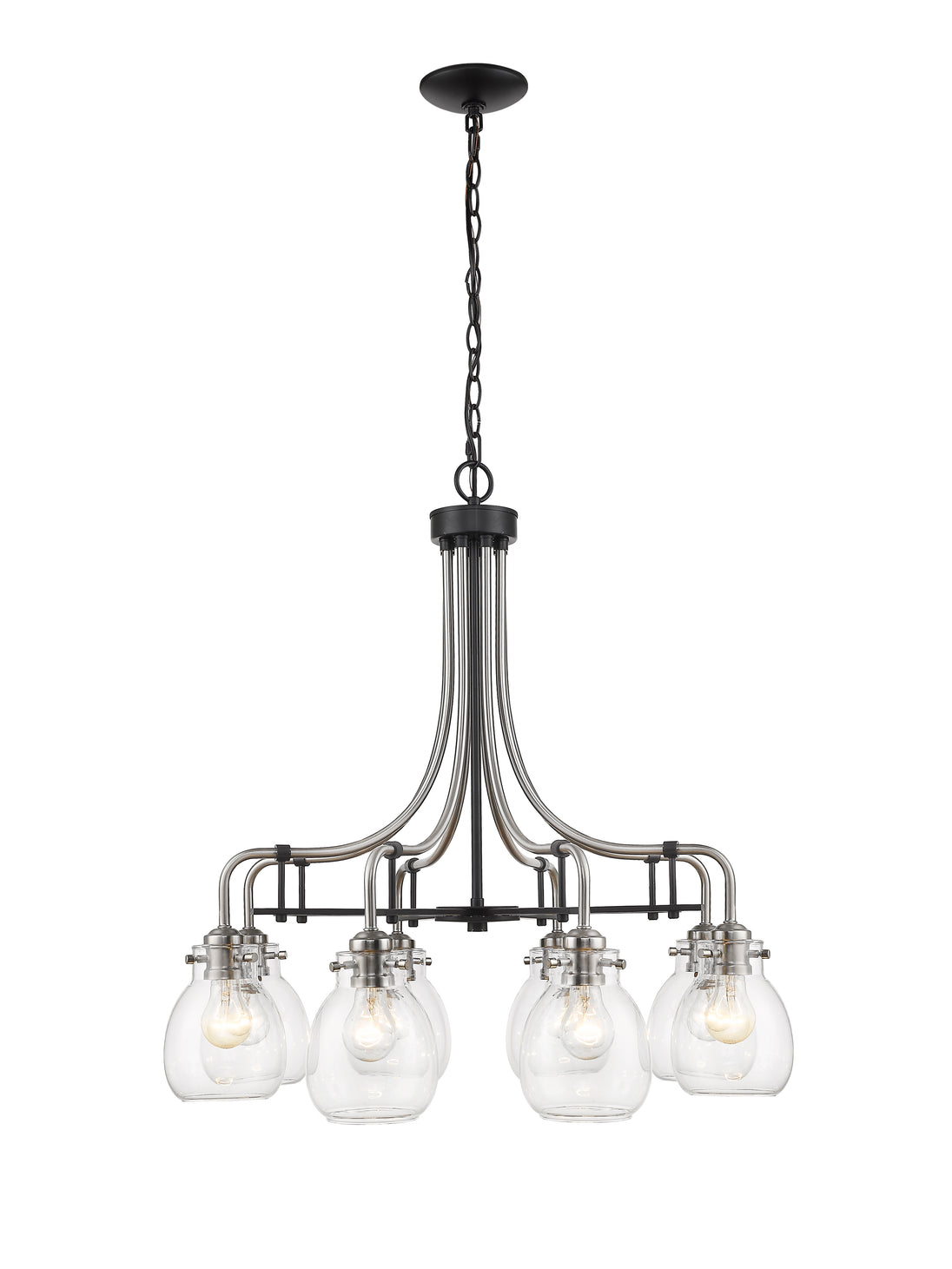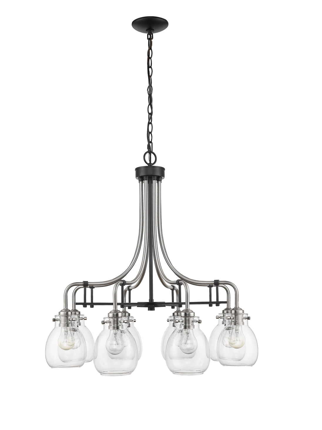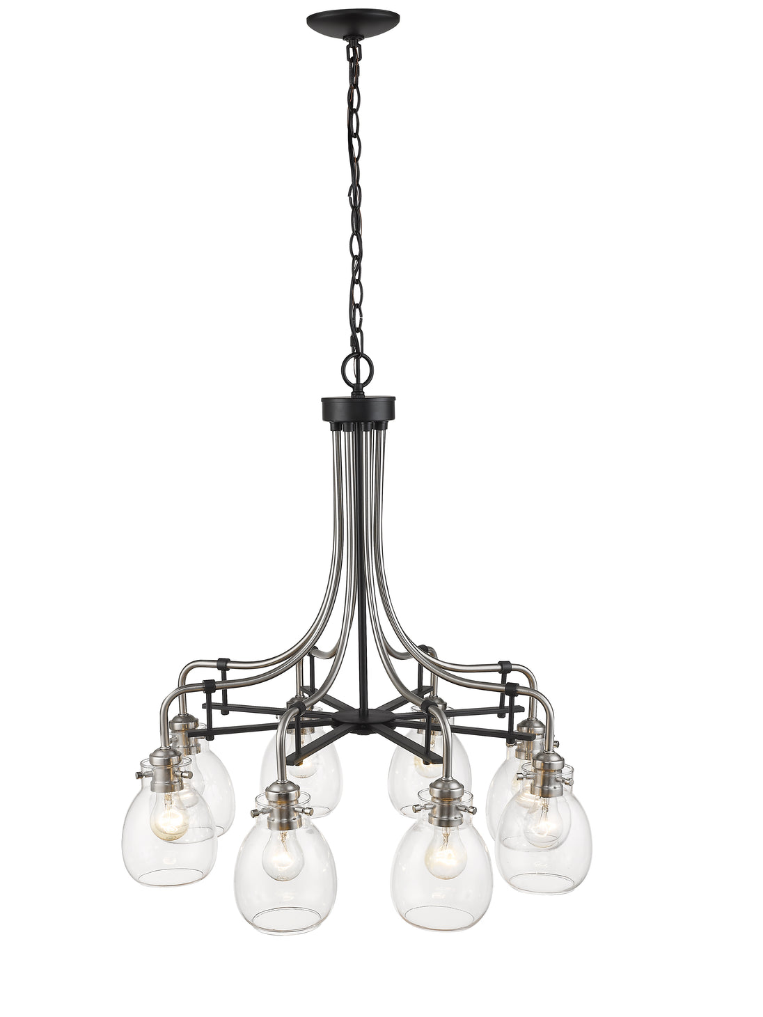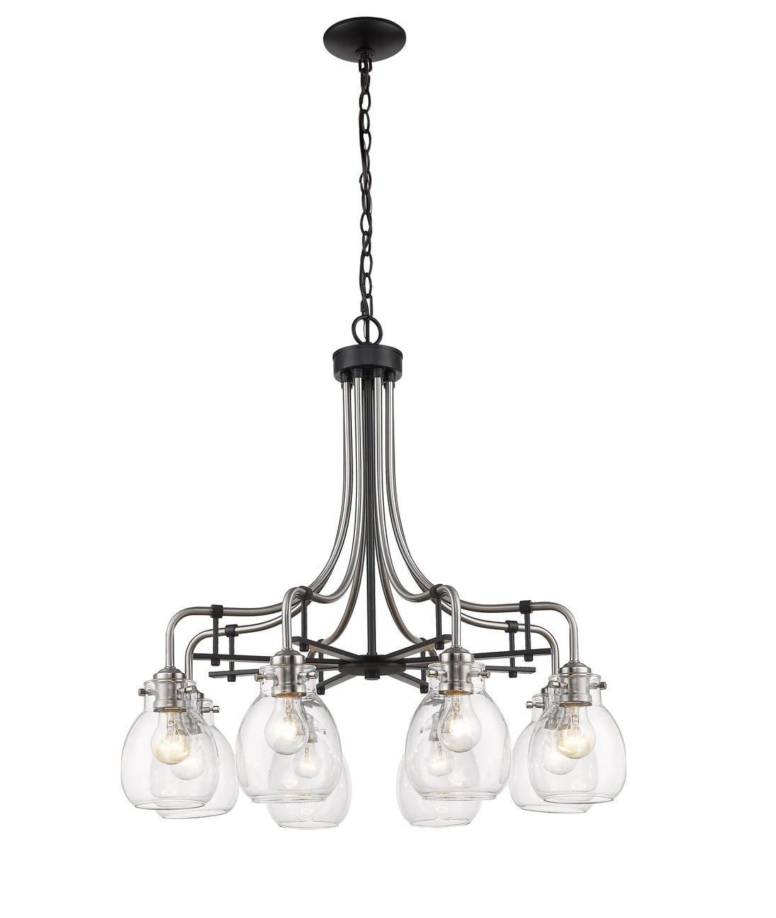 Beautifully fluid design elements soften the industrial vibe of this eight-light round chandelier. Covet a versatile dual finish frame in matte black and brushed nickel, and carefully arranged shades made from delicate clear glass.