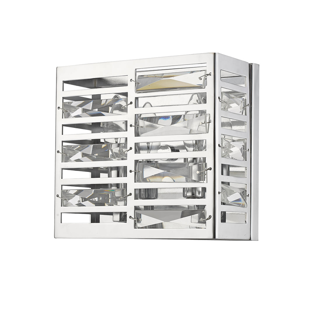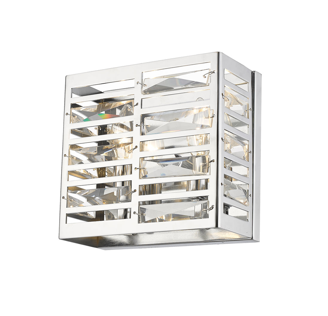 Clean lines from the square silhouette of this two-light wall sconce look stunning when paired with a modern motif. Geometric cut out shapes elevate the beaming chrome finish.