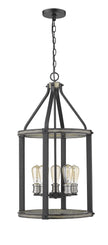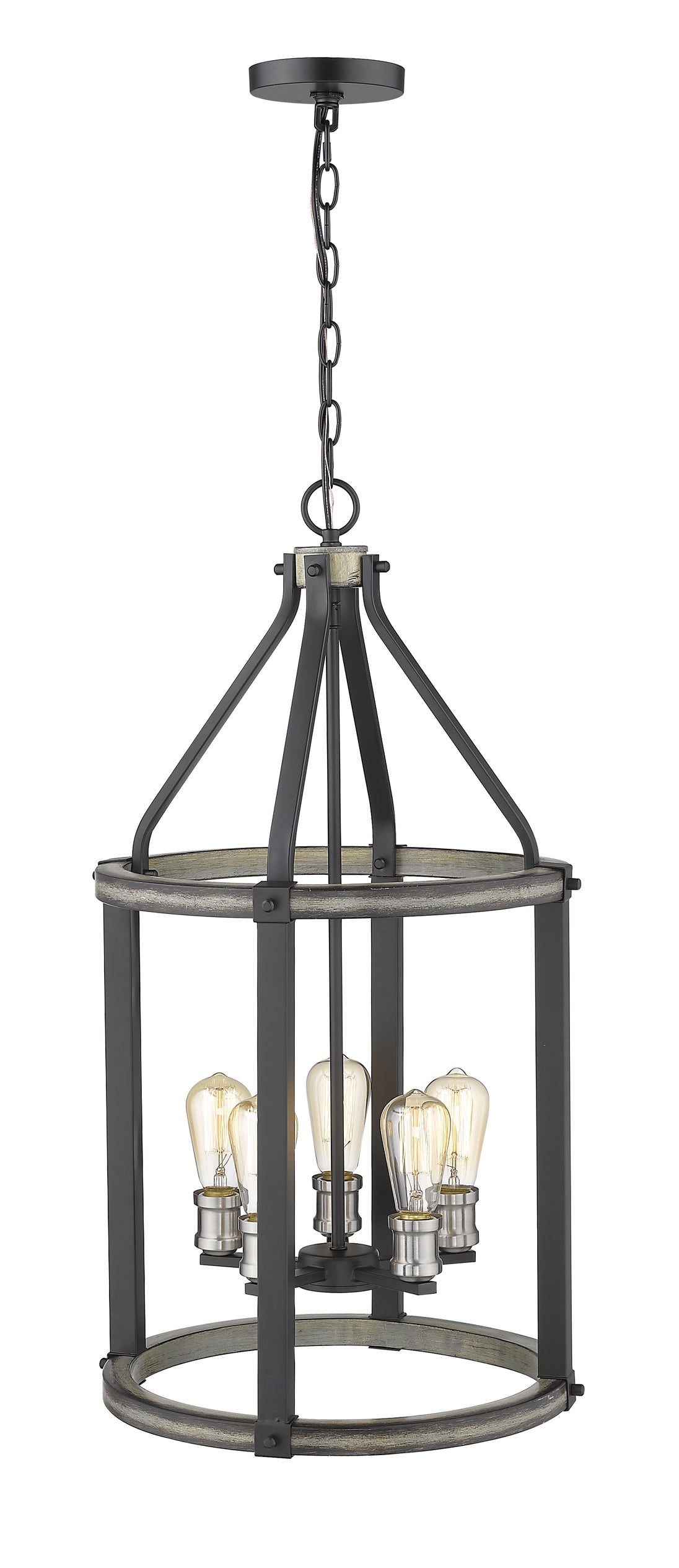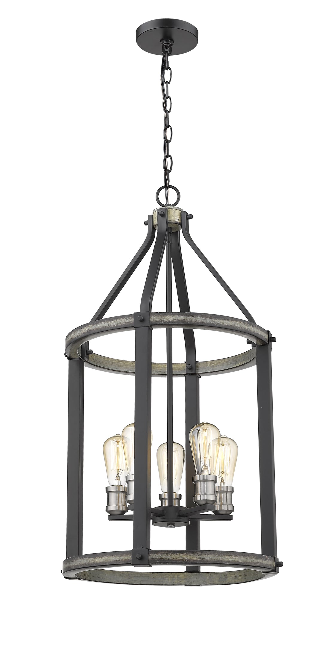 Cool tones from an ashen faux barnboard design set this five-light pendant light apart from the rest. Suspended in a cage-like frame, a ring of exposed lightbulbs shines brightness over any modern industrial motif.