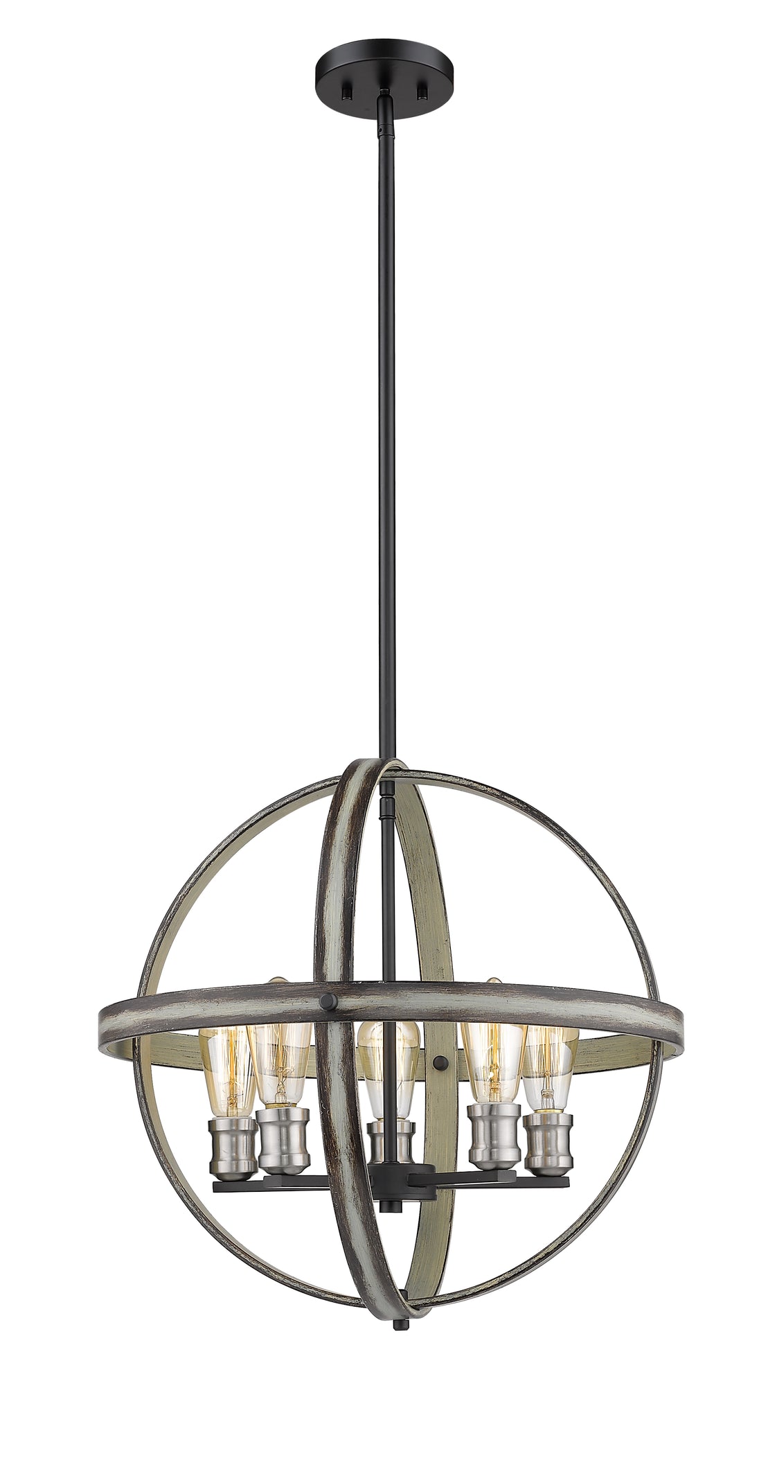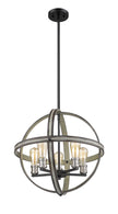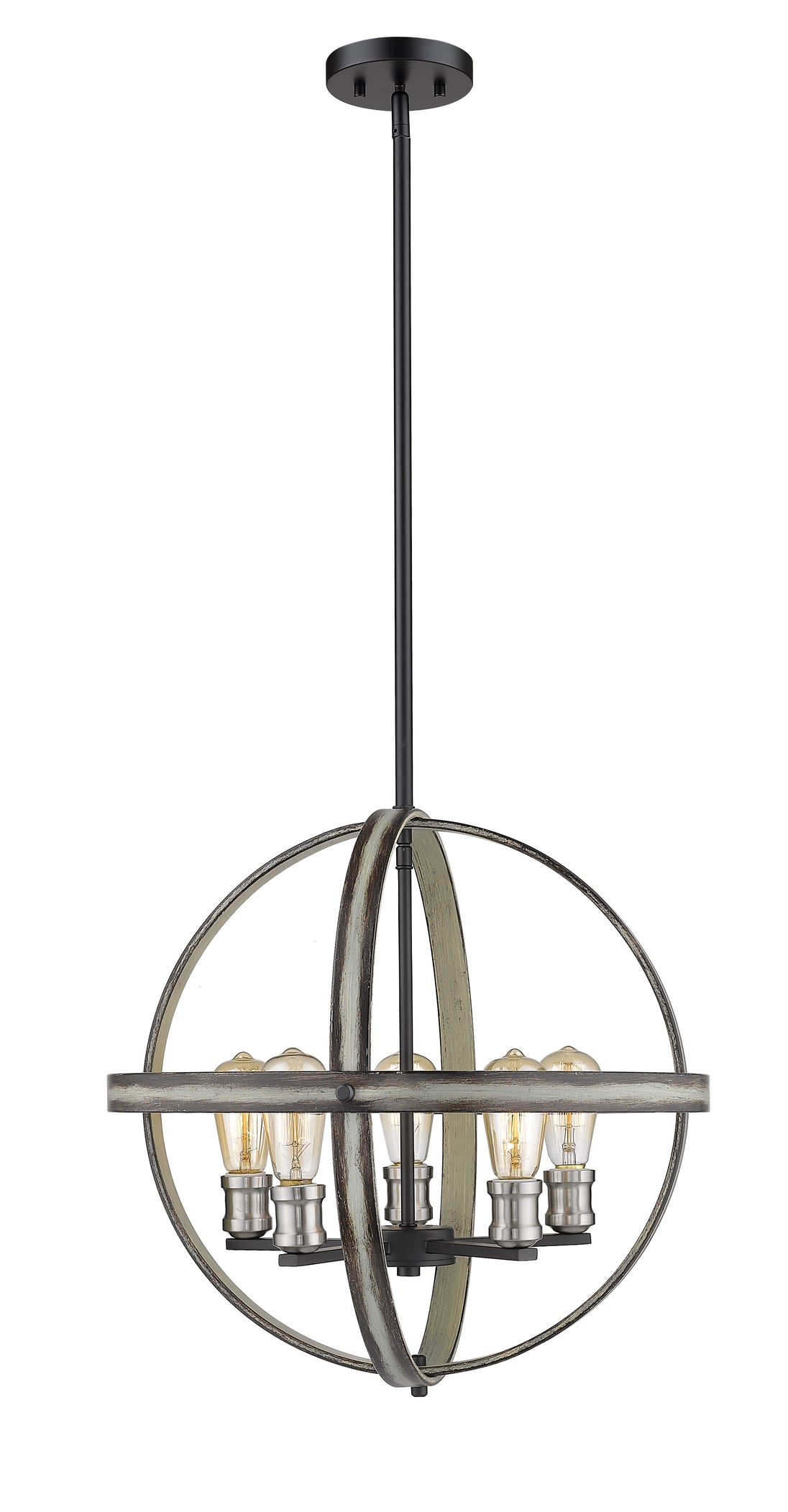 Full of industrial charm, this five-light pendant light brightens up entryways and living rooms. With an open geometric frame constructed of faux barnwood, the sleek silhouette highlights exposed lightbulbs along a distressed ashen hue.