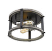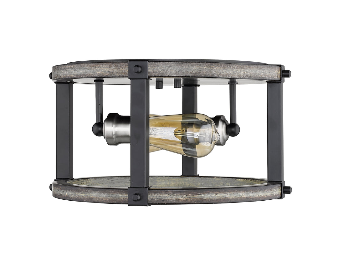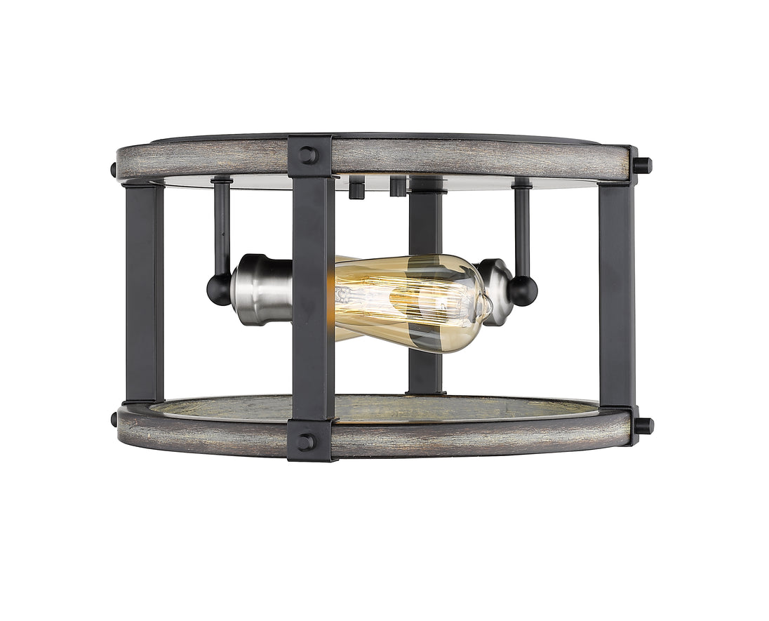 Rustic ashen creates a warm, farmhouse-style finish to the frame of this round two-light ceiling light. Crafted from faux barnwood, it brings a casual feel with upscale design elements, and illuminates sleek style and soft lighting in a transitional space.