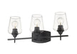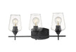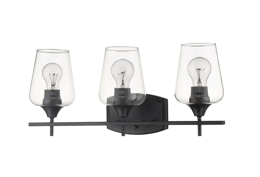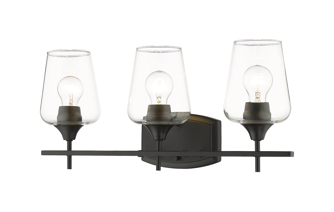Upscale sophistication with a Mid Century Modern vibe tells the story of this elegant three-light vanity light. A blend of delightful materials offers stunning large glass shades with Matte Black finish metal, delivering a dramatic palette that embellishes the look of any transitional bath space in style.
