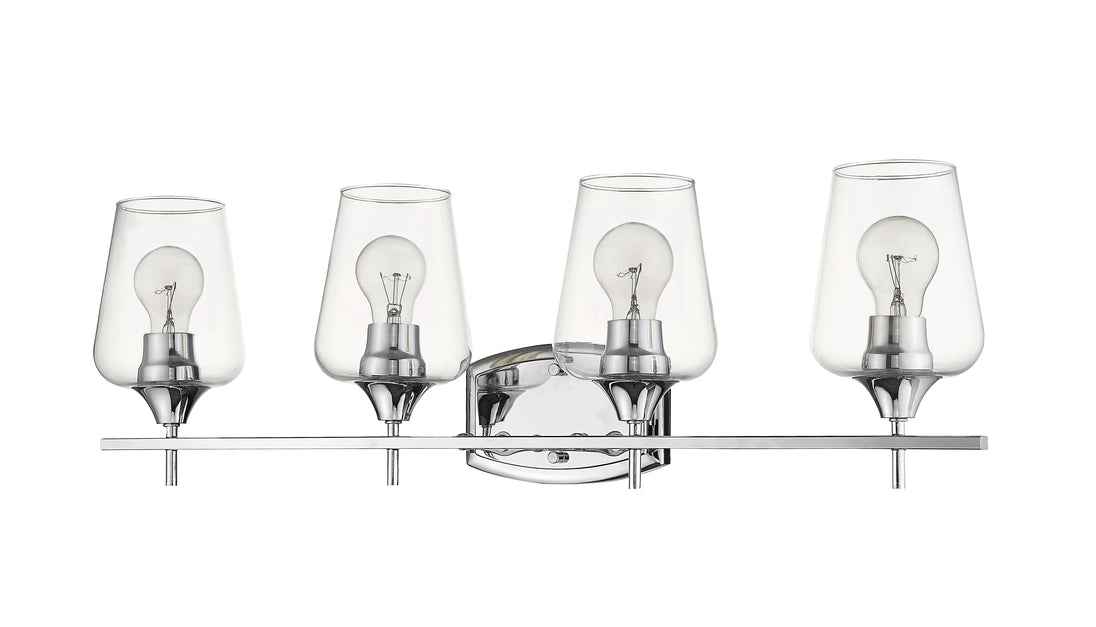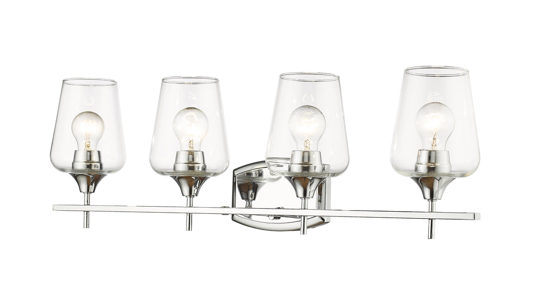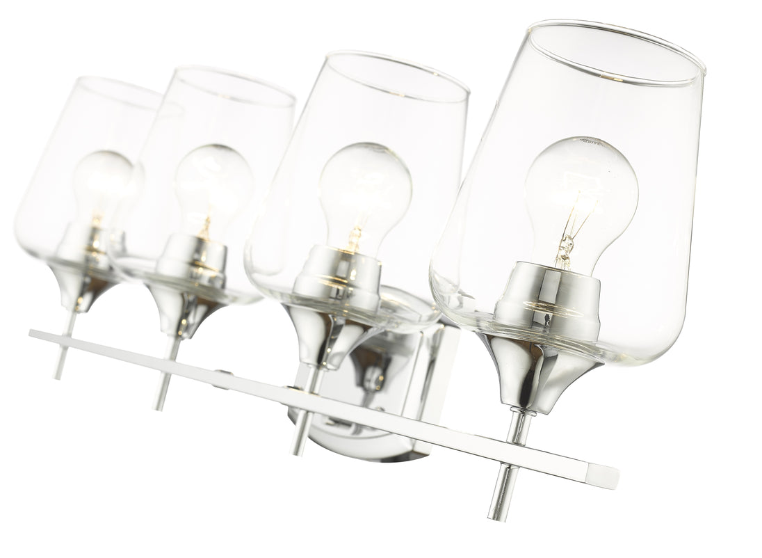 Upscale sophistication with a Mid Century Modern vibe tells the story of this elegant four-light vanity light. A blend of delightful materials offers stunning large glass shades with bright Chrome finish metal, delivering a radiant palette that embellishes the look of a master or guest bath suite.