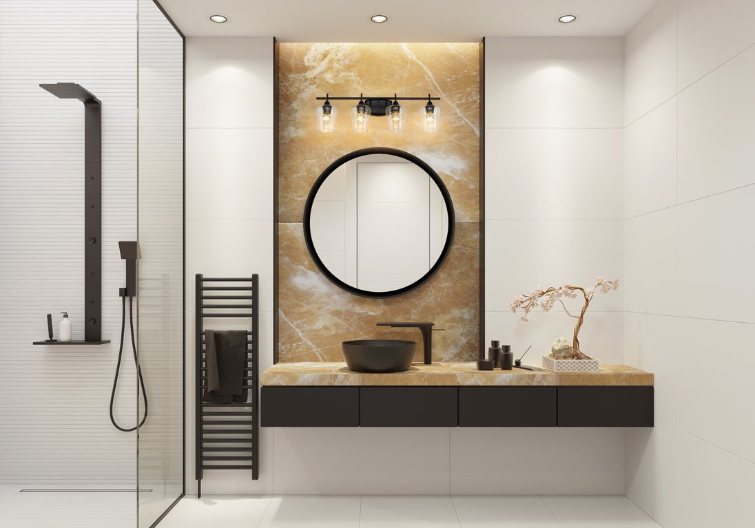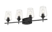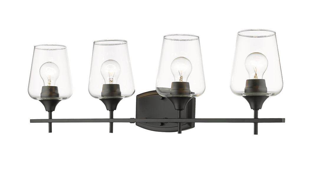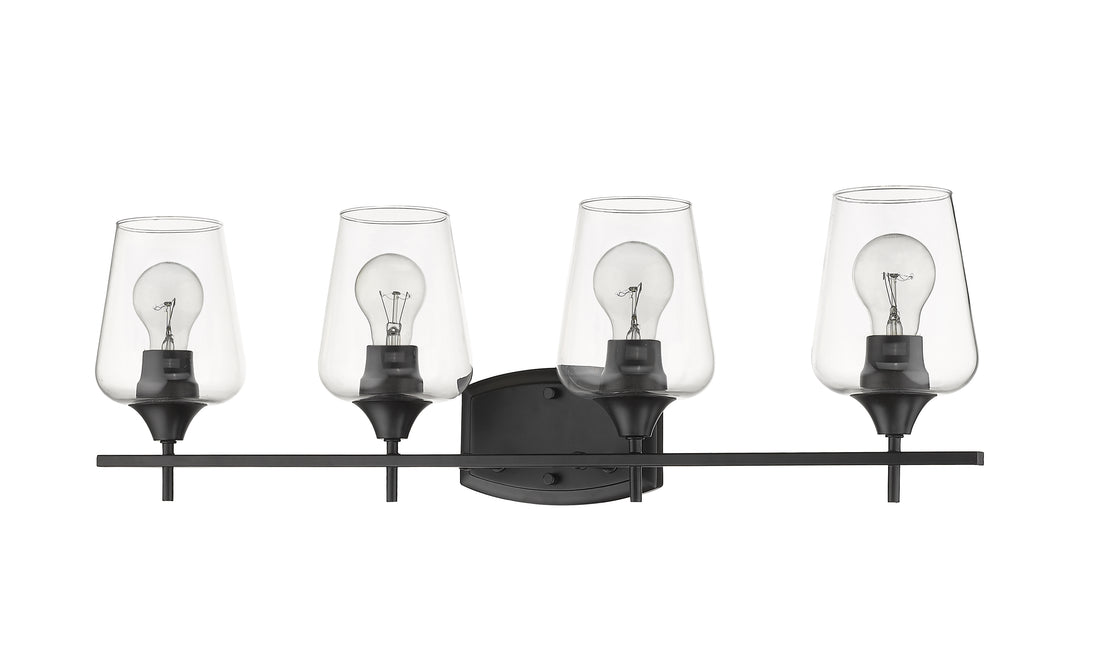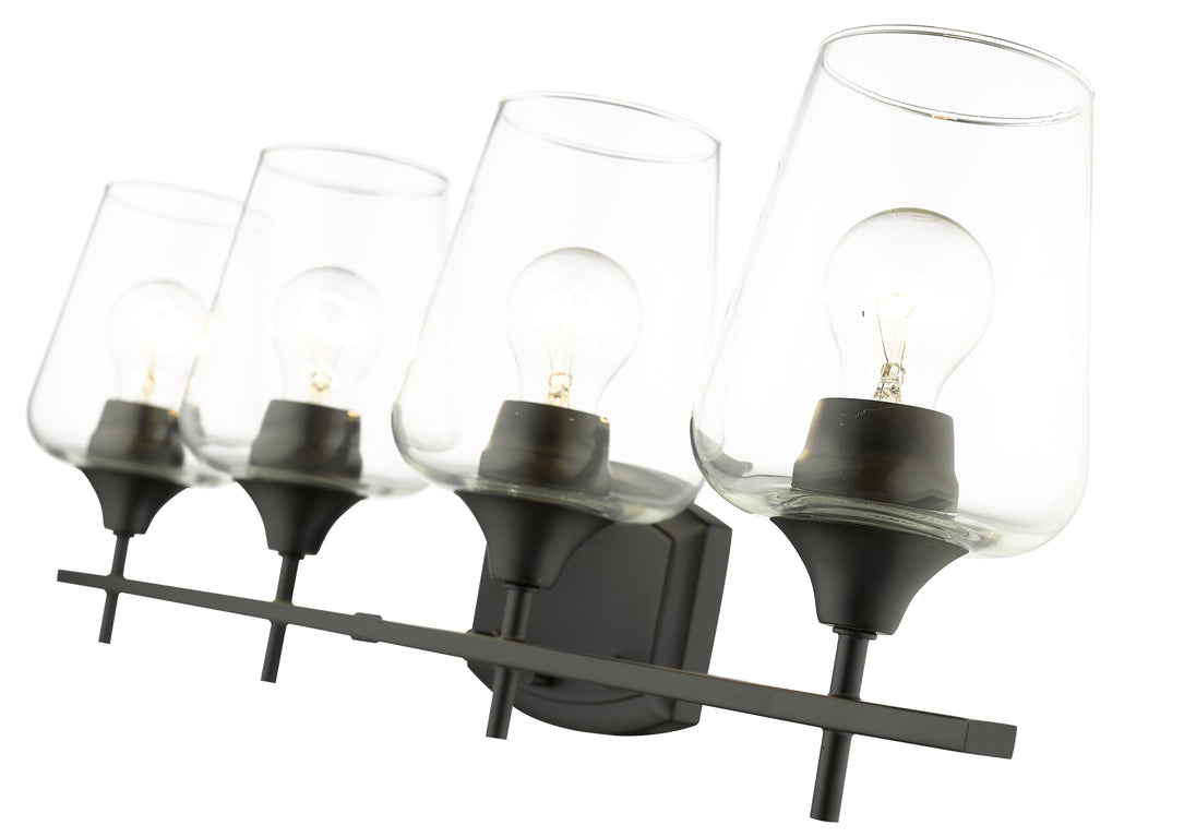 Upscale sophistication with a Mid Century Modern vibe tells the story of this elegant four-light vanity light. A blend of delightful materials offers stunning large glass shades with Matte Black finish metal, punctuating the custom design motif of a master or guest suite.