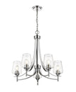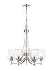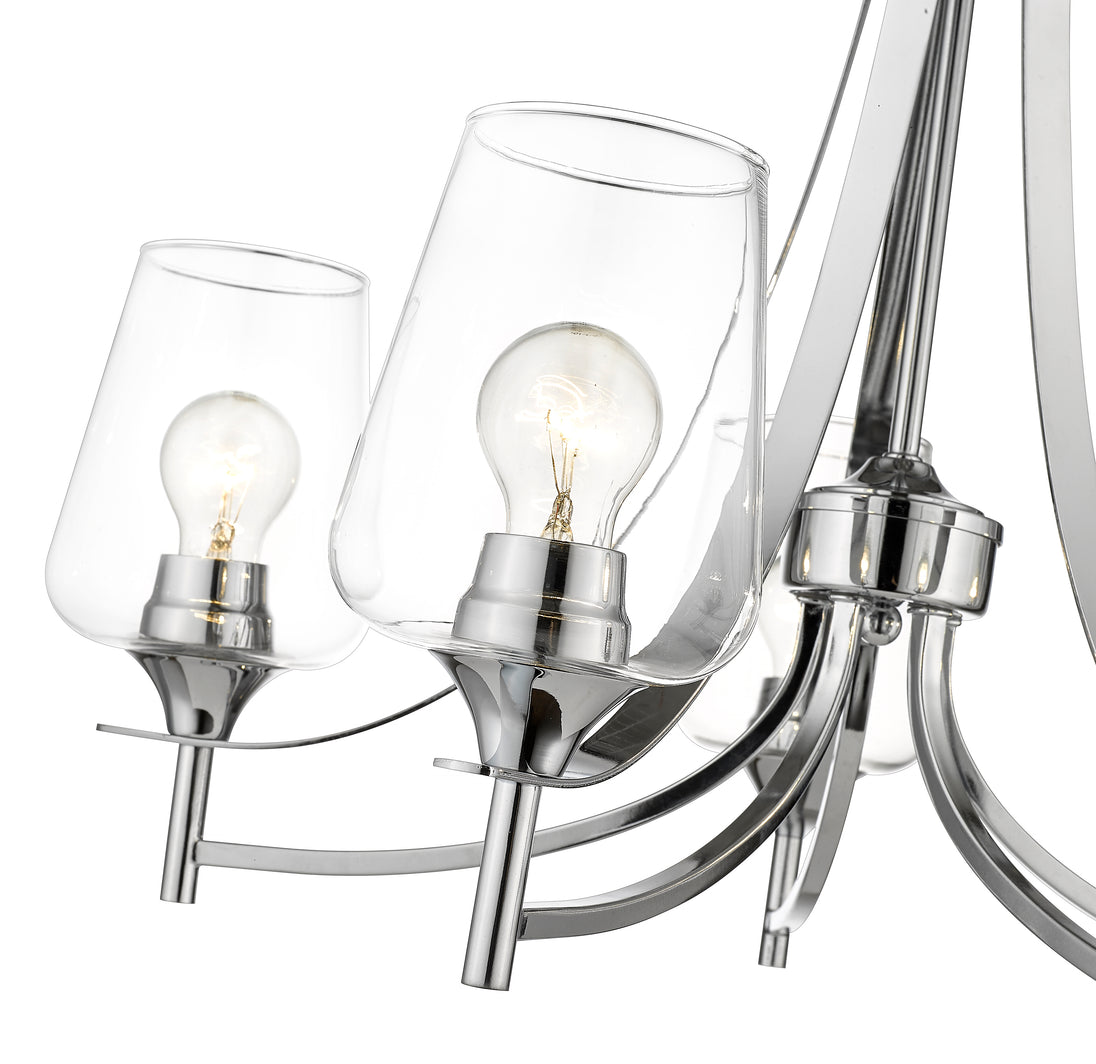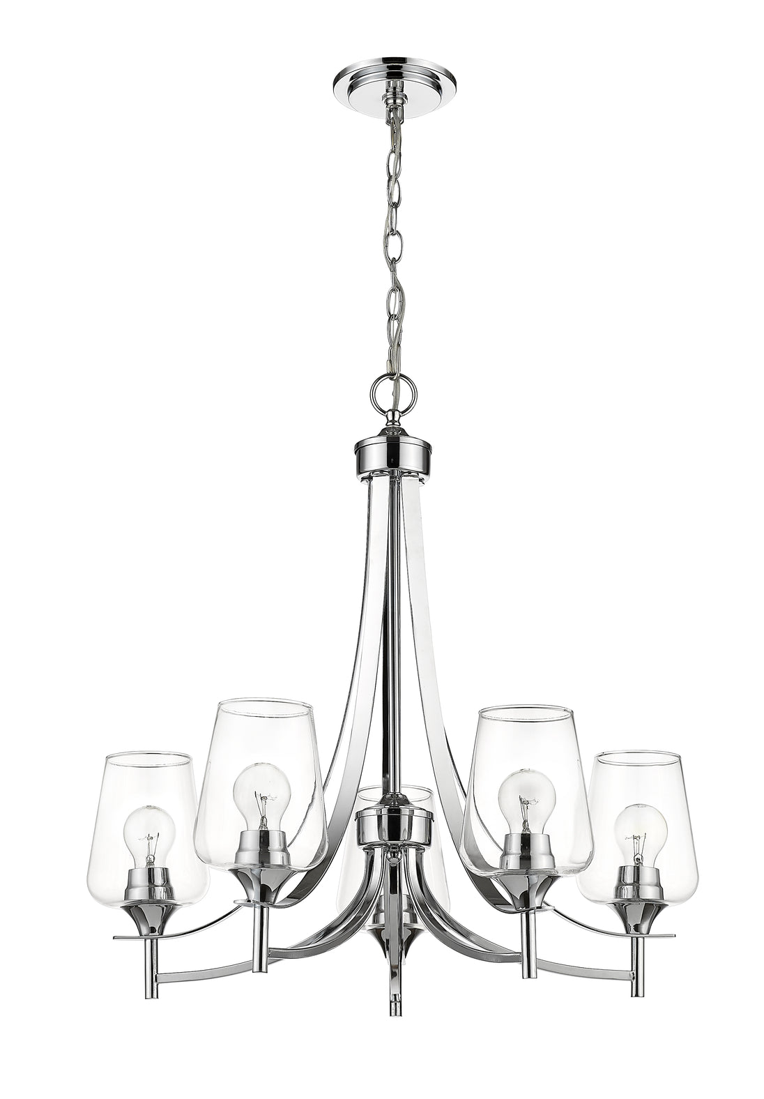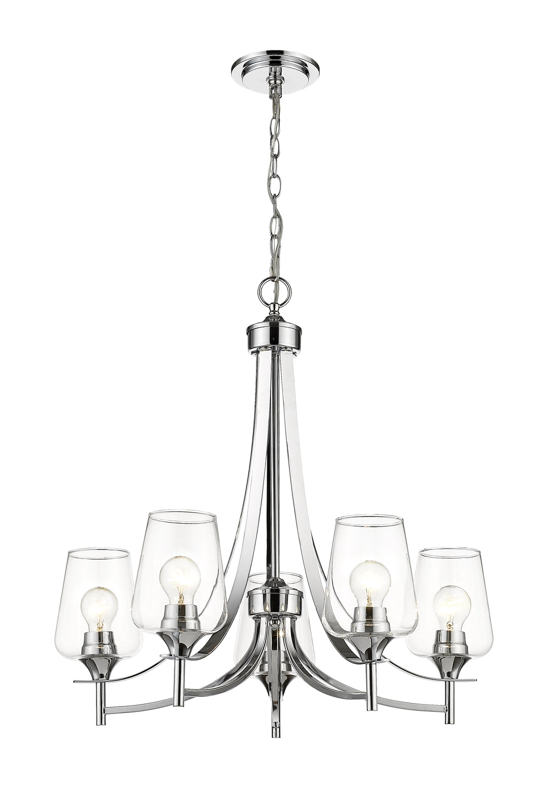 Highlight a sophisticated dining space, kitchen, or living area with this chrome finish steel five-light chandelier from the Joliet collection. A modern vibe employs artisanal design elements in a chandelier featuring a romantic circular frame crafted of chrome finish steel with tastefully flared arms. Five delicate clear glass shades deliver pristine character with upscale, custom style.