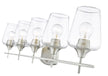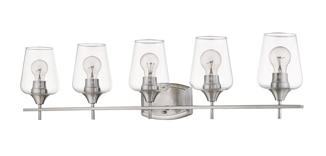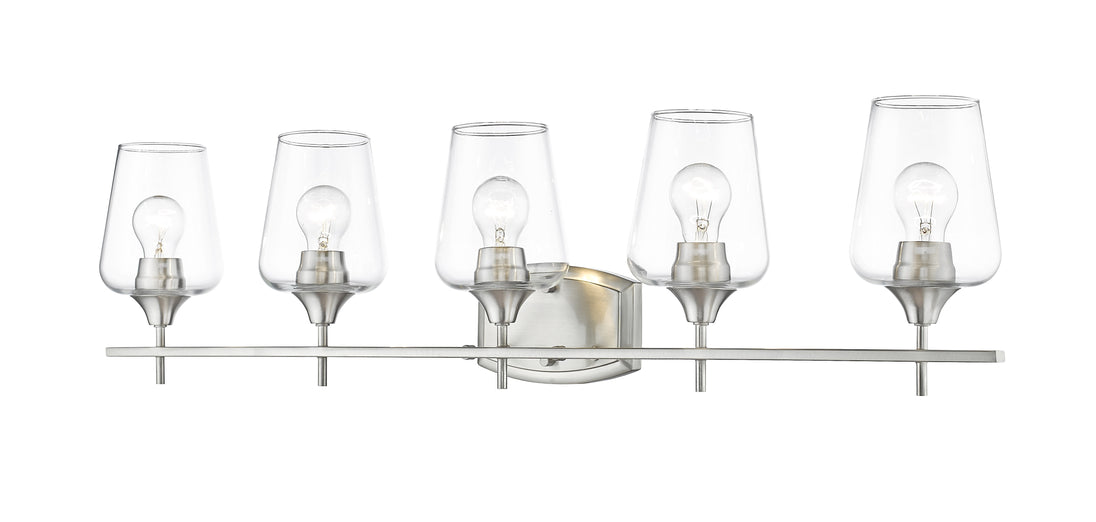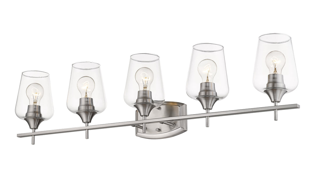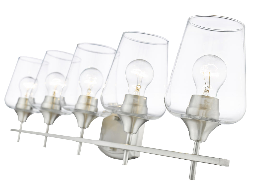 Upscale sophistication with a Mid Century Modern vibe tells the story of this elegant five-light vanity light. A blend of delightful materials offers stunning large glass shades with lovely Brushed Nickel finish metal, creating a versatile palette and a tasteful linear silhouette that frames a master bath sink with exquisite style.