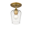 Upscale sophistication with a Mid Century Modern vibe tells the story of this elegant one-light wall flush mount ceiling light. A blend of delightful materials offers a stunning large glass shade with warm Olde Brass finish metal, delivering a delightful aesthetic and targeted lighting in a nook or reading space.