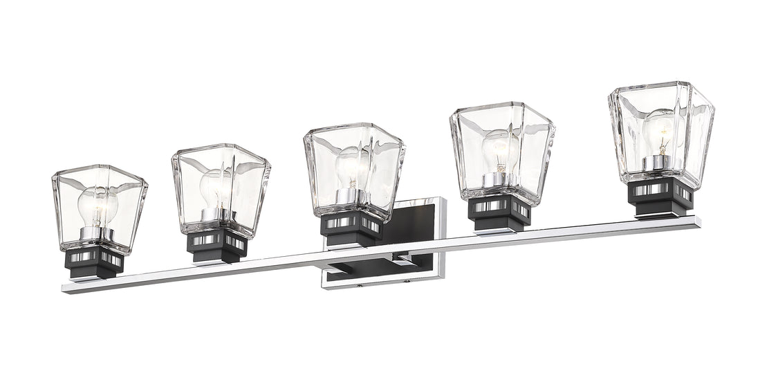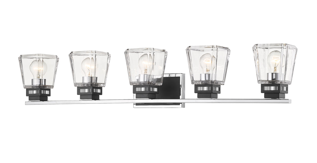 Linear design elements with elegant materials deliver a must-have look for a custom living space. Mid-Century Modern flavor stylizes this five-light vanity light, showcasing thick square glass shades mounted to a brilliant Chrome finish frame with a bold Matte Black surface that coordinates with surrounding bath decor.