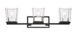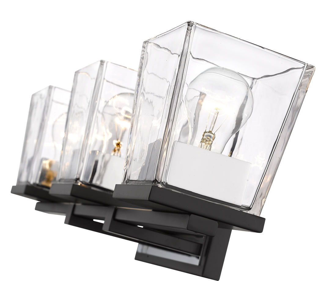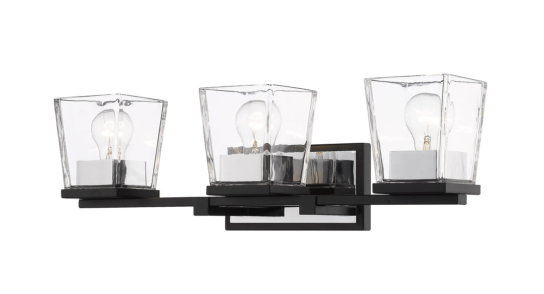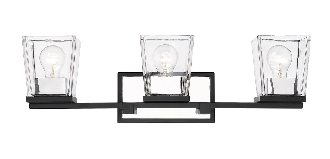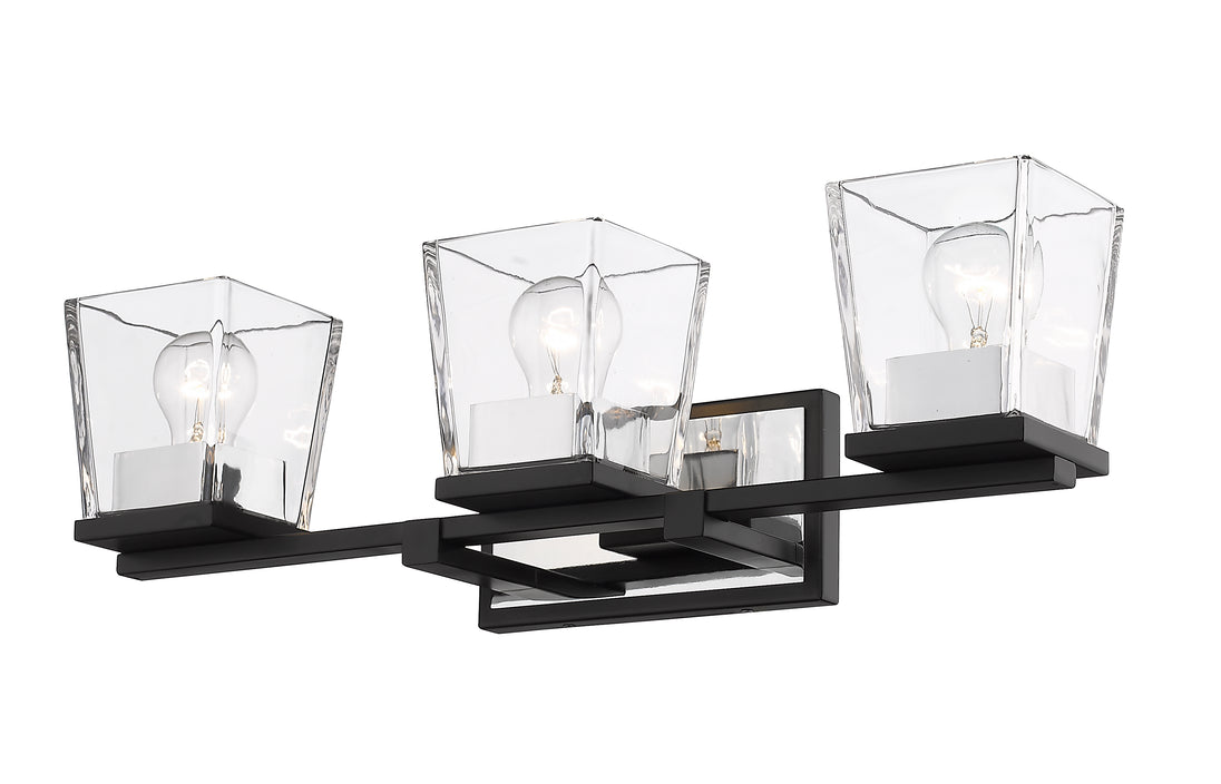 With a sleek cosmopolitan attitude and a beautiful blend of glass and metal, this three-light vanity offers a sophisticated way to stylize a contemporary compact bath space. Matte Black and brilliant Chrome serve as stunning finishes for a tasteful fixture delivering a geometric silhouette that frames compact vanities in style.