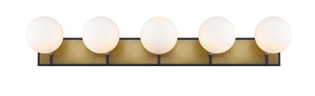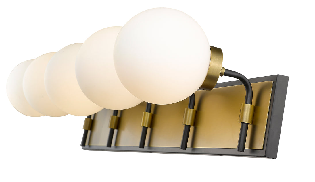 Reinvent the look and feel of your home with this gorgeous five-light vanity. It's crafted with a matte black and olde brass finish and opal shades for a soft warm radiance. Its mix of modern panache and old school lines will be a perfect fit for a master bathroom or powder room.