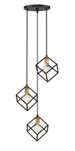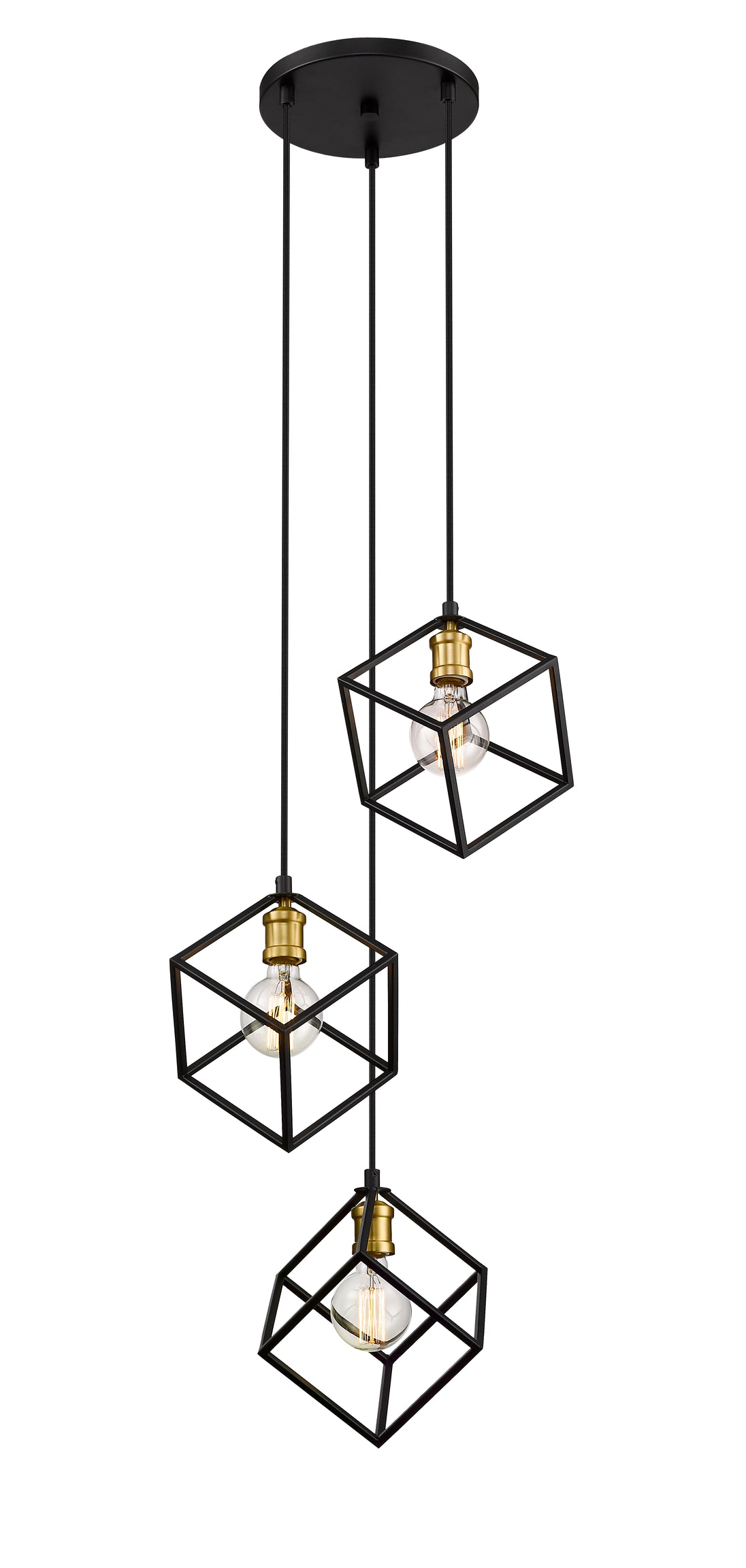 Bold and artistic, the Vertical Pendant makes a striking focal point in any modern or eclectic space. A series of steel, open-framed cubes are suspended at various lengths from braded black cords. Available in several eye-catching options. Finishes include black frame with brass accent, or black frame with brushed nickel accent.