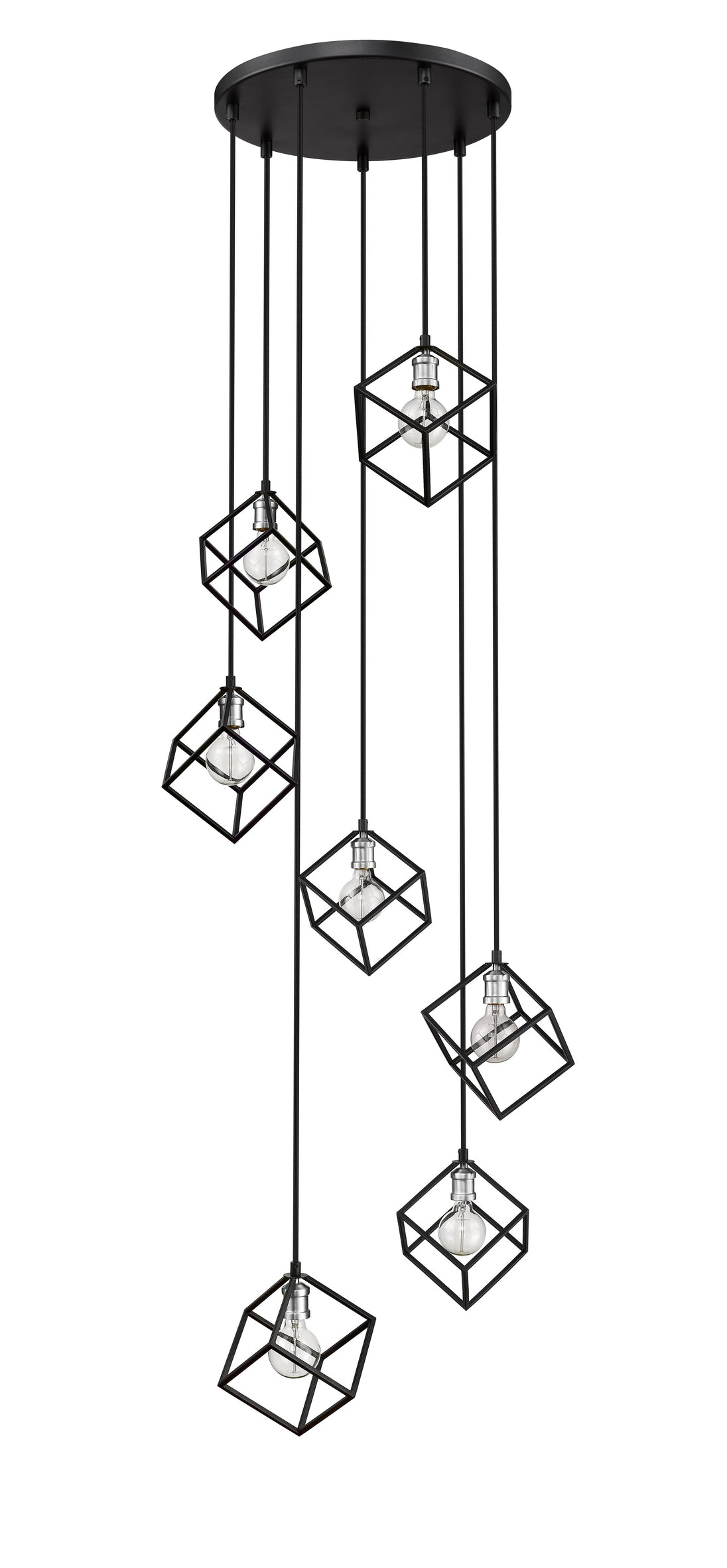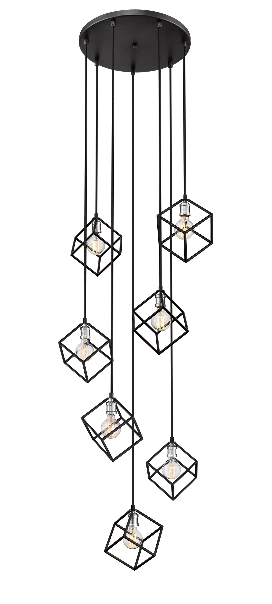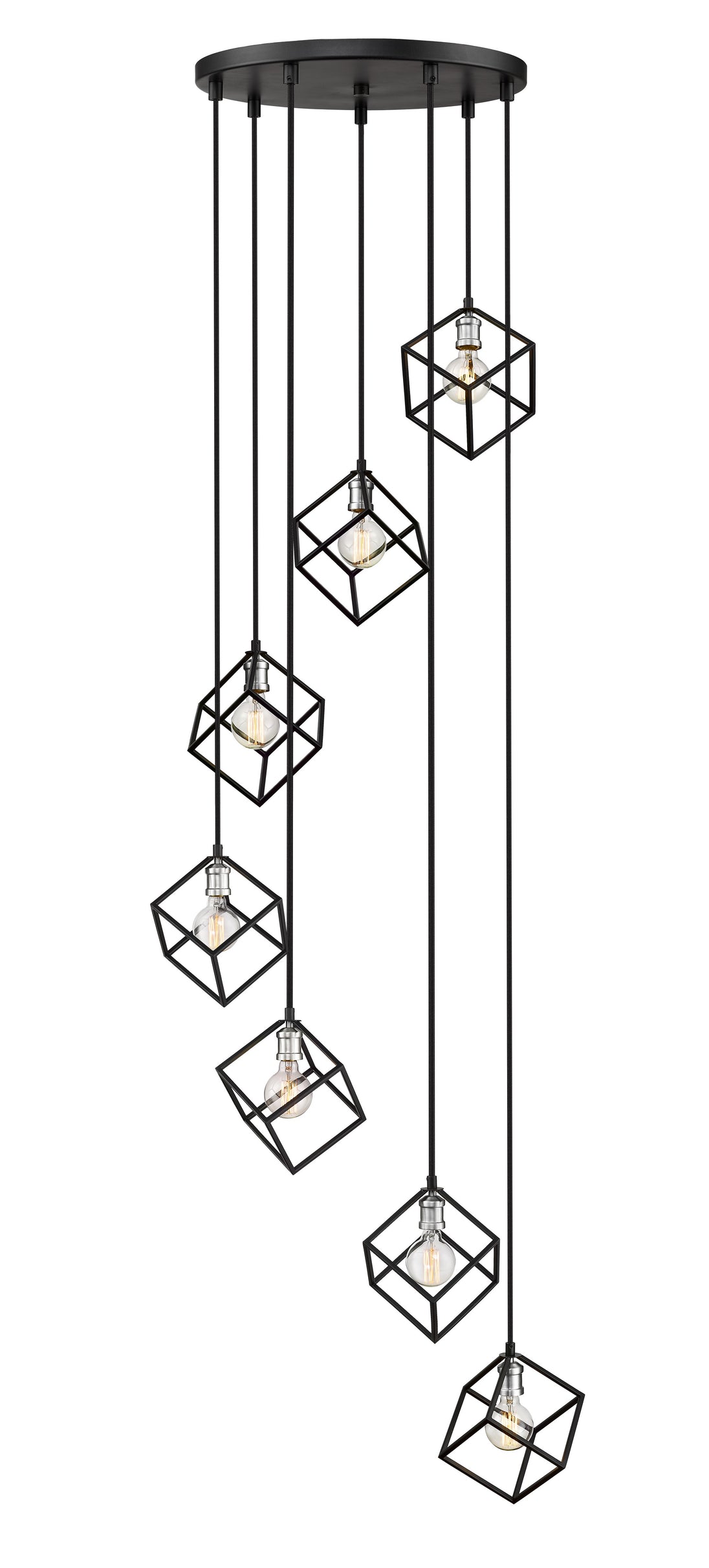 Energize the look and feel of your favorite room with this two-tone seven-light pendant. It features a matte black and brushed nickel finish with cube-shaped shades hanging at different heights for a dynamic look and feel that you'll love. It's the perfect addition to any dining room, foyer, living room, or entertainment room.