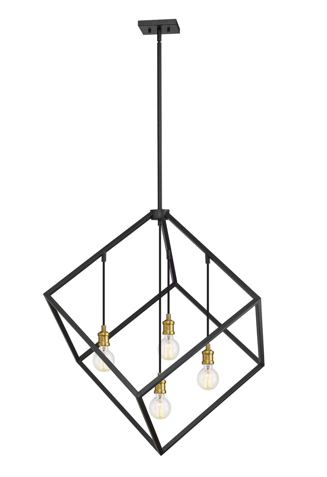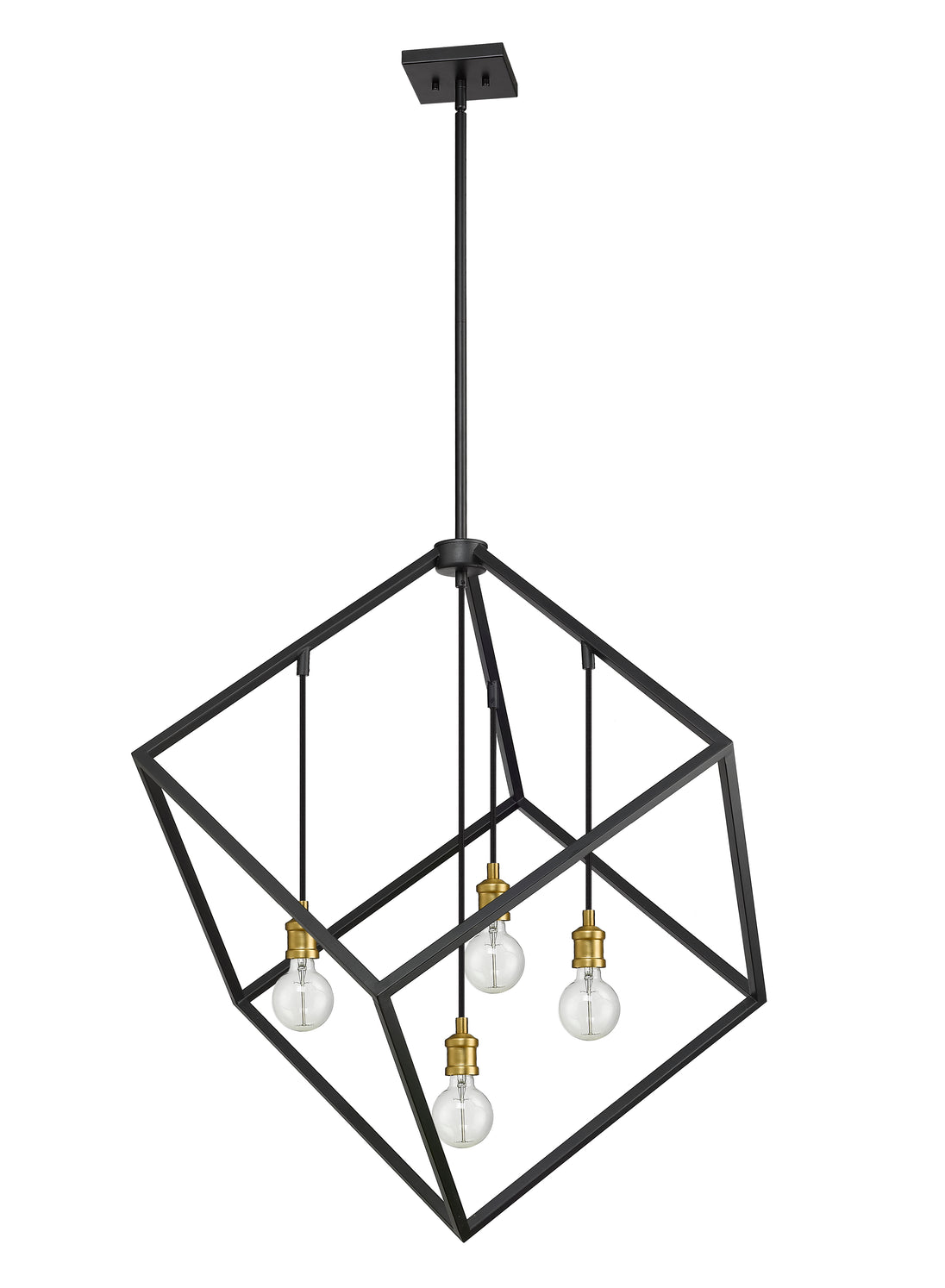 Enjoy the modern edge that this large two-tone four-light pendant adds to your home. It features a bronze and olde brass finish with the lights inside a single large cube-shaped shade for a dynamic look that energizes any space. It's a vibrant light designed to transform any dining room, hallway, bedroom, or kitchen.