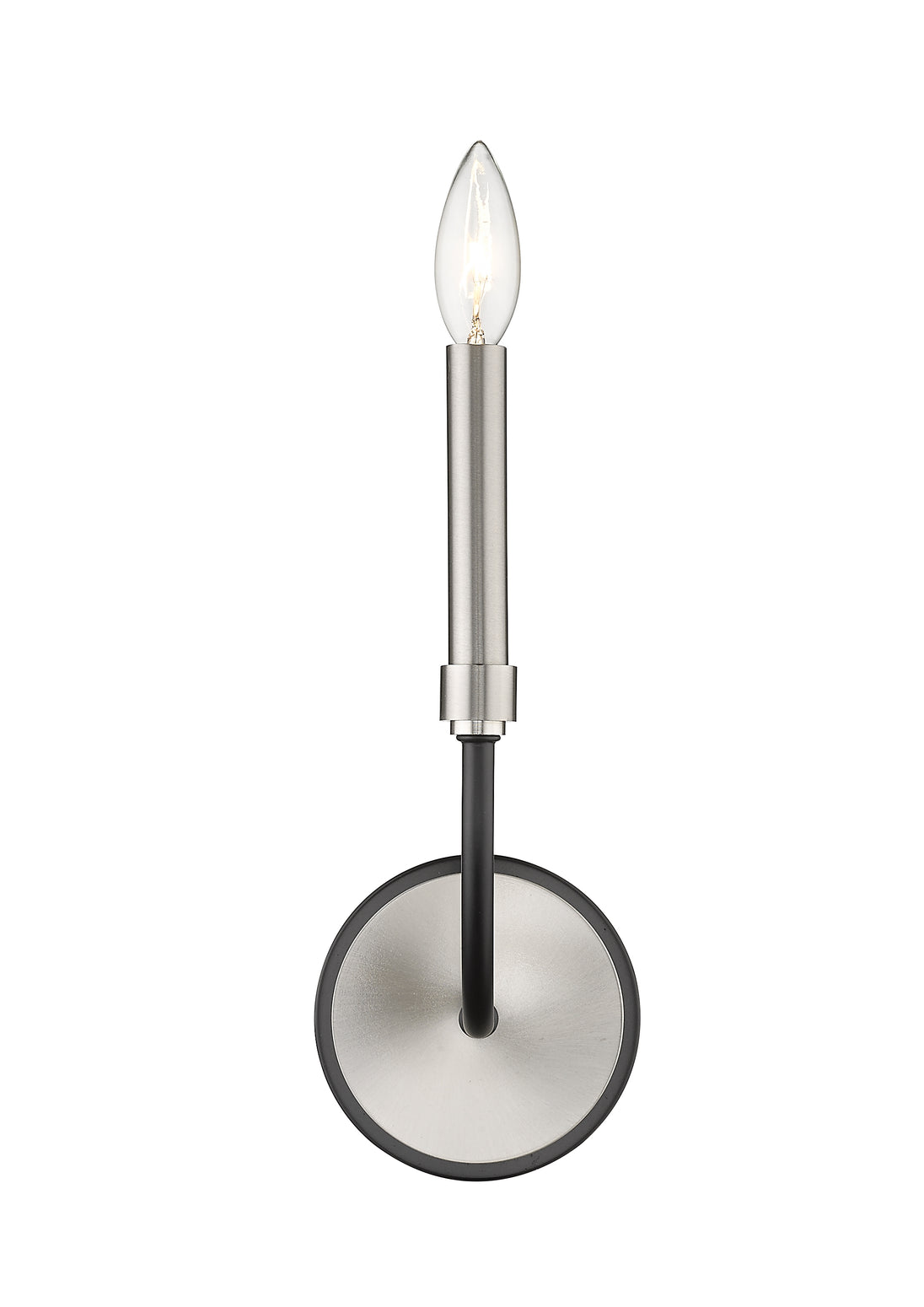 Add this bright two-tone one-light wall sconce to your favorite space for simple elegance. It's crafted in a classic matte black and brushed nickel finish with the light in a candle-like design. It's a gorgeous understated design perfect for the bathroom, powder room, hallway, or bedroom.