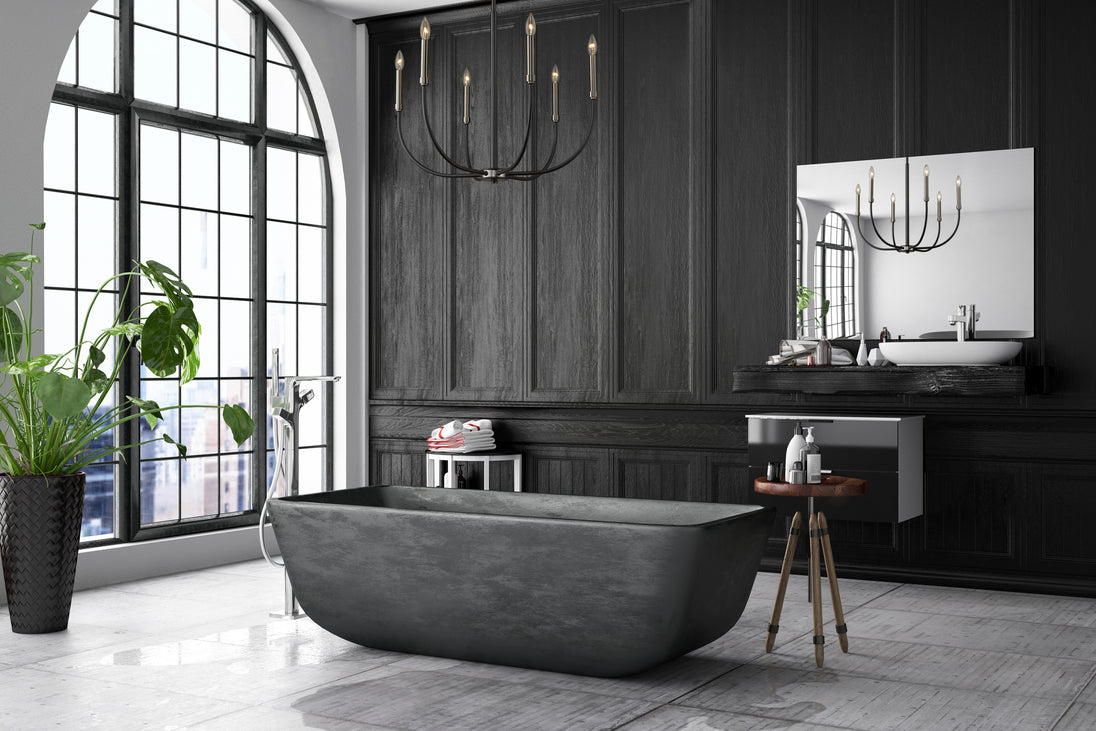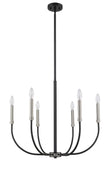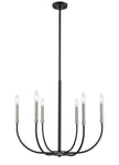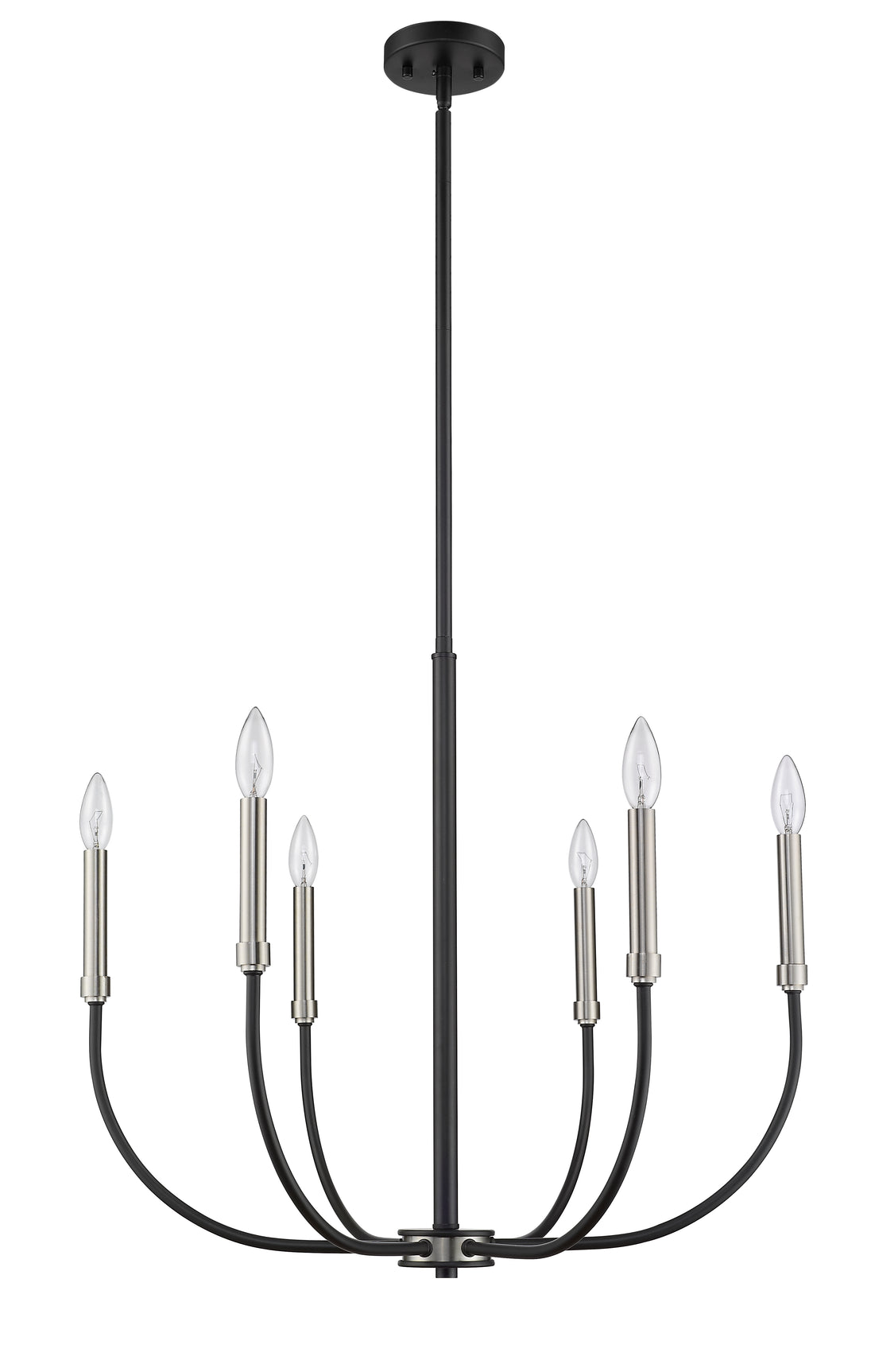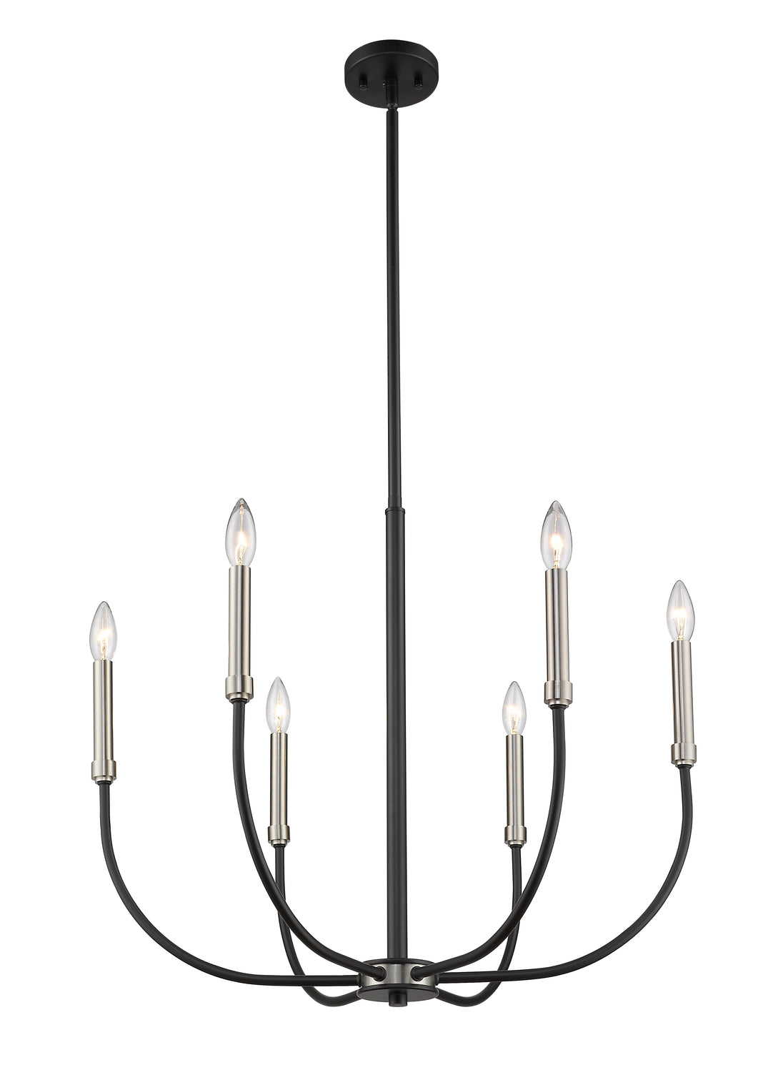 Shapely lines and an alluring shape highlight the design of this two-tone six-light chandelier. It features a candelabra-type design and is crafted in a classic matte black and brushed nickel finish. This delightful chandelier is perfect for the dining room, foyer, kitchen, or entertainment room.