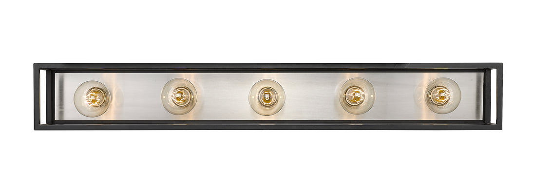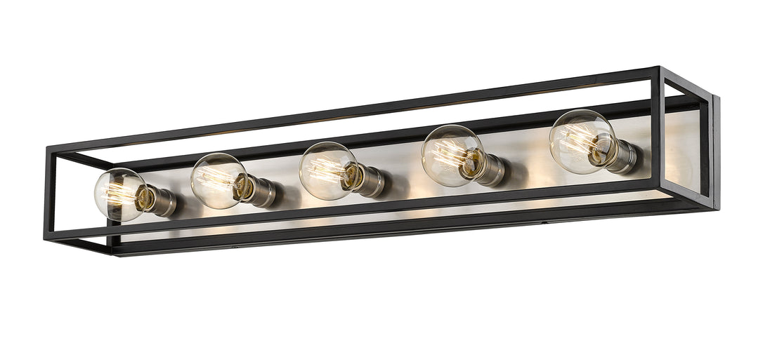 You'll love the ambiance that this two-tone five-light vanity imparts to your favorite space. It features a matte black and brushed nickel finish with an austere rectangle design that provides plenty of light. The bold, edgy design really energizes a bathroom or powder room.