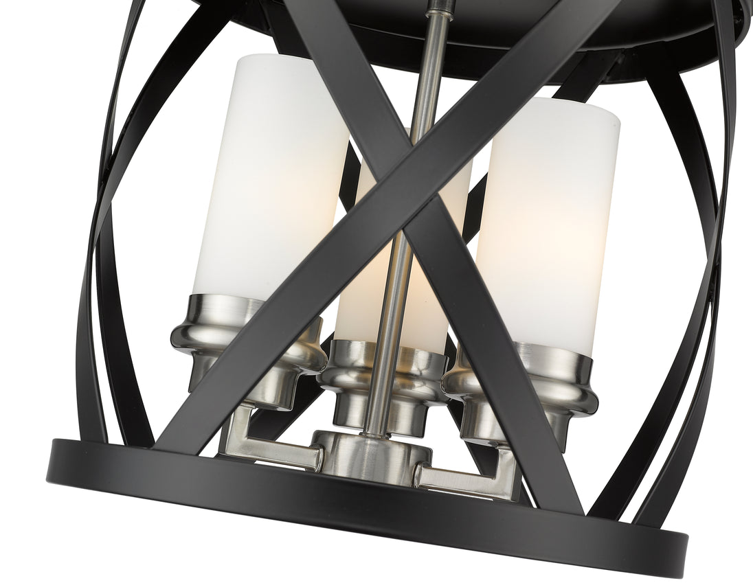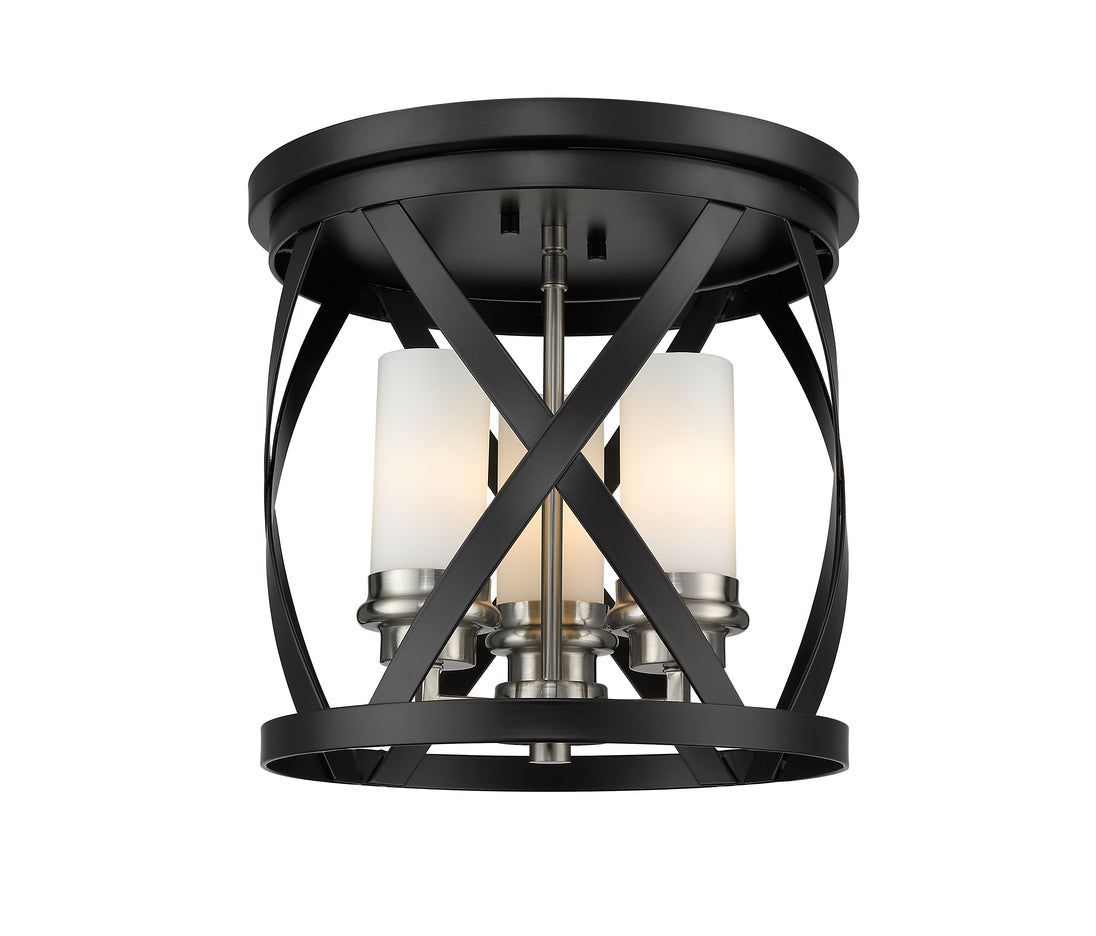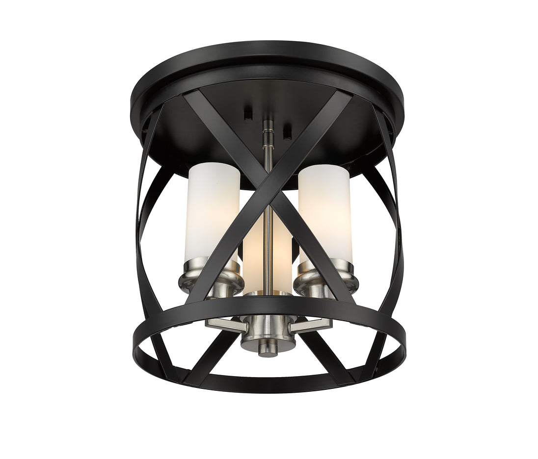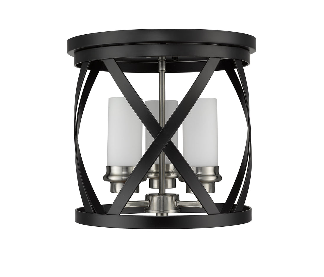 Add charm and style to your home lighting with this two-tone three-light flush mount light. It features a combination matte black and brushed nickel finish in a crisp round design highlighted by an X-cross pattern. Any hallway, bedroom, dining room, or living room will enjoy an immediate ambient upgrade with the addition of this.