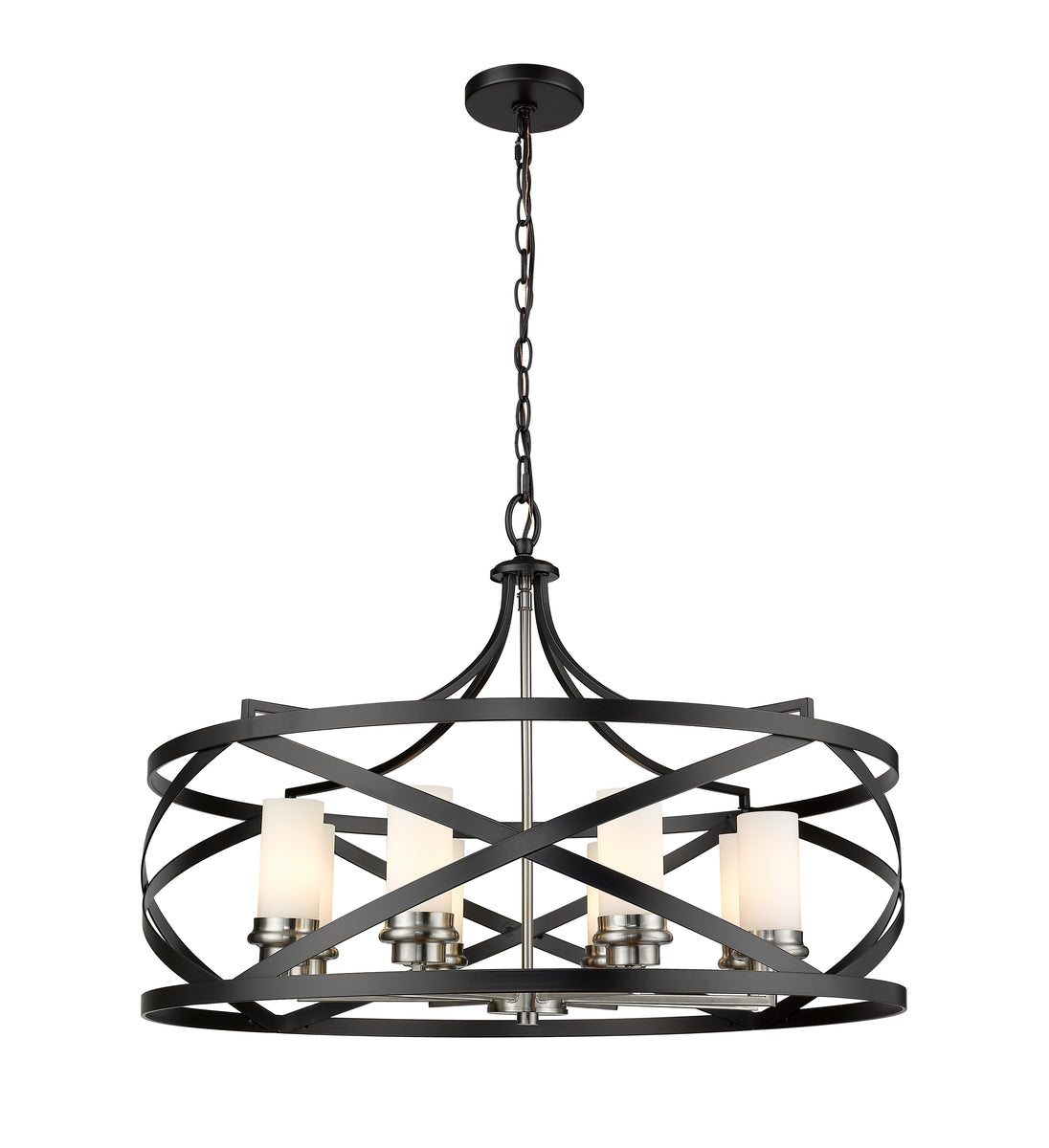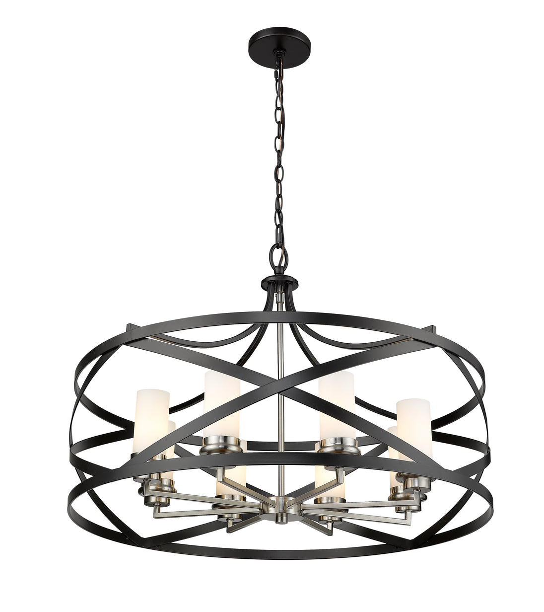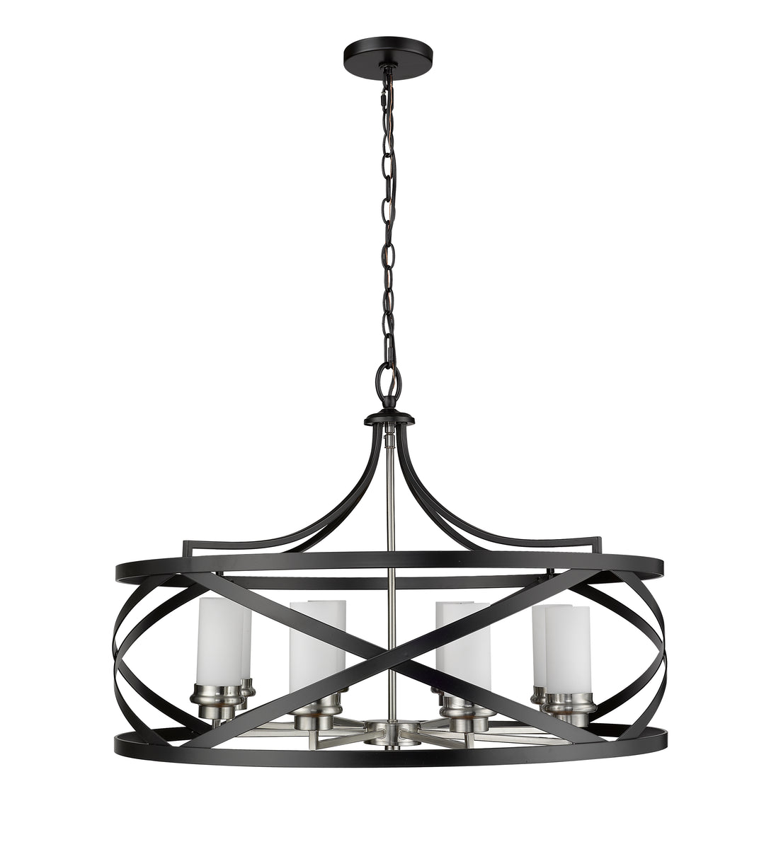 Make a statement with your home lighting when you add this spectacular two-tone eight-light pendant. It's crafted with a matte black and brushed nickel finish with the lights housed inside a round design highlighted by an X-cross pattern. This light will transform the look and feel of any foyer, grand dining room, living room, or kitchen.