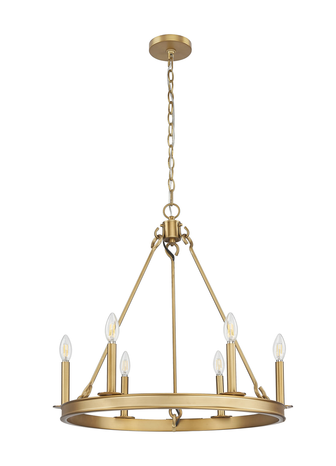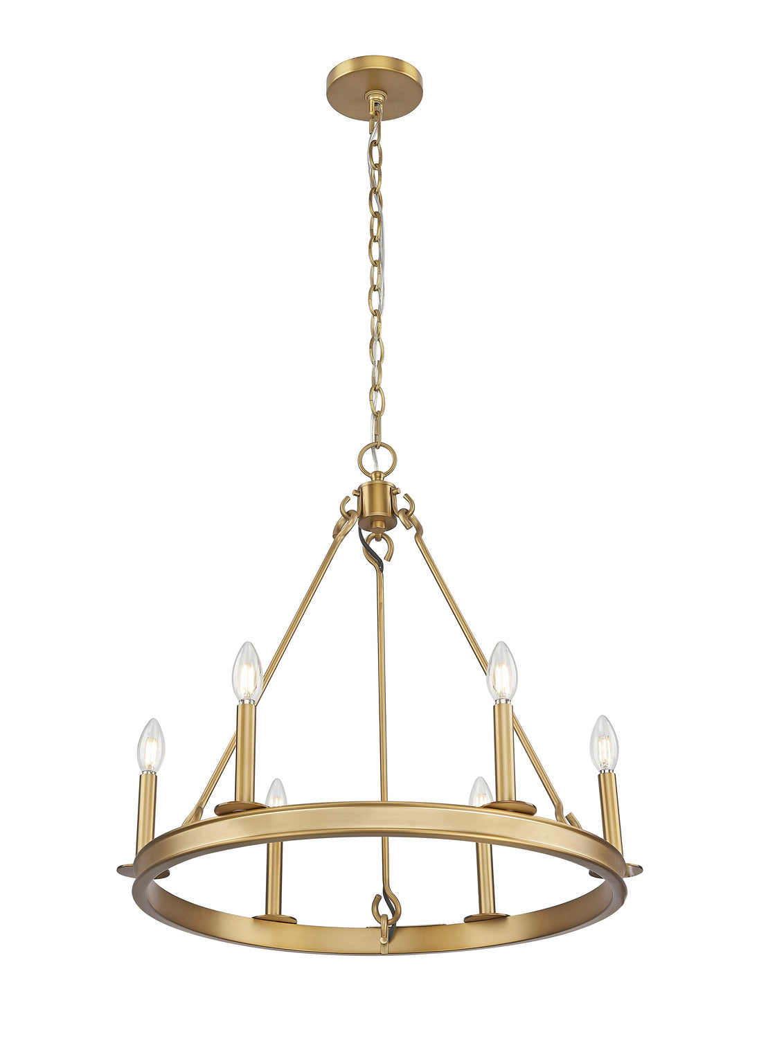 Modern minimalism blends with vintage character in this six-light ring chandelier. Perfect for a dining table or cozy sitting area, it features a sleek ring silhouette with candelabra lights for inviting illumination. A rubbed brass finish delivers impeccable warmth and richness, perfect for a welcoming home.
