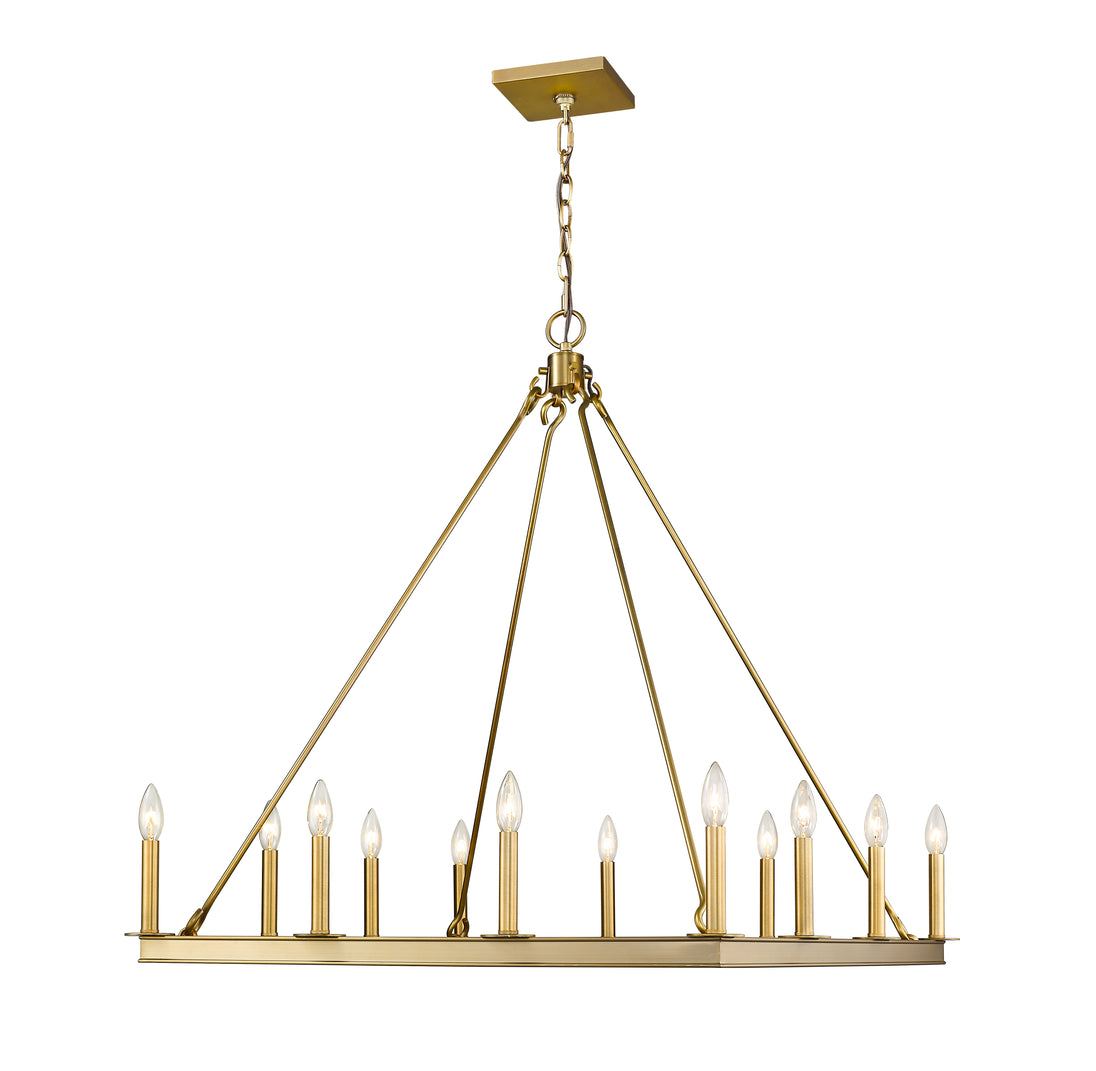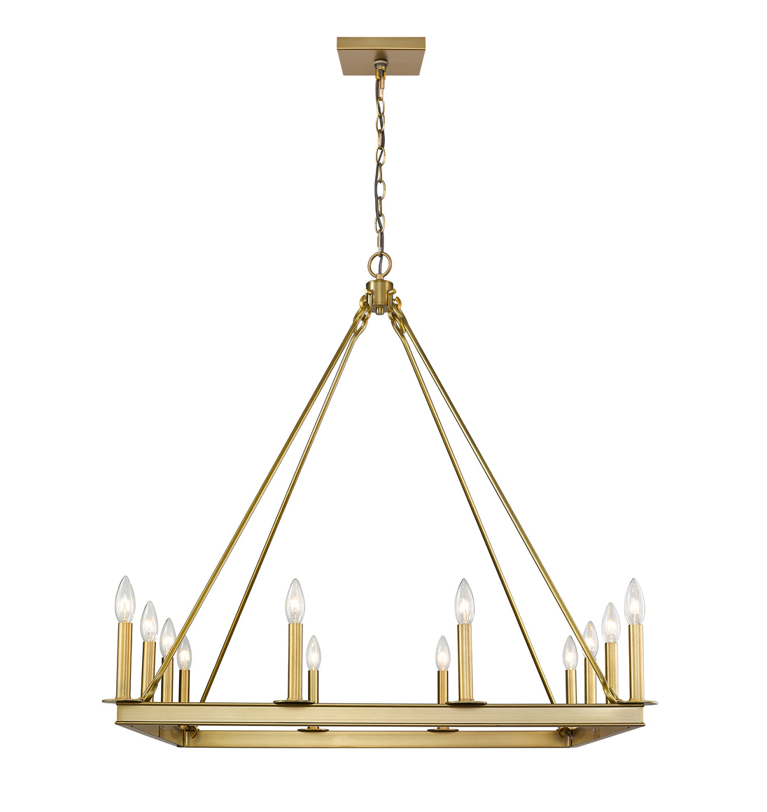 Elevate the elegance of your home lighting with this majestic twelve-light chandelier. It features a lustrous olde brass finish with the candle-inspired lights in a bold square design. It's the chandelier you've been looking for to light up your dining room, foyer, or kitchen.