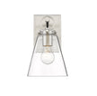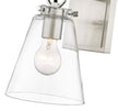 Contemporary bathrooms light up with the chic, delicate design of this one-light wall sconce. With a conical shade crafted of clear glass, it adds a charming motif with a brushed nickel finish hand-tooled steel mount adding festive geometric accents. This light from the Harper collection dazzles in a custom bath space.