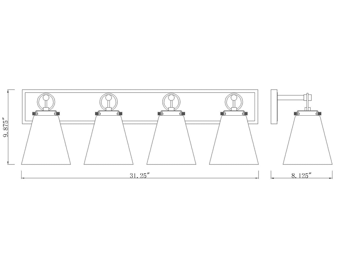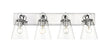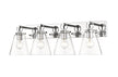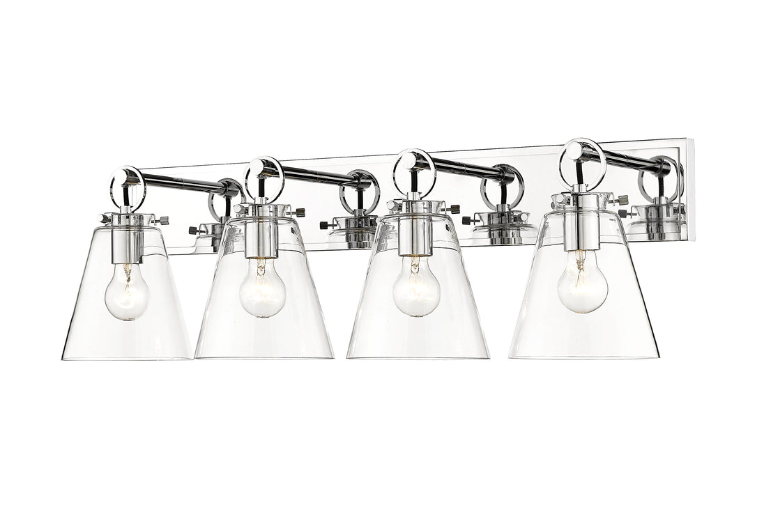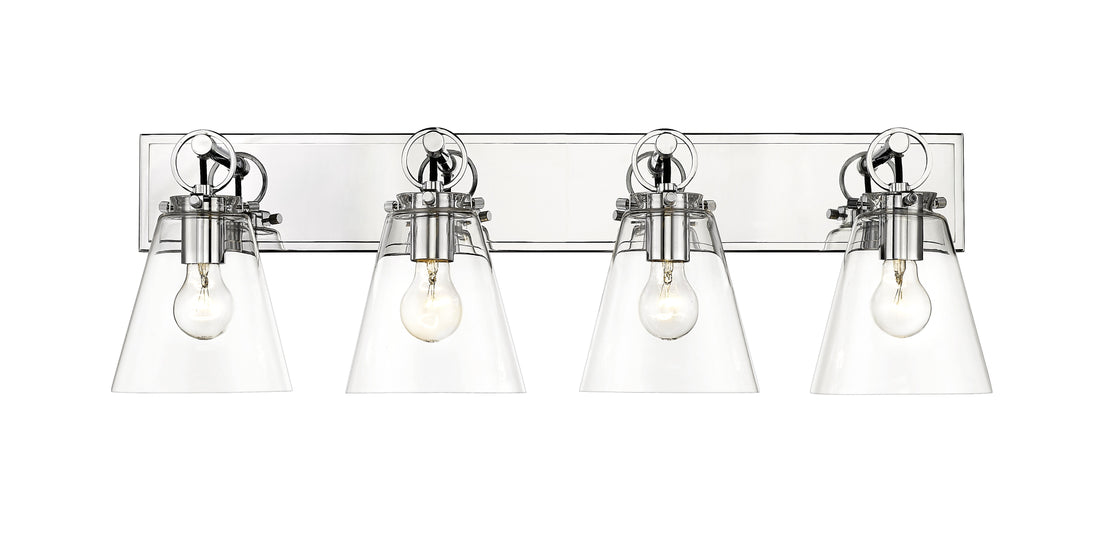 This modern four-light vanity bath light captures a sophisticated aesthetic with nautical inspiration, perfect for an upscale custom bath space. Indulge in delicate conical shades made of clear glass and a shiny chrome finish wall mount updated with charming ring and peg accents. Perfect for a mid-sized to larger vanity, this light becomes a focal point.