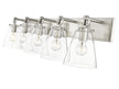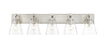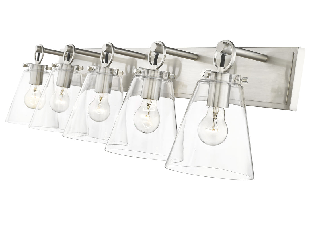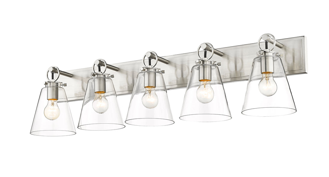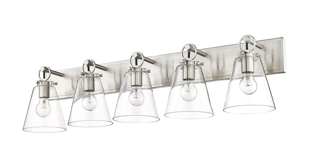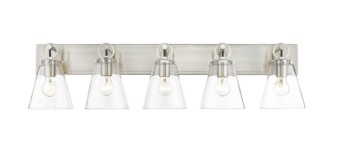 Graceful elegance follows linear styling to deliver a fashionable way to illuminate a contemporary bath space. This five-light vanity light from the Harper collection offers inspiring nautical charm with upscale materials and finishes. A brushed nickel finish steel wall mount and ring and peg accents add whimsical vibes to five delicate conical shades fashioned of sleek clear glass.