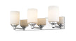 The clean lines of the Soledad vanity collection use white opal glass shades on chrome or matte black full sized wall plates to create a contrasting design. The fixtures are available in 1 to 5 light and can be mounted facing up or down.