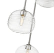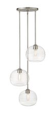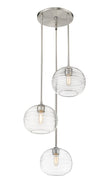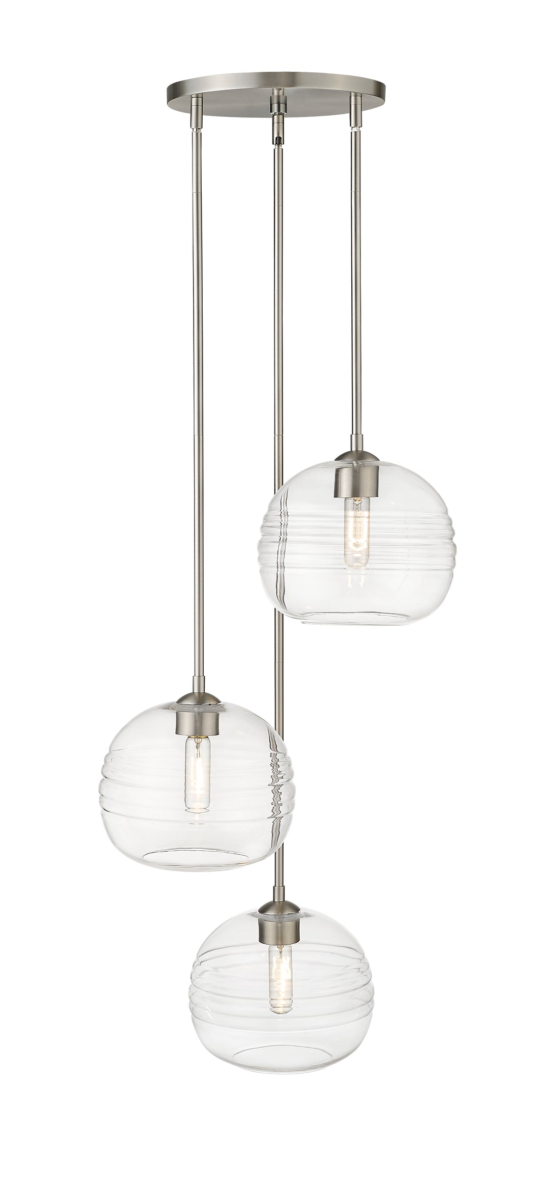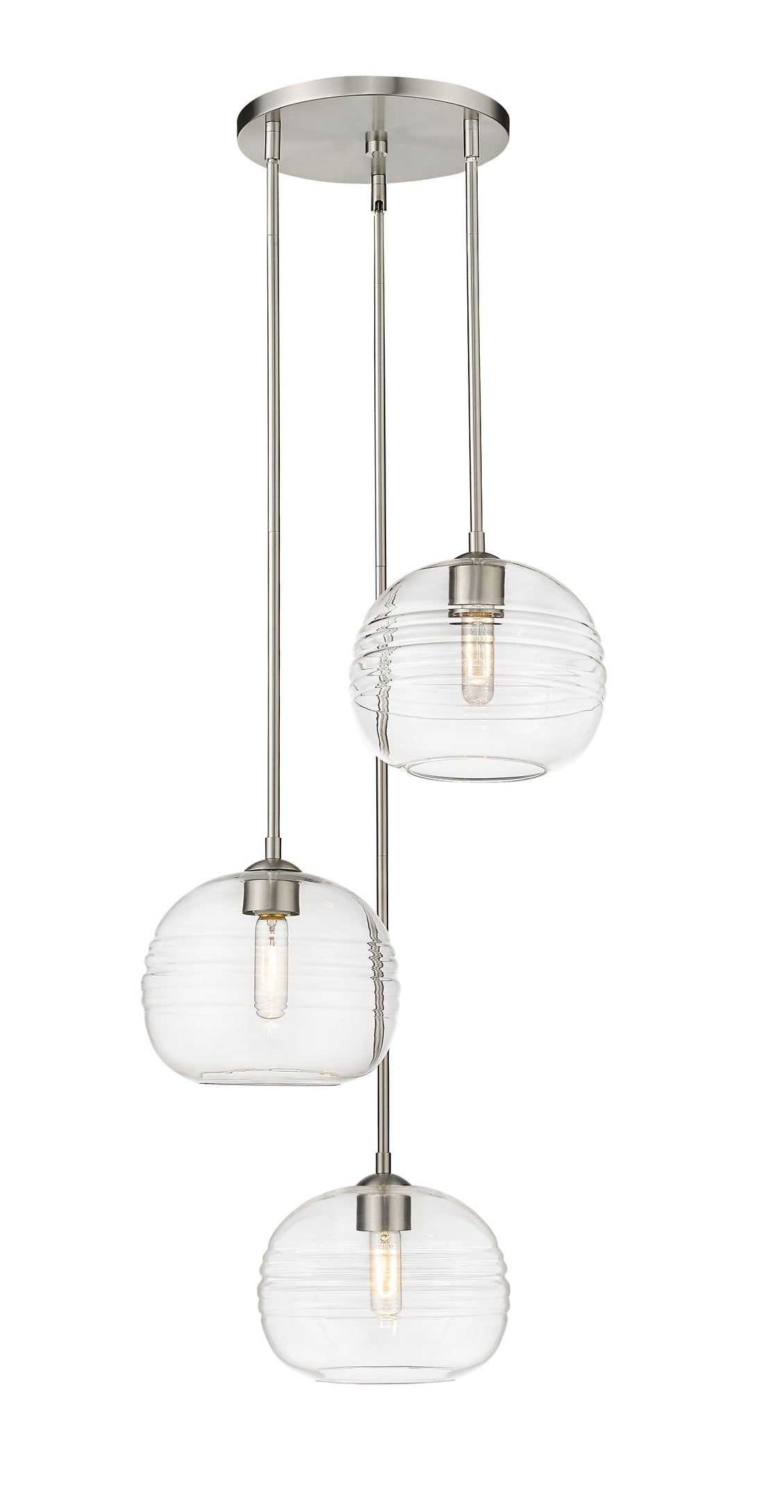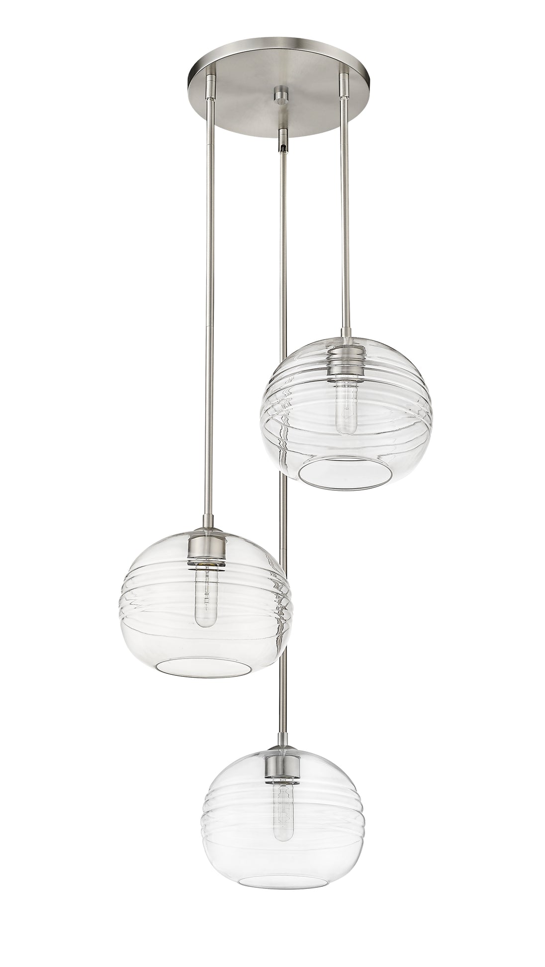 Express your modern aesthetic with this eye-catching three-light pendant. Grooved, rounded shades are made from clear glass, suspended from a sleek steel frame with a brushed nickel finish. The fixture brings a chic cutting edge to a contemporary kitchen or dining room.