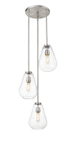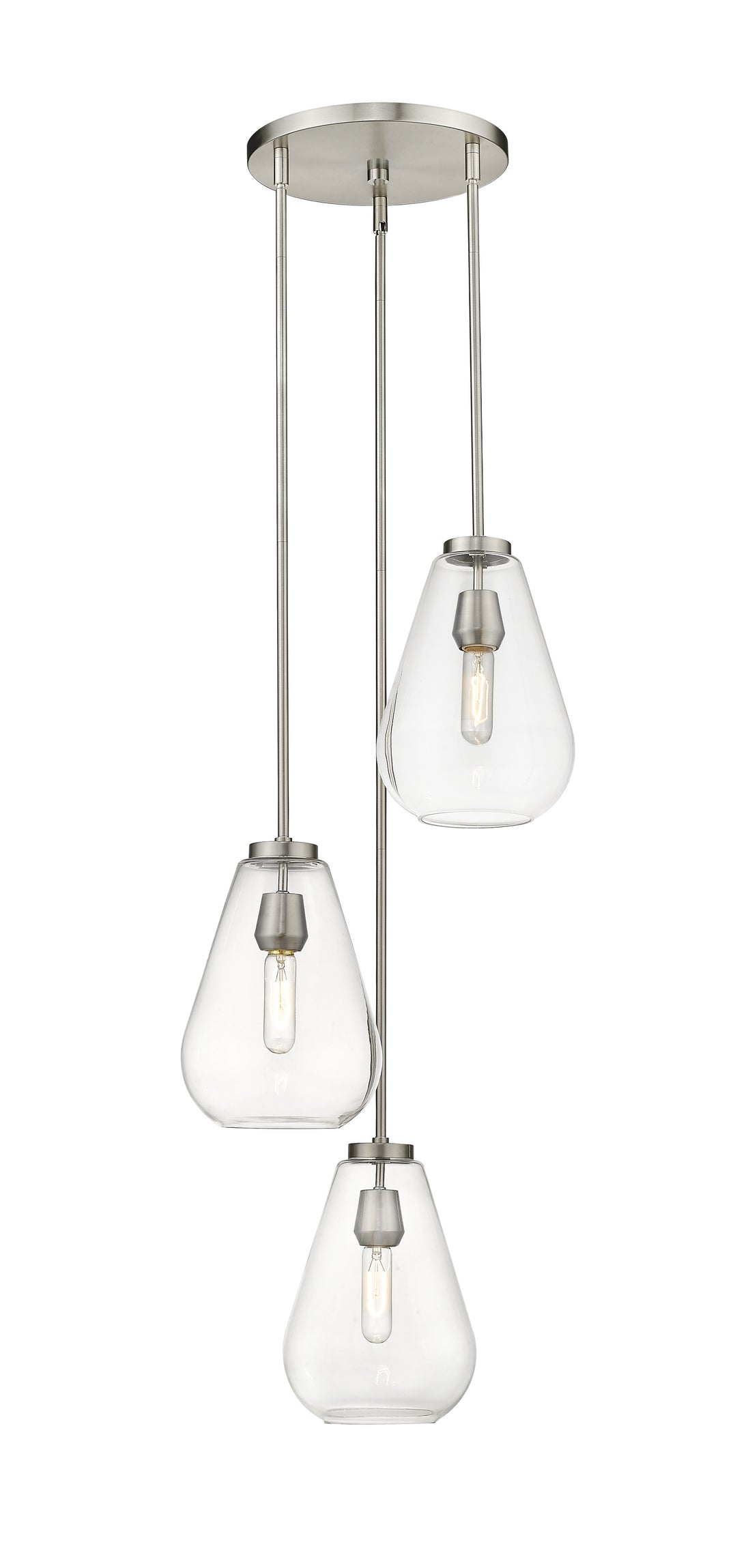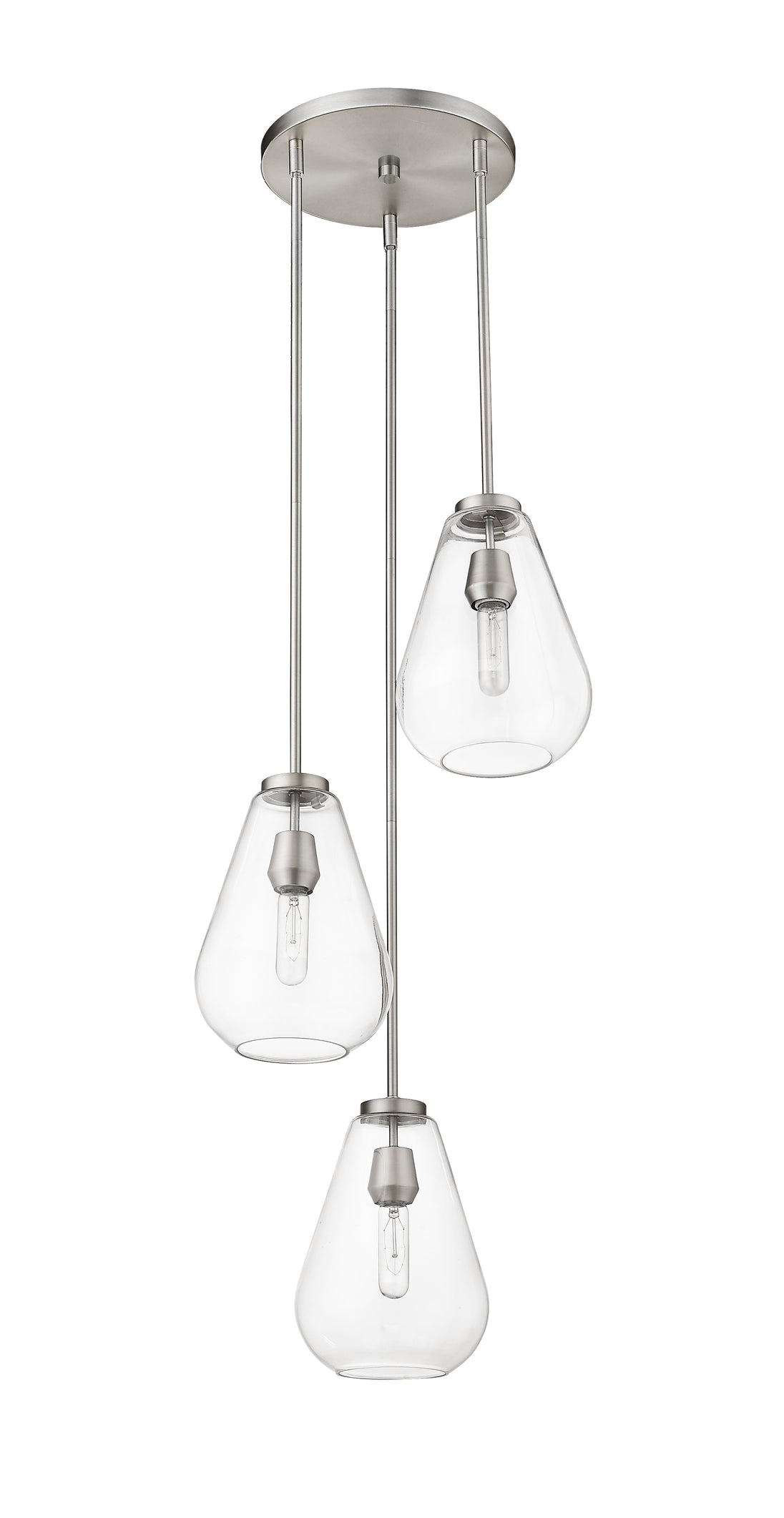 An eye-catching three-light pendant perfectly encapsulates the modern aesthetic. Tapered bell-shaped shades are made from clear glass, suspended from a sleek steel frame with a brushed nickel finish. The fixture brings a chic cutting edge to a contemporary kitchen or dining room.