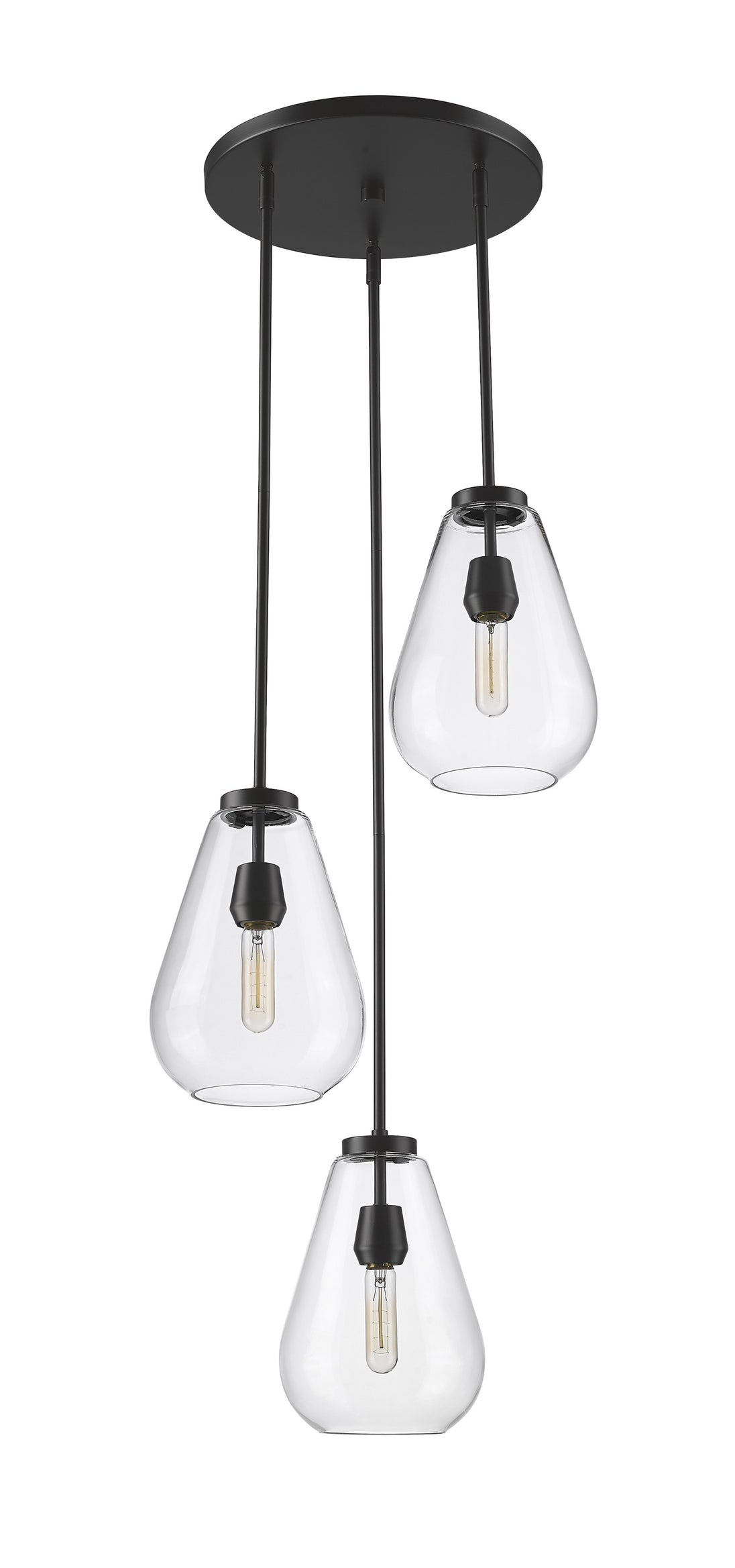 An eye-catching three-light chandelier perfectly encapsulates the modern aesthetic. Tapered bell-shaped shades are made from clear glass, suspended from a sleek steel frame with a matte black finish. The fixture brings a chic cutting edge to a contemporary kitchen or dining room.