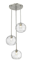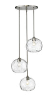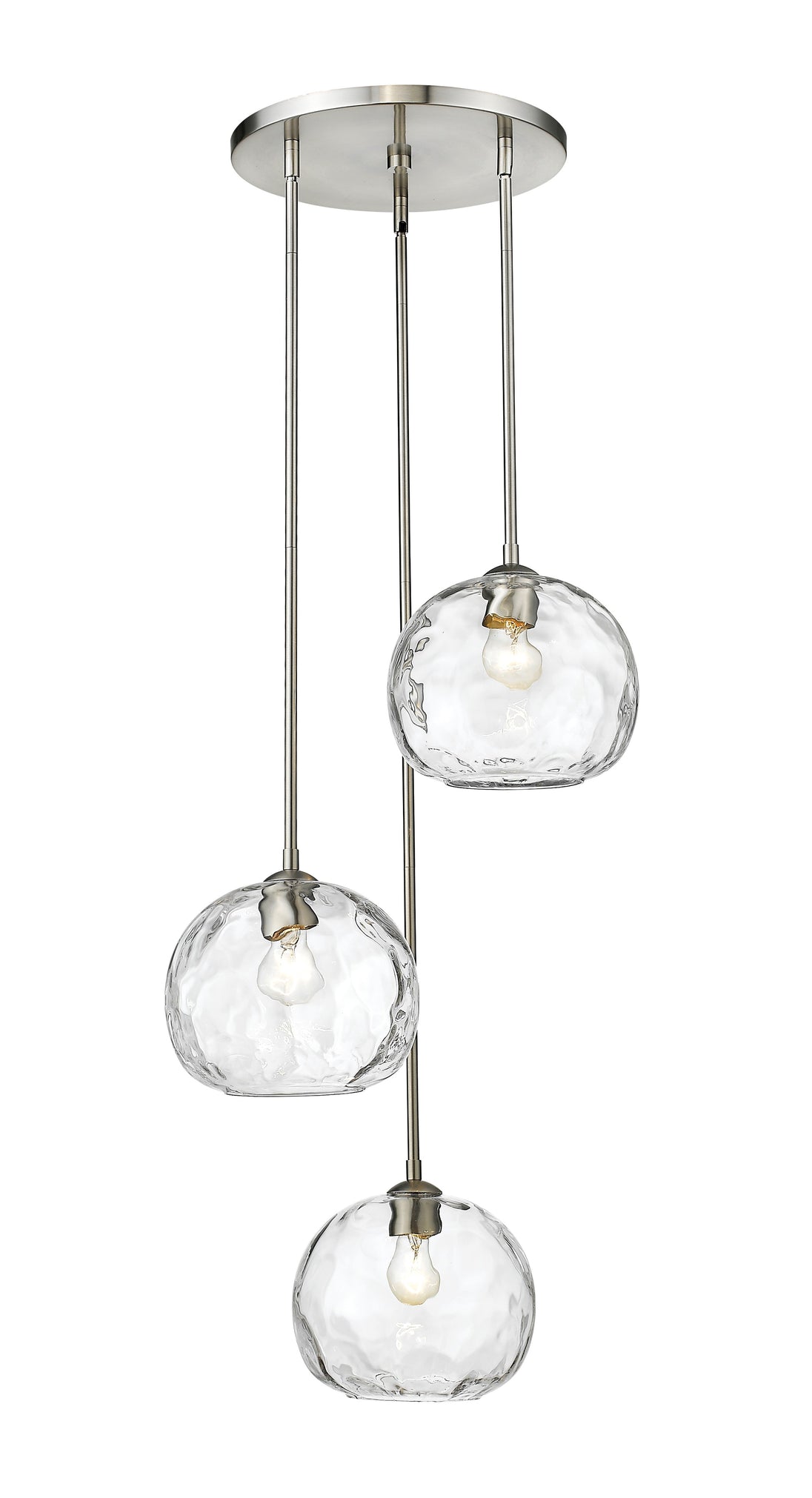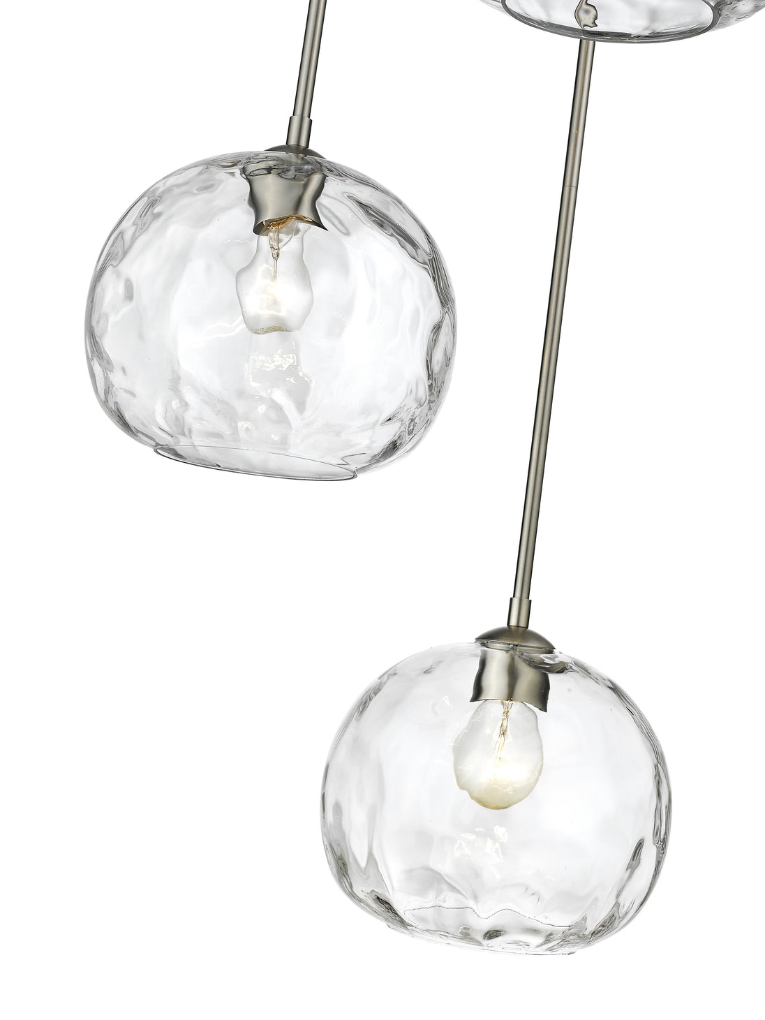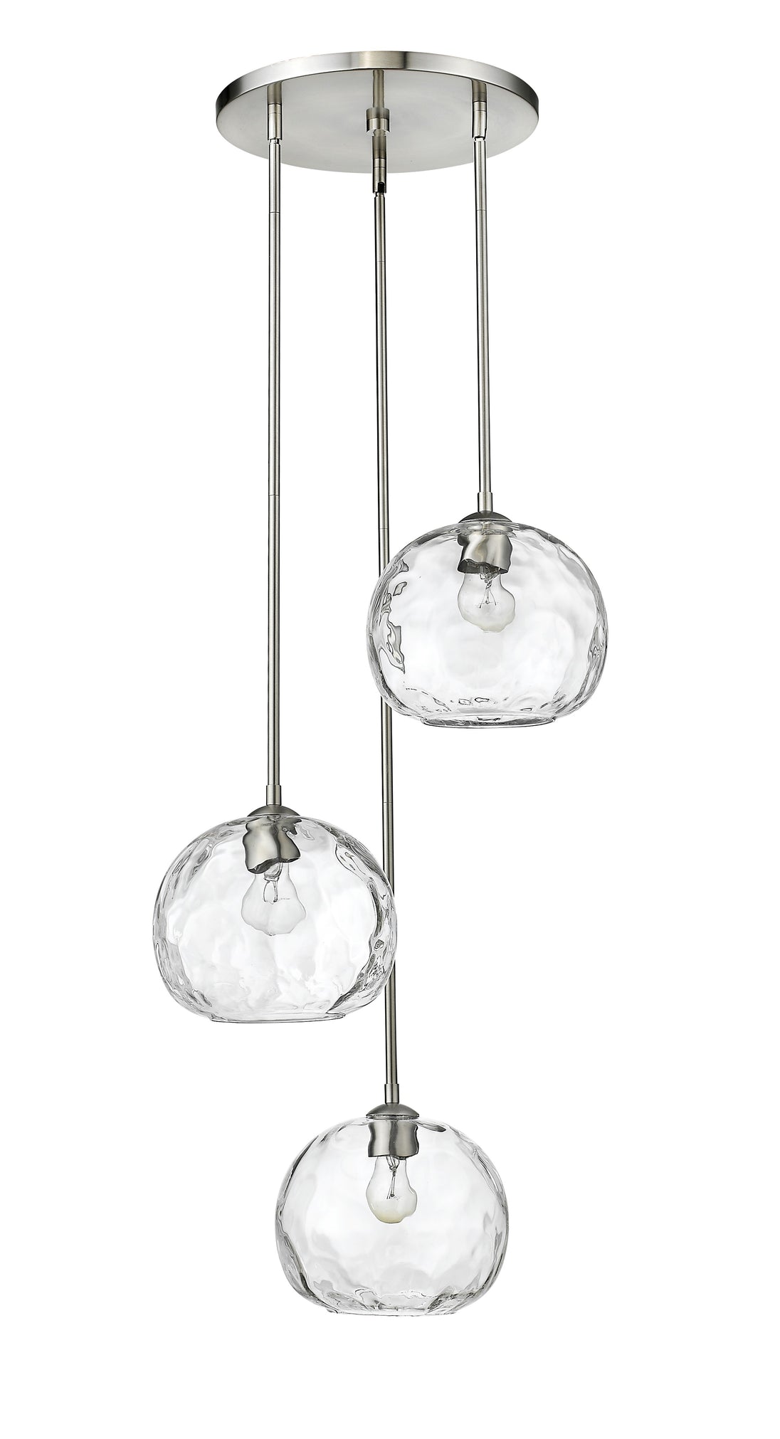 Define your modern space with the eye-catching, streamlined presence of this contemporary three-light pendant. Grooved, rounded shades are made from clear, water-textured glass, suspended from a sleek steel frame with a brushed nickel finish. Your contemporary dining room or family space gets an instant boost with this sophisticated fixture.