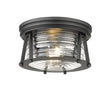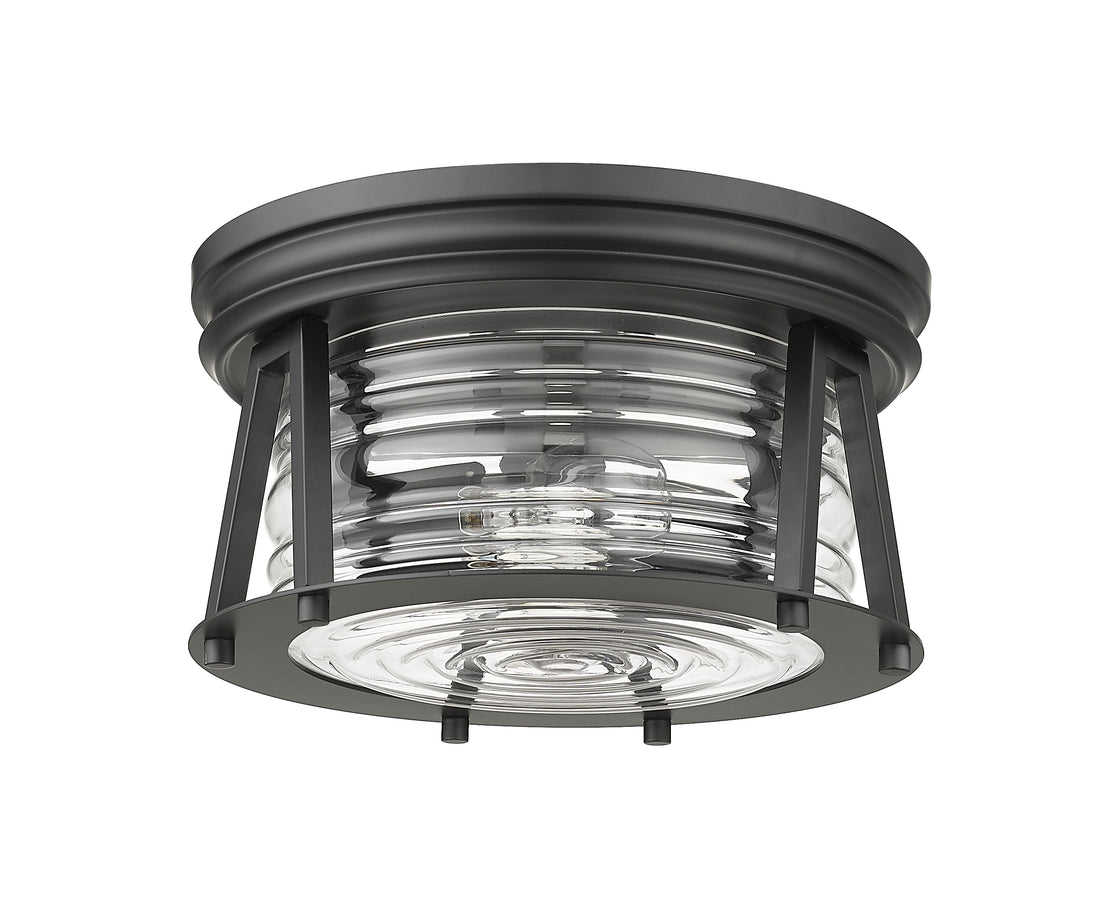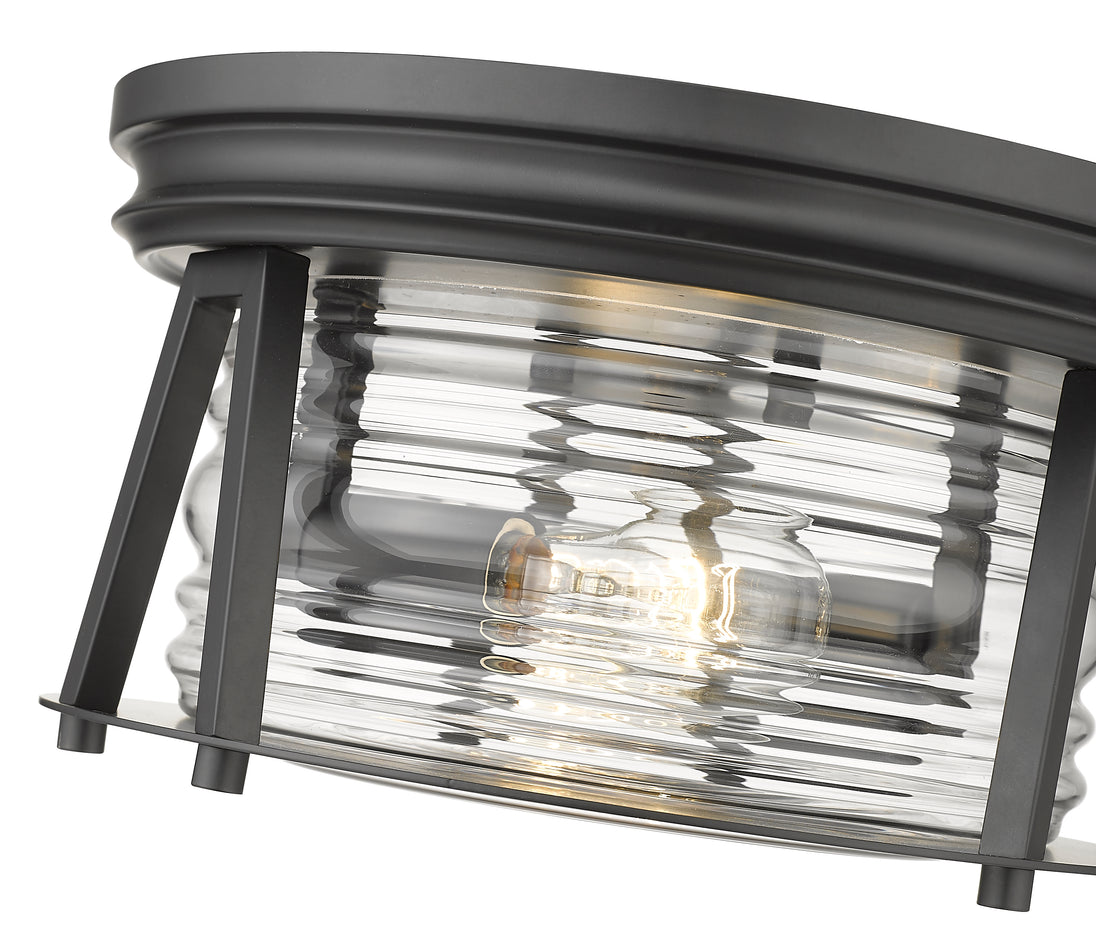 Indulge in a storied historical theme as you outfit a modern space with ambient light fixtures. Aptly named from the Cape Harbor collection, this delightful two-light flushmount ceiling light offers a tribute to authentic nautical fare from coastal Cape Harbor in North America, combining Art Deco flavor with a linear concept. This light offers an angled matte black finish frame and canopy that nestles ribbed clear glass, delivering an aesthetic that moves from industrial to modern to coastal.