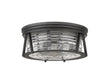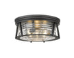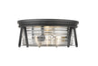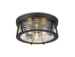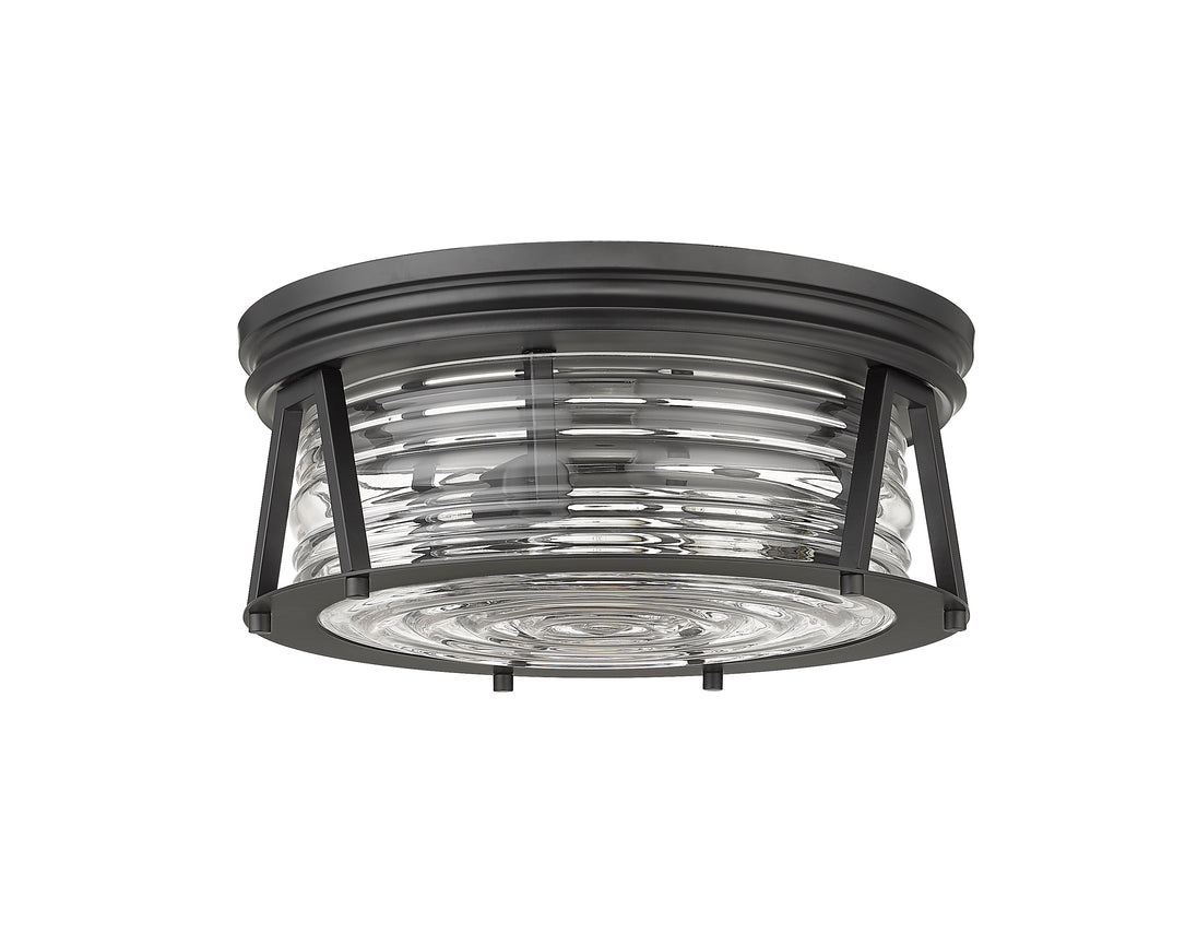 Chic lighting illuminates a custom space with decadence and a hint of nautical fare, customizing this matte black and glass three-light flushmount ceiling light. Embrace a historical theme originating from storied lighthouse designs with this light from the Cape Harbor collection, enjoying versatility that embellishes a space with modern, industrial, and Art Deco ambiance. This light offers a sleek ribbed clear glass shade nestled in a linear frame fashioned of bold matte black finish steel.