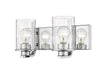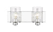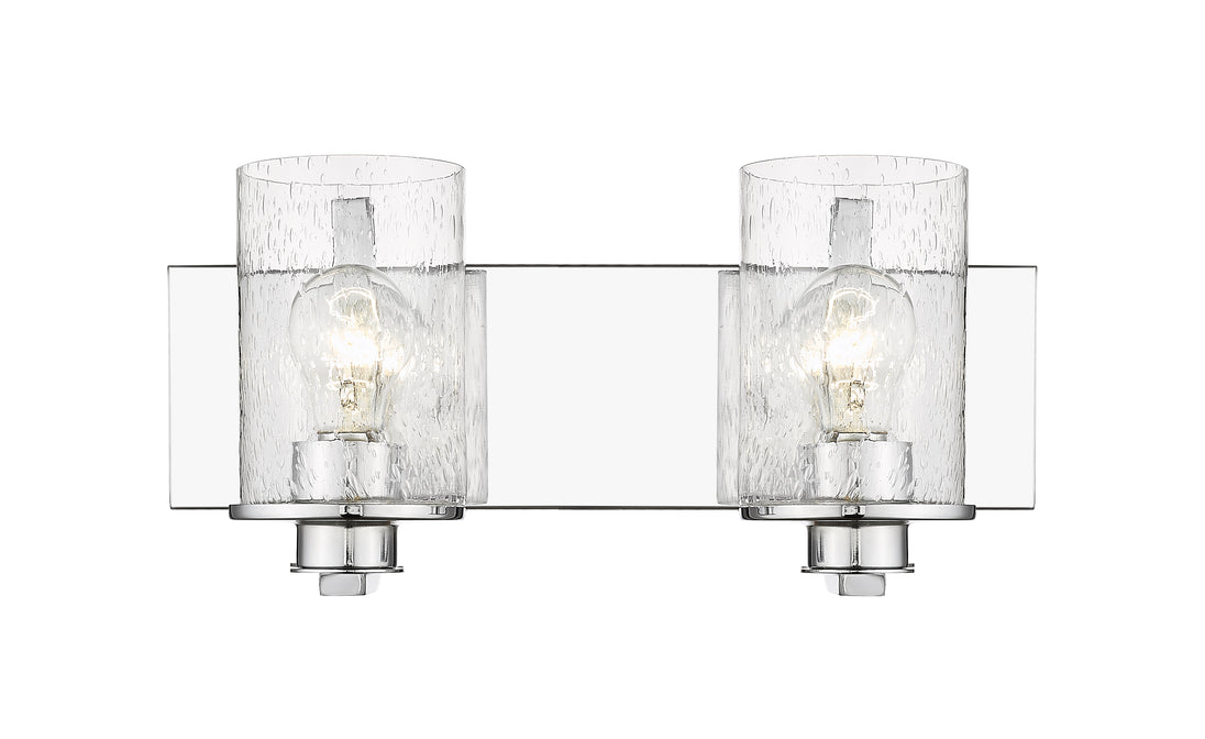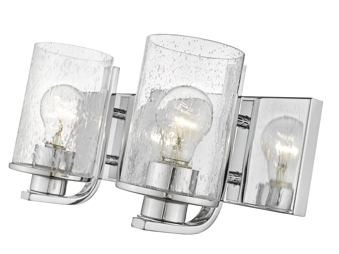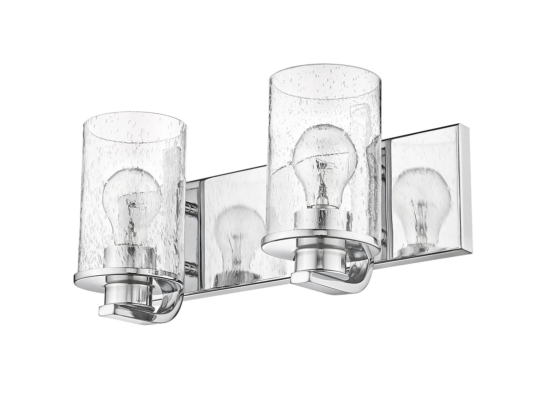 The romantic effect of clear seedy glass adds a custom design element to this contemporary two-light vanity, a great choice for illuminating modern bath and dressing spaces. Glass shades embellish the minimalist yet stylish look of steel frames and mounts made of radiant chrome finish steel. This two-light vanity light from the Beckett collection dresses up a compact bath space with sophistication.
