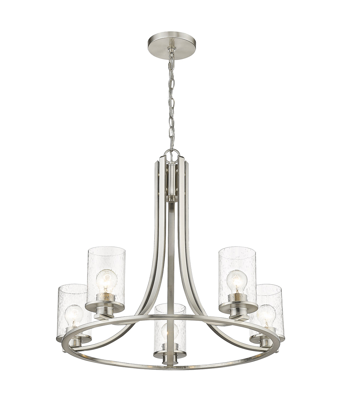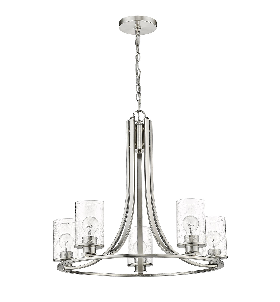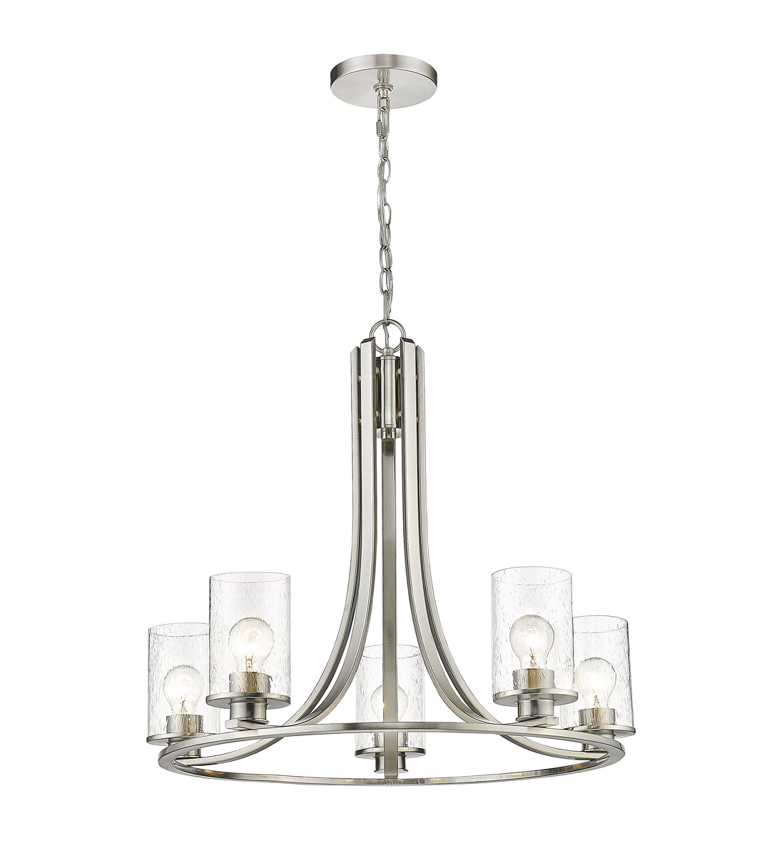 Design simplicity adds class and taste to a modern space with the addition of this five-light chandelier from the Beckett collection. A round frame crafted of brushed nickel finish steel delivers a delightful silhouette with long, flared arms. Clear seedy glass shades in a cylindrical shape complement its artful form and introduce a hint of romance, making this chandelier an excellent selection for contemporary to transitional dining rooms, hallways, and main living areas.