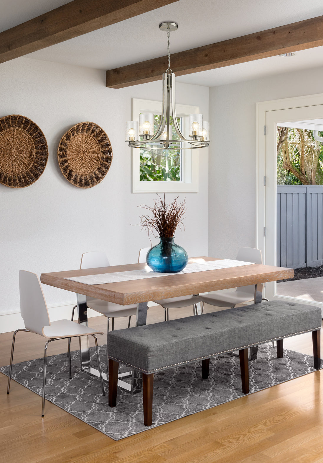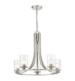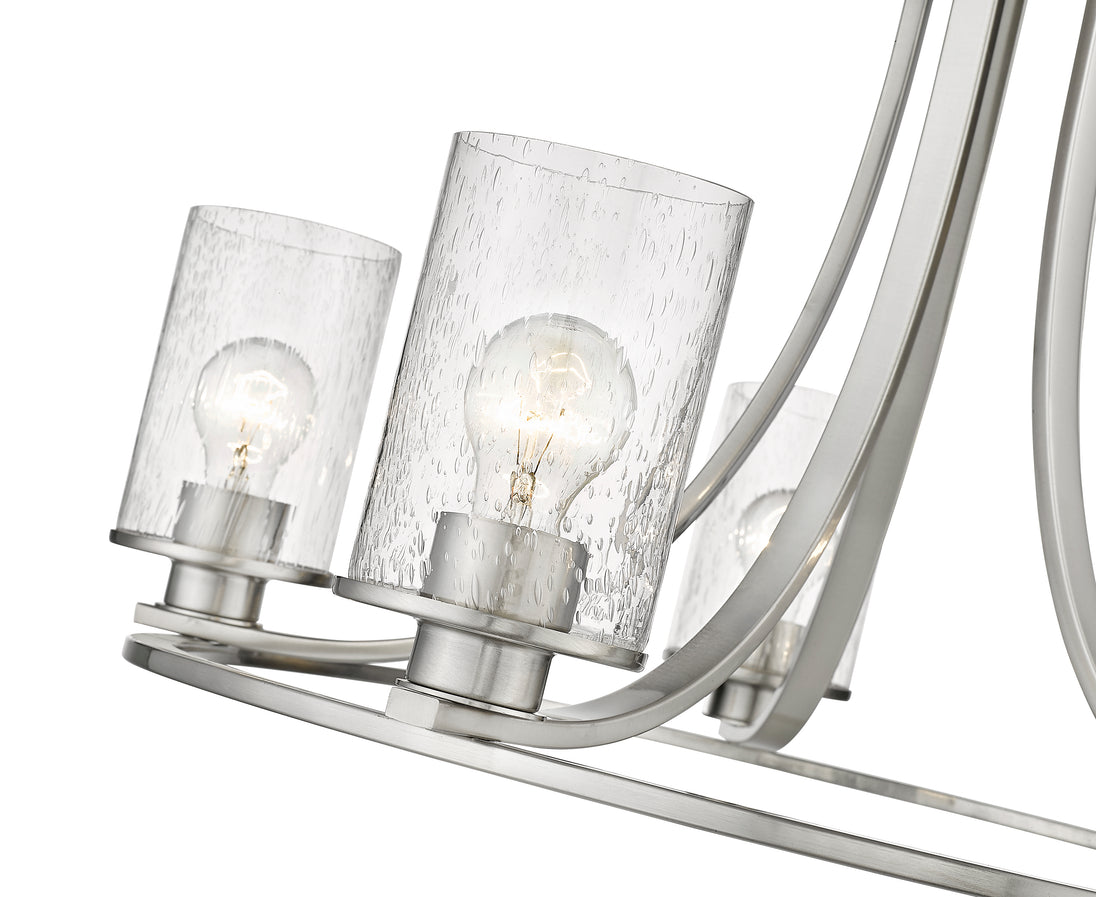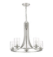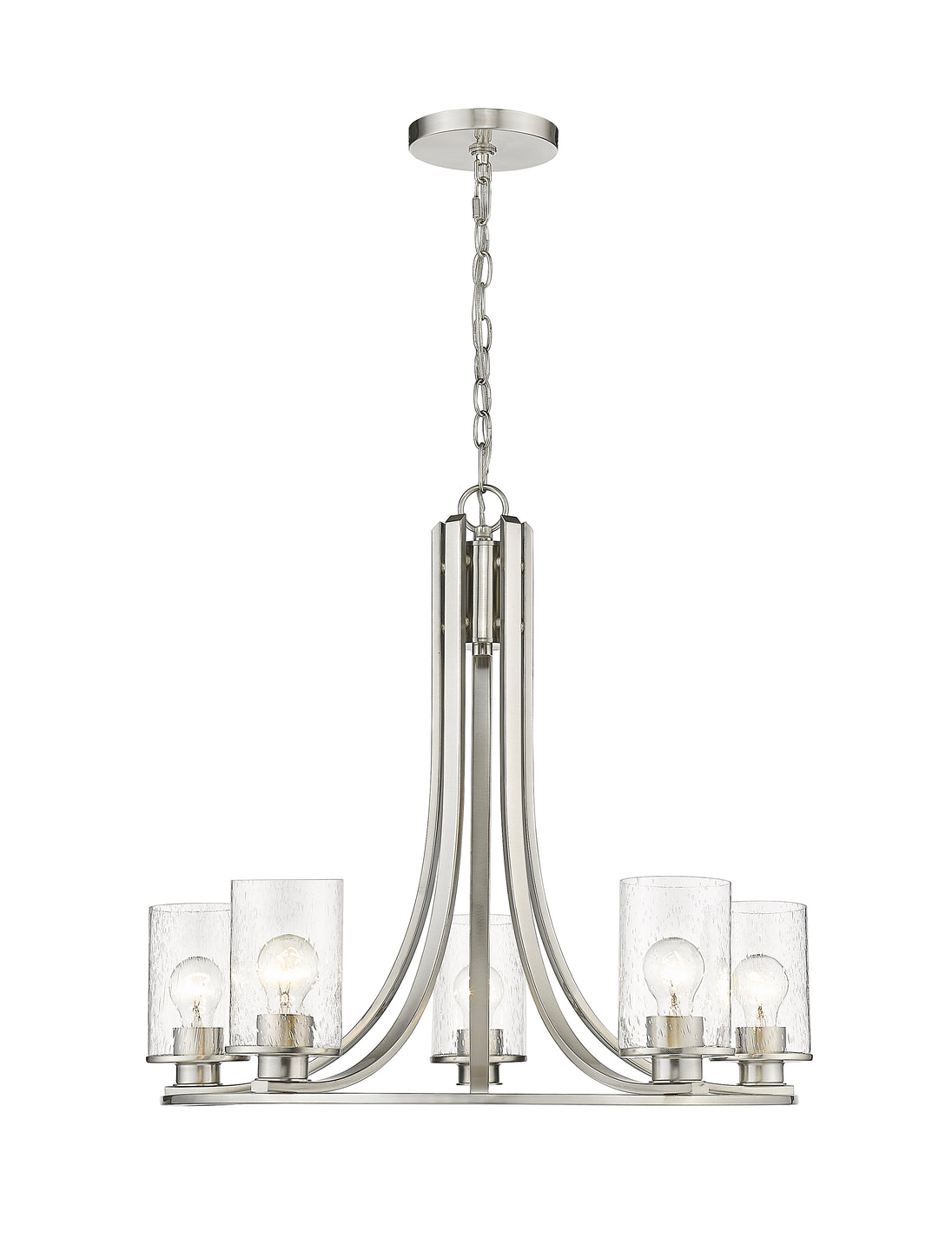 Design simplicity adds class and taste to a modern space with the addition of this five-light chandelier from the Beckett collection. A round frame crafted of brushed nickel finish steel delivers a delightful silhouette with long, flared arms. Clear seedy glass shades in a cylindrical shape complement its artful form and introduce a hint of romance, making this chandelier an excellent selection for contemporary to transitional dining rooms, hallways, and main living areas.