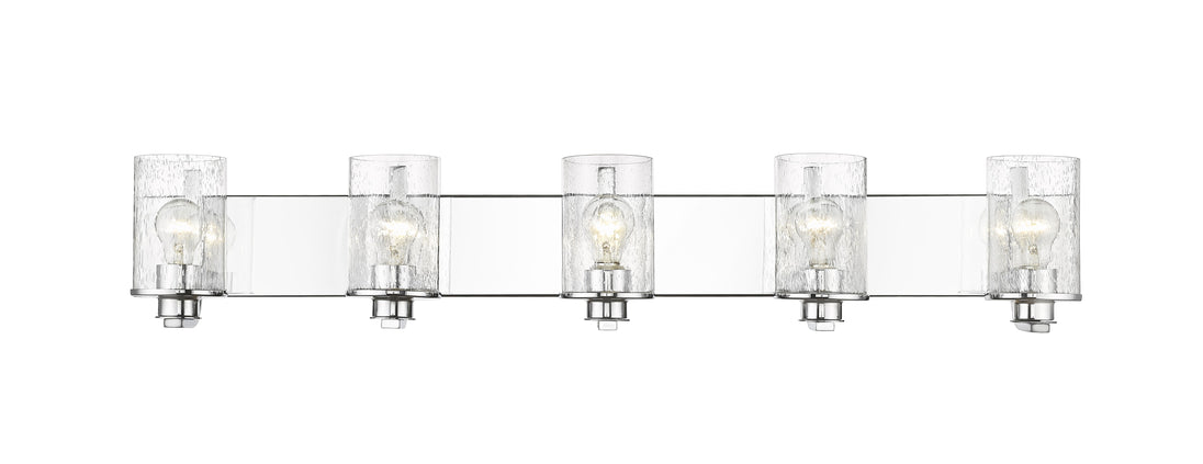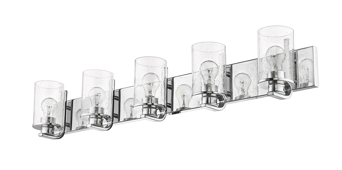 A modern version of nautical charm makes its way into this five-light vanity light from the Beckett collection, adding a pleasing touch to any space. Larger bath areas light up with this vanity light fashioned of bright chrome finish steel with a rectangular wall mount and charming accents. Clear seedy glass shades in cylindrical form offer a delicate, natural infusion of romance.
