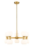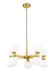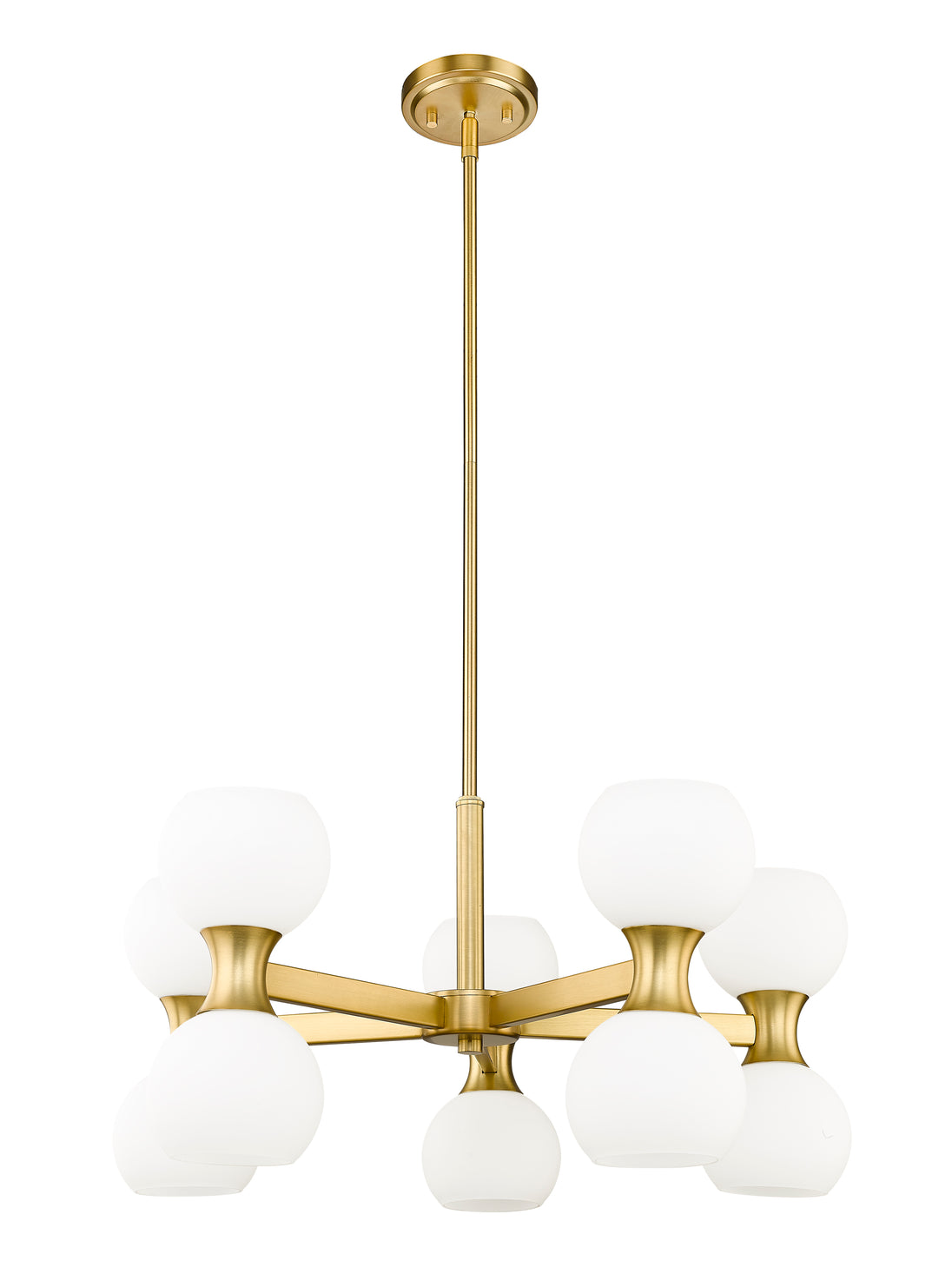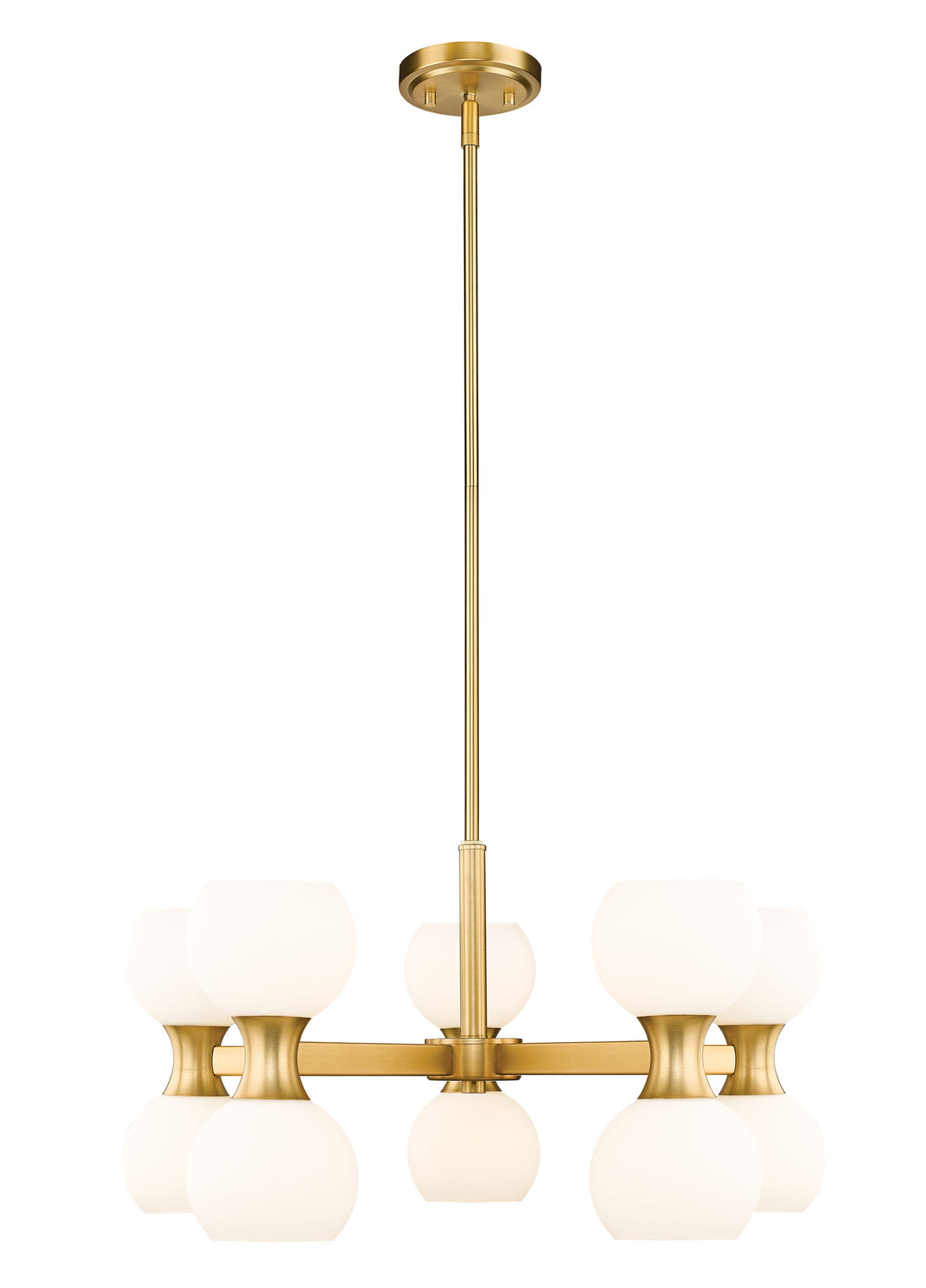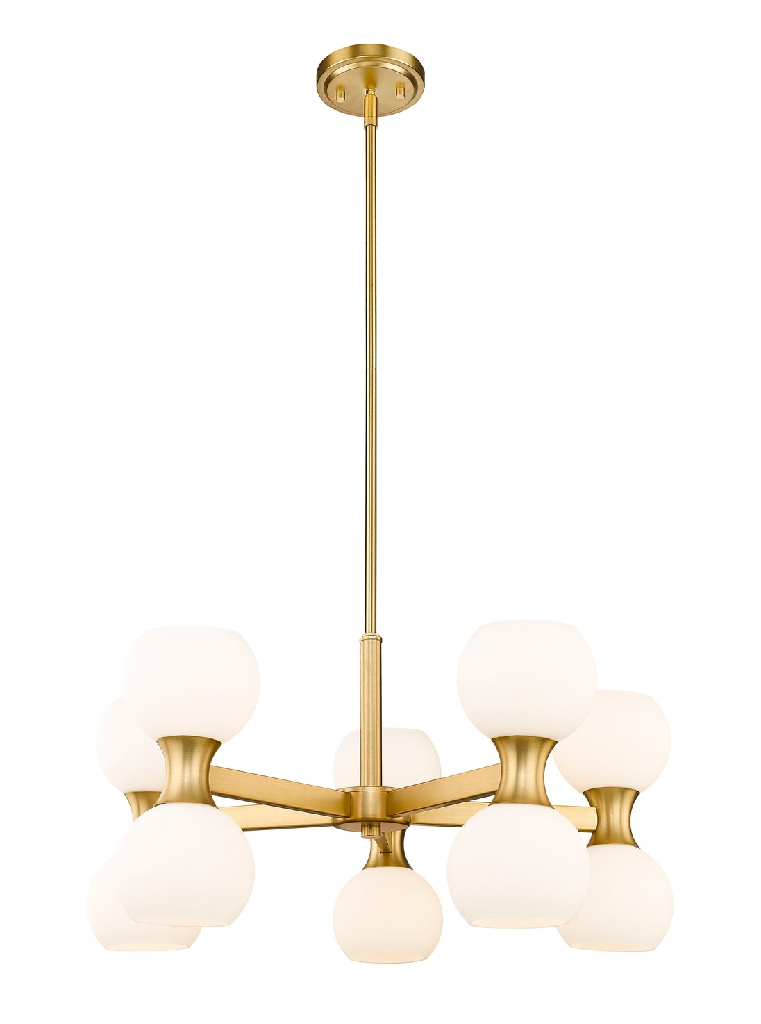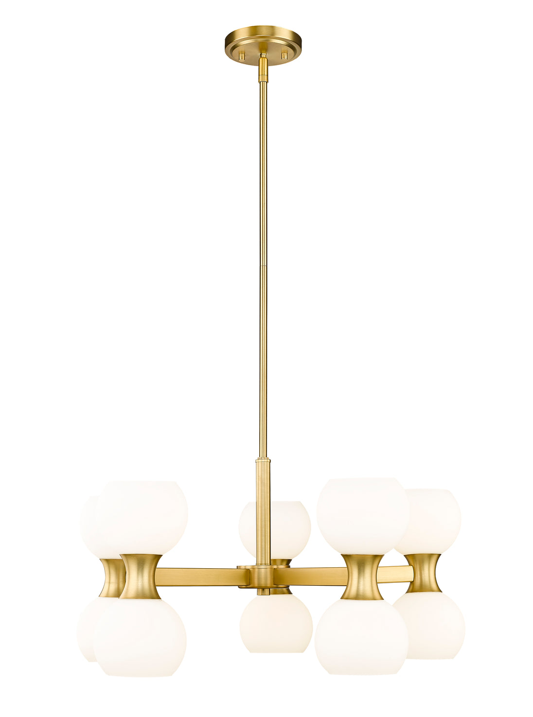 Lush modern gold finish steel begins a decadent journey toward a reworked Mid-Century Modern motif in a 10-light chandelier from the Artemis collection. Perfectly blending linear elements with chic concave shapes, this transitional fixture illuminates a dining space, living room, or entryway with delicate opal glass shades and adds a pop of attitude.