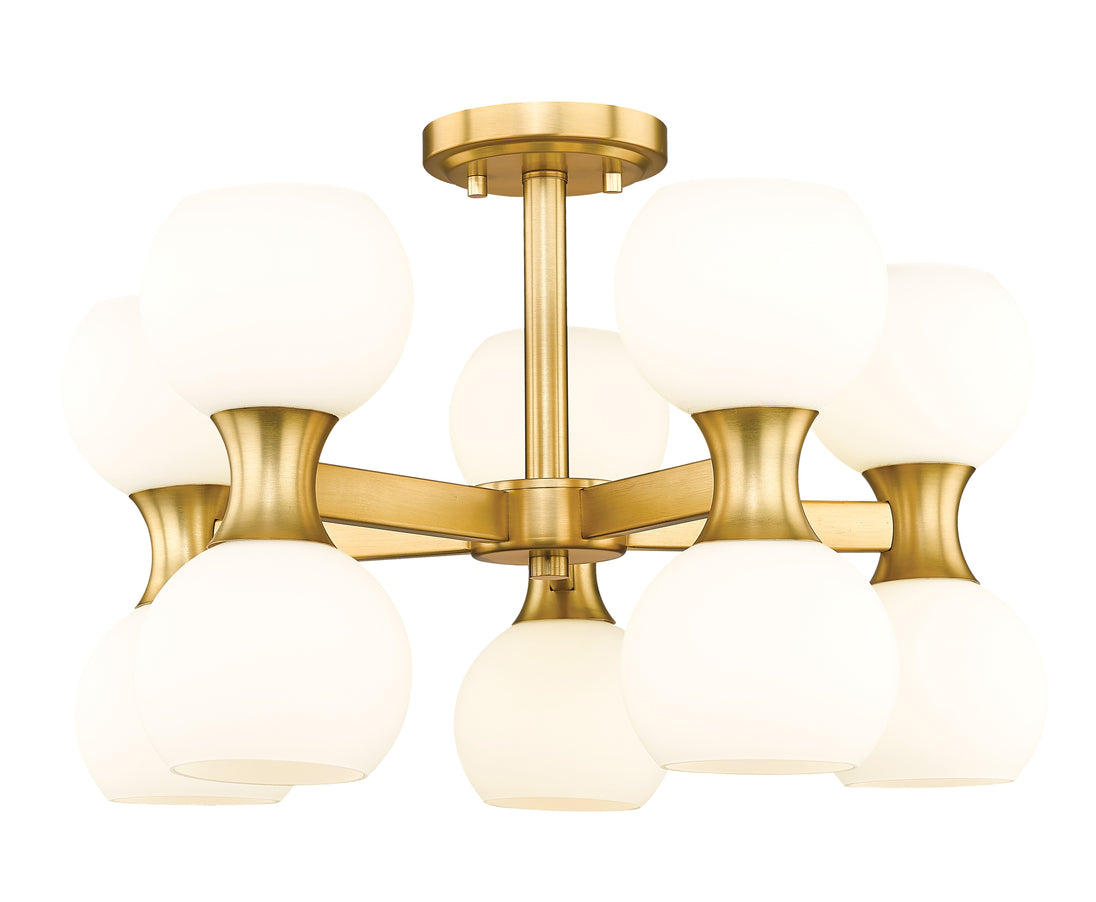 Bring Mid-Century Modern aesthetics into the fold with a light fixture that embraces personality full-throttle. This semi-flush mount ceiling light from the Artemis collection invokes transitional and modern elements with a cool modern gold finish steel spoke frame and gently curved shapes that cuddle matte opal glass globe shades. Downlighting and uplighting equal ambient illumination perfect for a kitchen, dining space, or entryway.