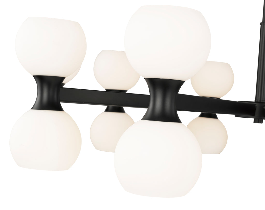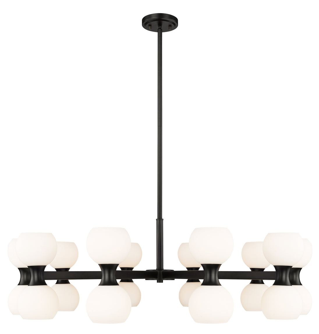 Striking finish contrasts embellish the festive look of a light fixture with endless personality and timeless style. Choose this Mid-Century Modern 20-light chandelier from the Artemis collection to make a signature design statement in a spacious living area in need of strong ambient lighting. Delicate matte opal glass shades attach to a linear matte black finish steel frame, dressed up with alluring curved elements and packaged to provide both fashion and function.