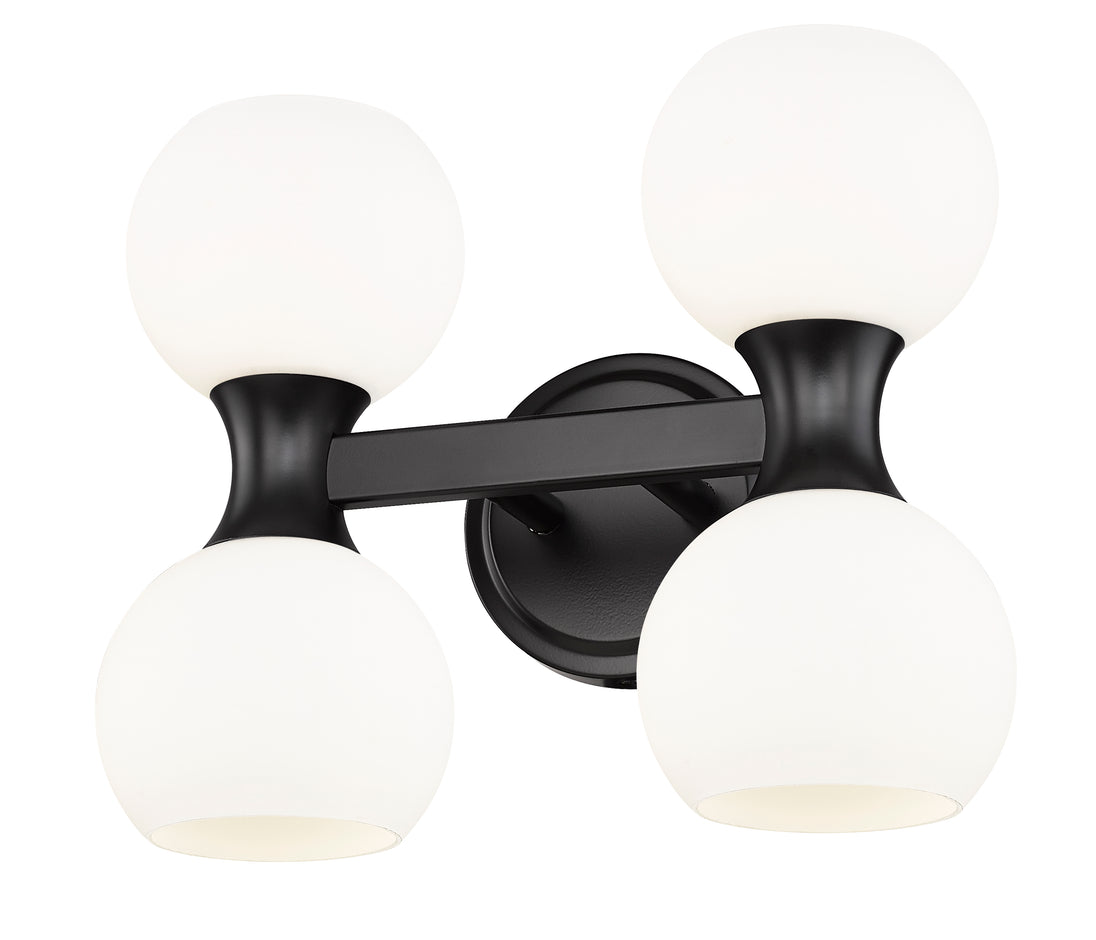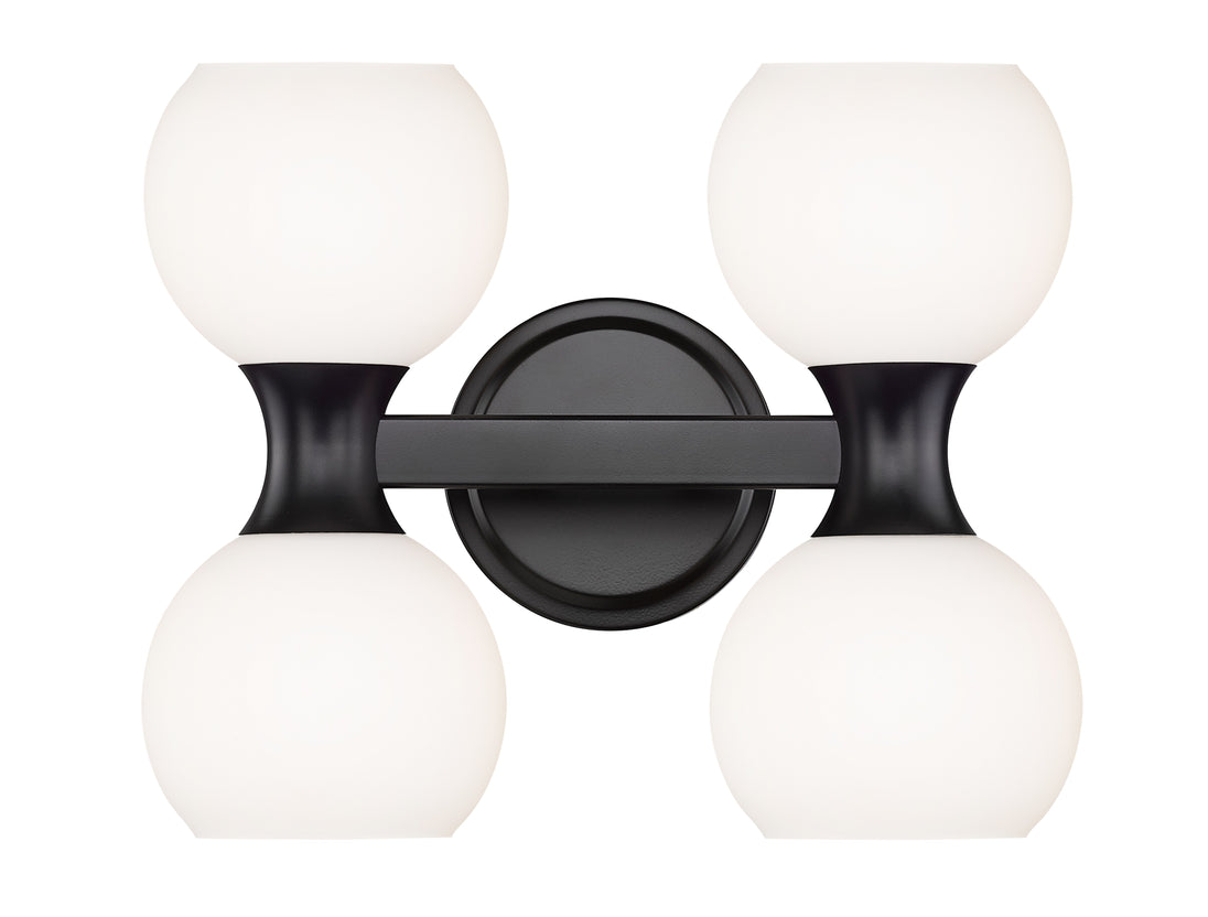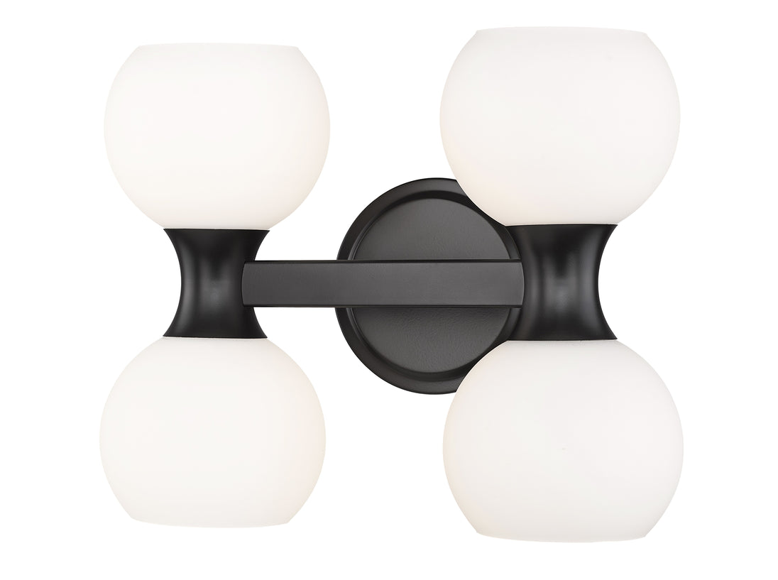 Freshly inspired with a contrasting finish palette and festive aesthetic, this light fixture is a solid choice for a bath or living space in need of strong ambient lighting. From the Artemis collection comes a four-light vanity light with design creds that boost the tasteful look of an ensuite or guest bath. A Mid-Century motif is updated to reflect contemporary flair with a shapely matte black finish steel frame and wall mount and delicate matte opal glass shades, all created to attract attention from floor to ceiling.