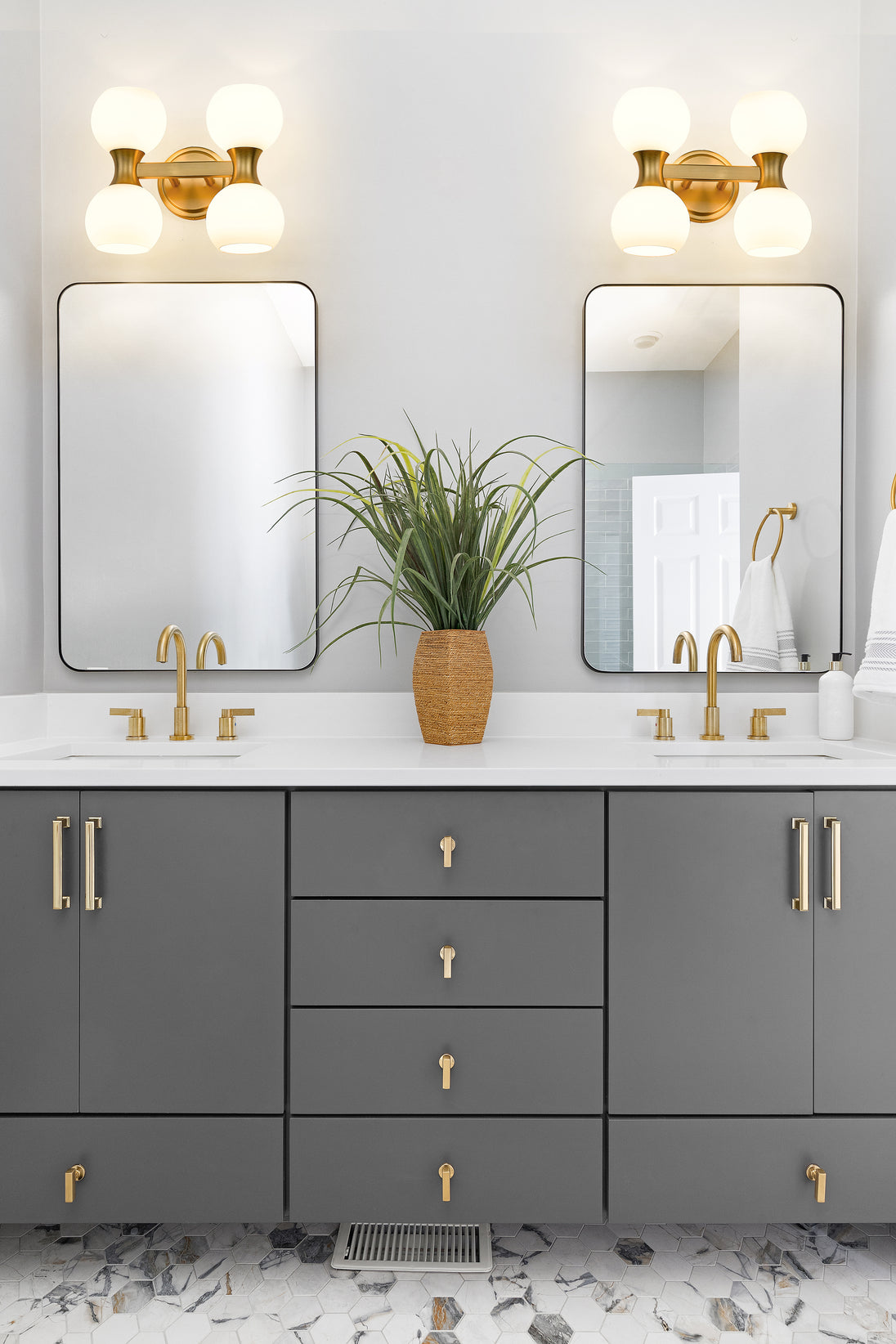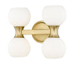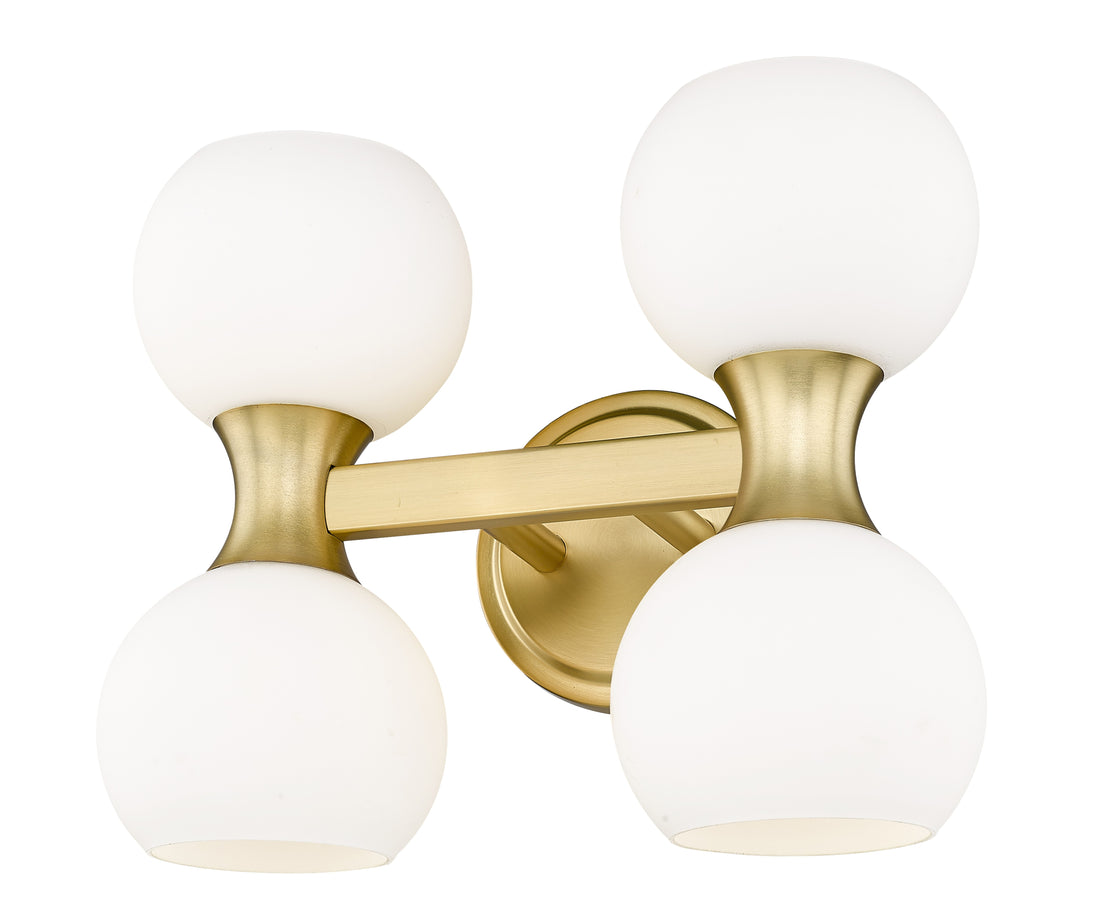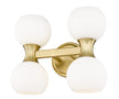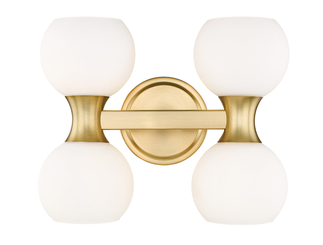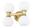 Bring timeless elegance and style to a bath or living space with a light fixture delivering fashion and function. From the Artemis collection comes a four-light vanity light with design creds that boost the tasteful look of an ensuite or guest bath. A Mid-Century motif is updated to reflect contemporary flair with a shapely modern gold finish steel frame and wall mount and delicate matte opal glass shades, all created to attract attention from floor to ceiling.