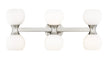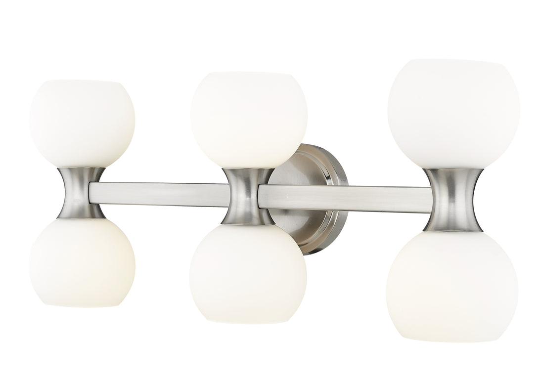 Symmetry and balance juxtaposed with subtle artful curves create an unforgettable Mid-Century Modern aesthetic in this six-light vanity light from the Artemis collection, a perfect choice for a casual bath space with upscale taste. Follow the delightful convex shapes of a chic brushed nickel finish steel frame and the delicate flavor of matte opal glass globe shades. Delivering both uplighting and downlighting, this vanity light brings solid illumination to an ensuite or guest bathroom.