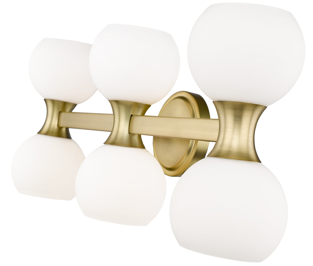 An Art Deco flavor colors the celebrated Mid-Century Modern motif of a light fixture that transforms any modern or transitional bath space. Follow the delightful convex shapes of a modern gold finish steel frame and the delicate flavor of matte opal glass globe shades in this six-light vanity light from the Artemis collection. Delivering both uplighting and downlighting, this vanity light brings solid illumination to an ensuite or guest bathroom.