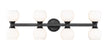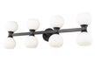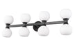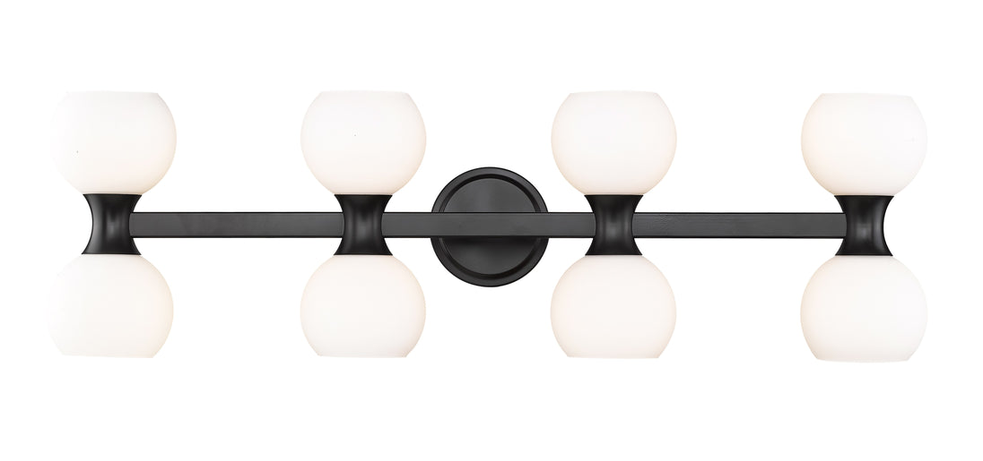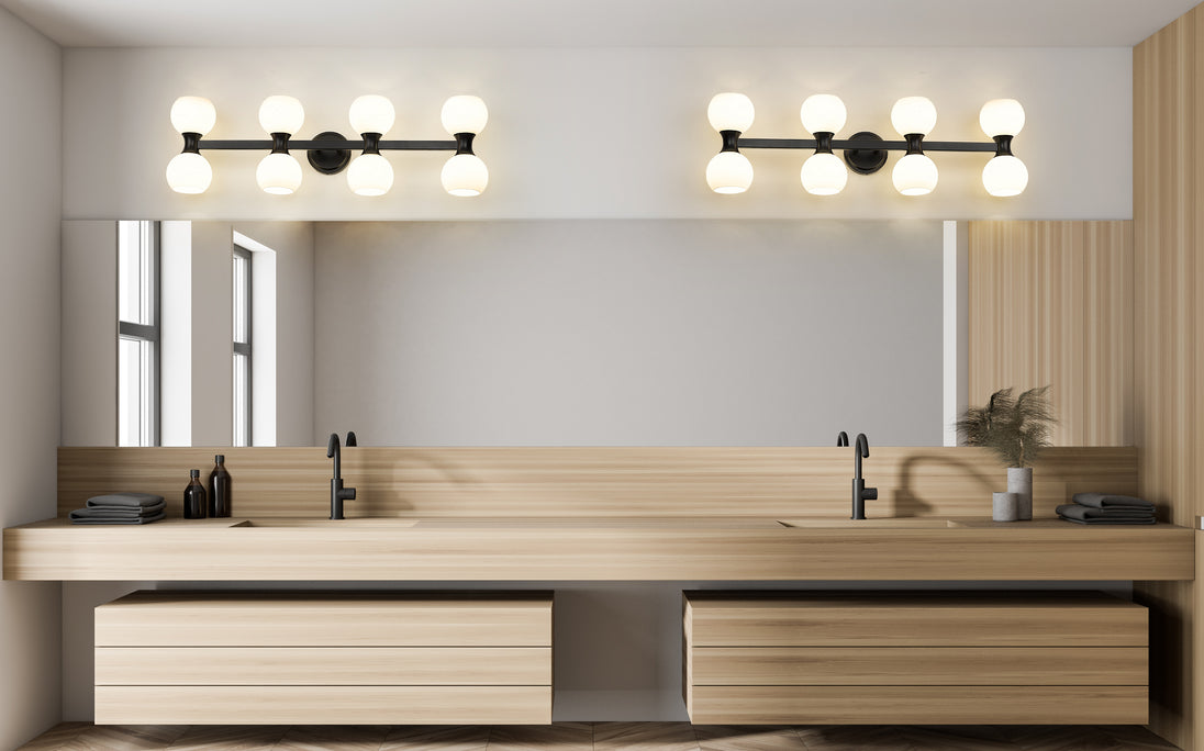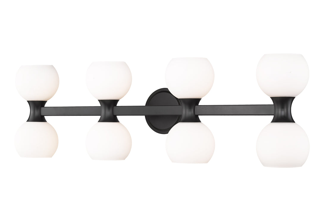 Bold contrasting finishes make the most of both Mid-Century Modern style and Art Deco attitude in a bathroom vanity light with a sense of sophistication and strong ambient lighting. This eight-light vanity light from the Artemis collection checks all the boxes for a compelling design and convenient uplighting and downlighting infused by matte opal glass open globes. Linear sensibility joins alluring curves in a dynamic matte black finish steel frame, wrapping up a host of decadent features.